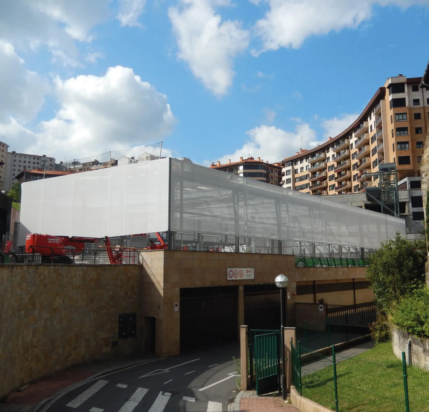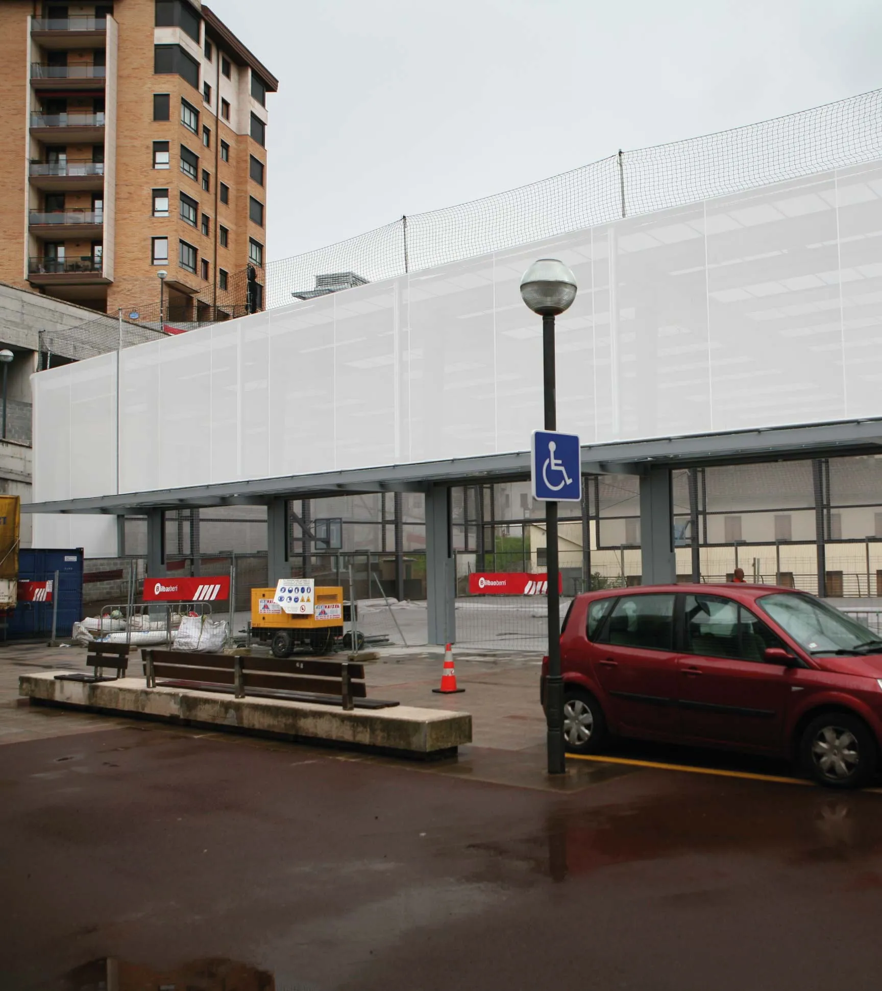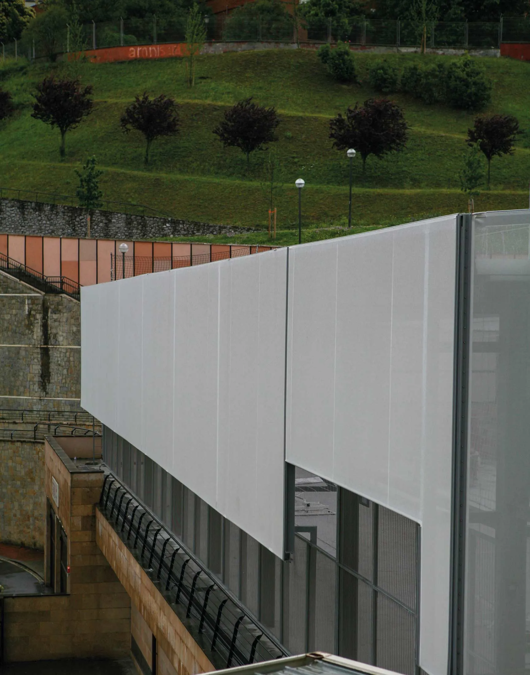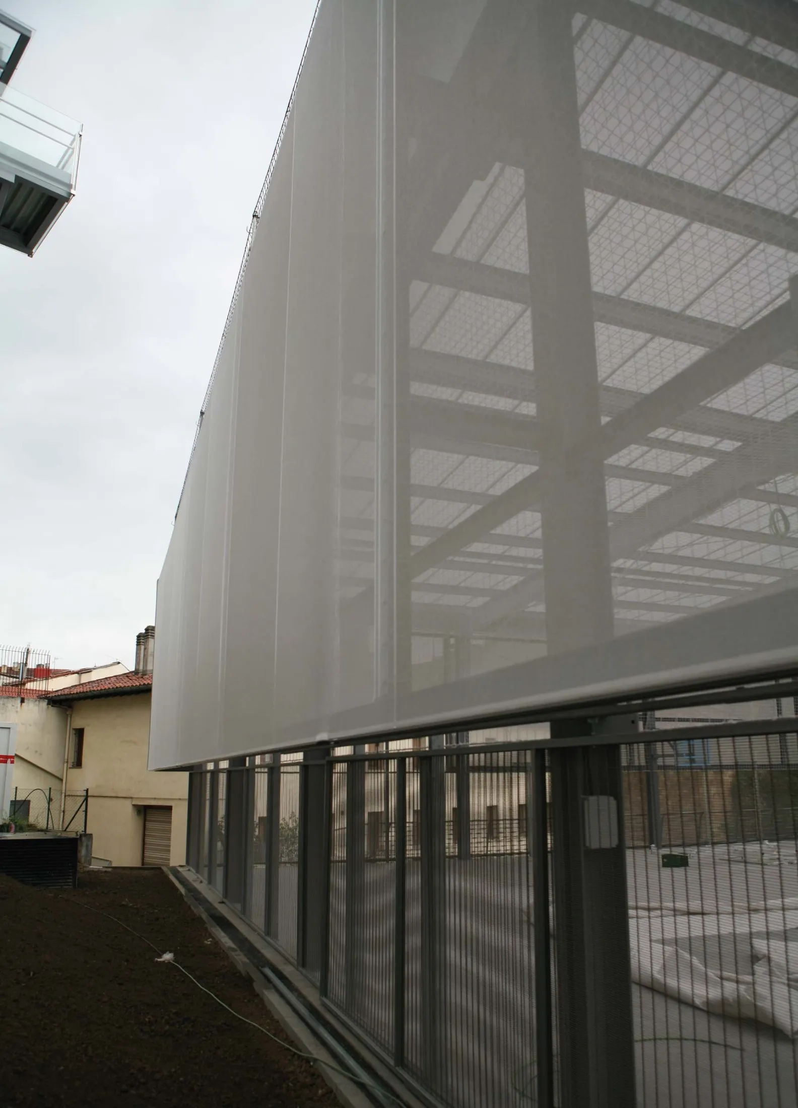 Covering of the whole façade of an outdoor sports court, located in the centre of the Encarnacion's square. By means of white FT 381 fabric. Fixed at both the upper and lower perimeter by means of lacquered double headline profile, and fixed to the structure vertically by means of strips of canvas tied down with cord (to the curves of the façade). Covering an approximate surface area of 720 m².