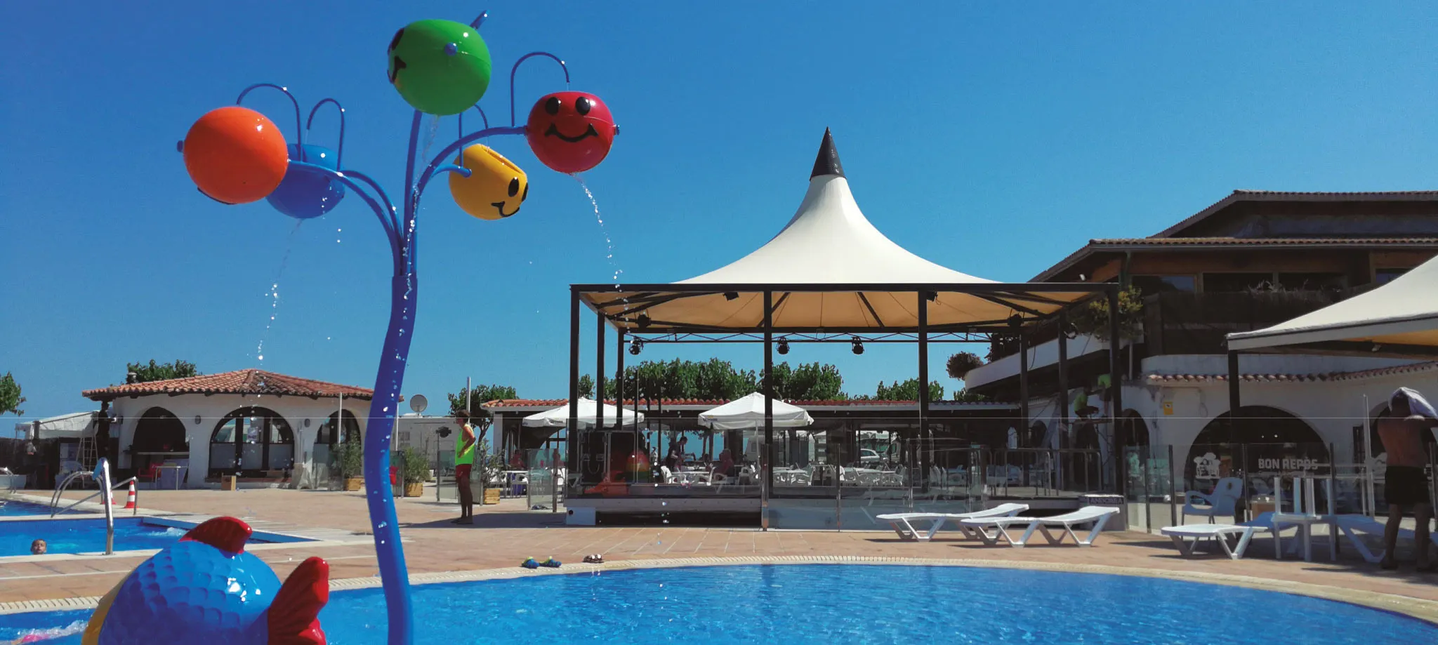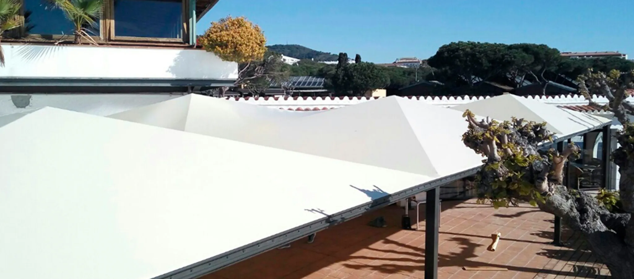 Project at Bon Repos Camp Site, at Santa Susanna, on the Costa del Maresme. A front-line beach camp site which has been in operation for more than 50 years. A marquee has been installed adjoining the building with the objective of widening the terrace space, protecting from adverse weather conditions. The metallic structure is a triangular floor with interior panels. The membrane has been carried out with a PVC 502 tarpaulin system under tension.