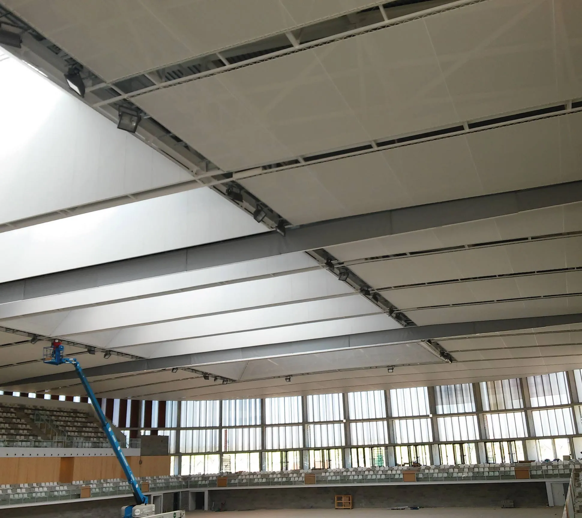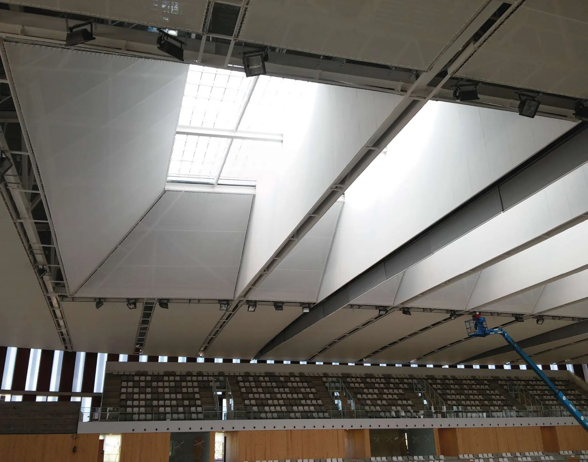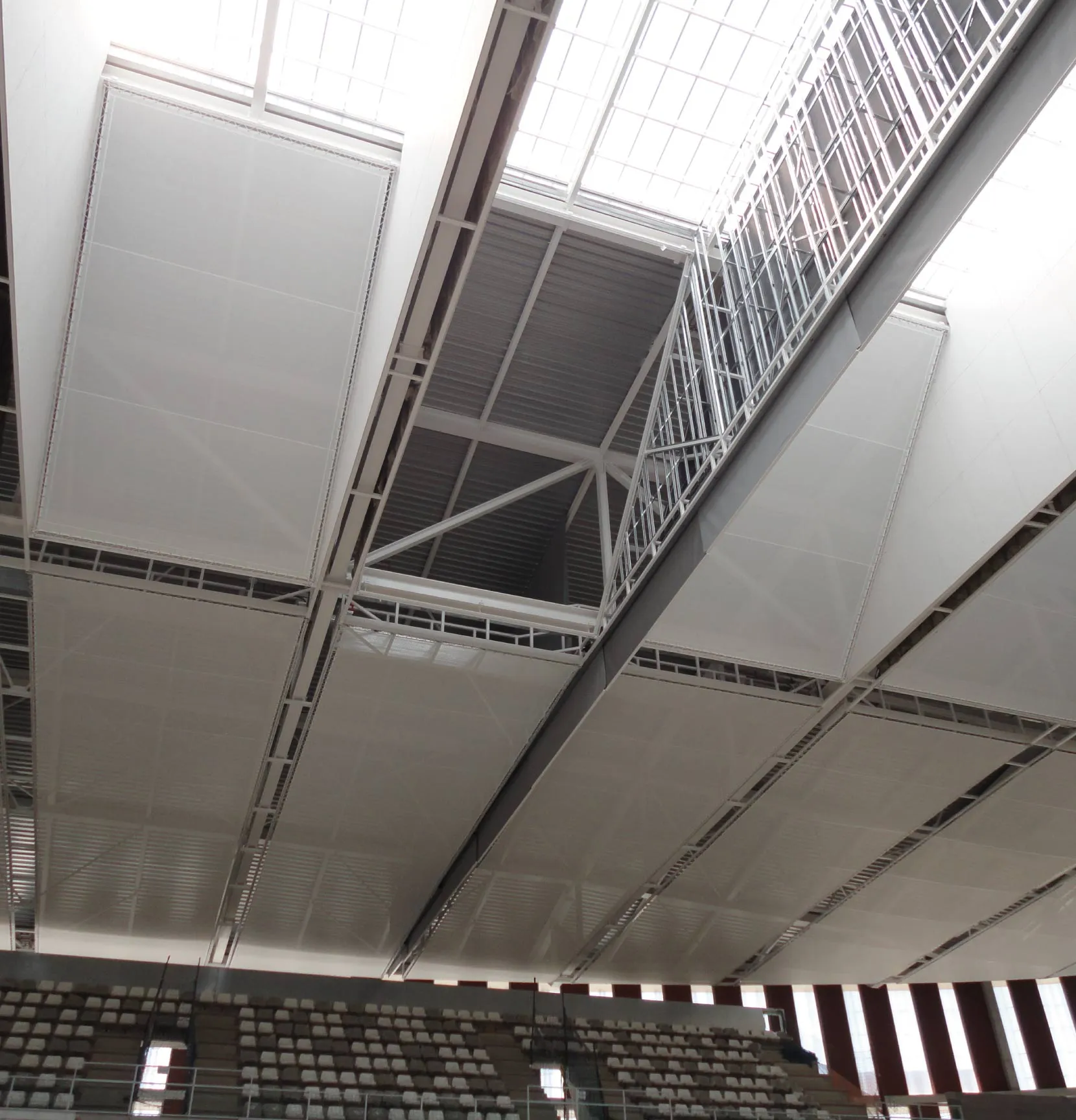 The new Camp Clar sports stadium was built to hold the 18th Mediterranean Games. This sports arena has capacity for 5000 people, and a textile false ceiling has been installed under the metallic structure of the cover. The membrane is fractioned into strips approximately 6 m wide, following the modulation of the metallic substructure. The surface area of 4494 m² is composed of 44 tarpaulins.