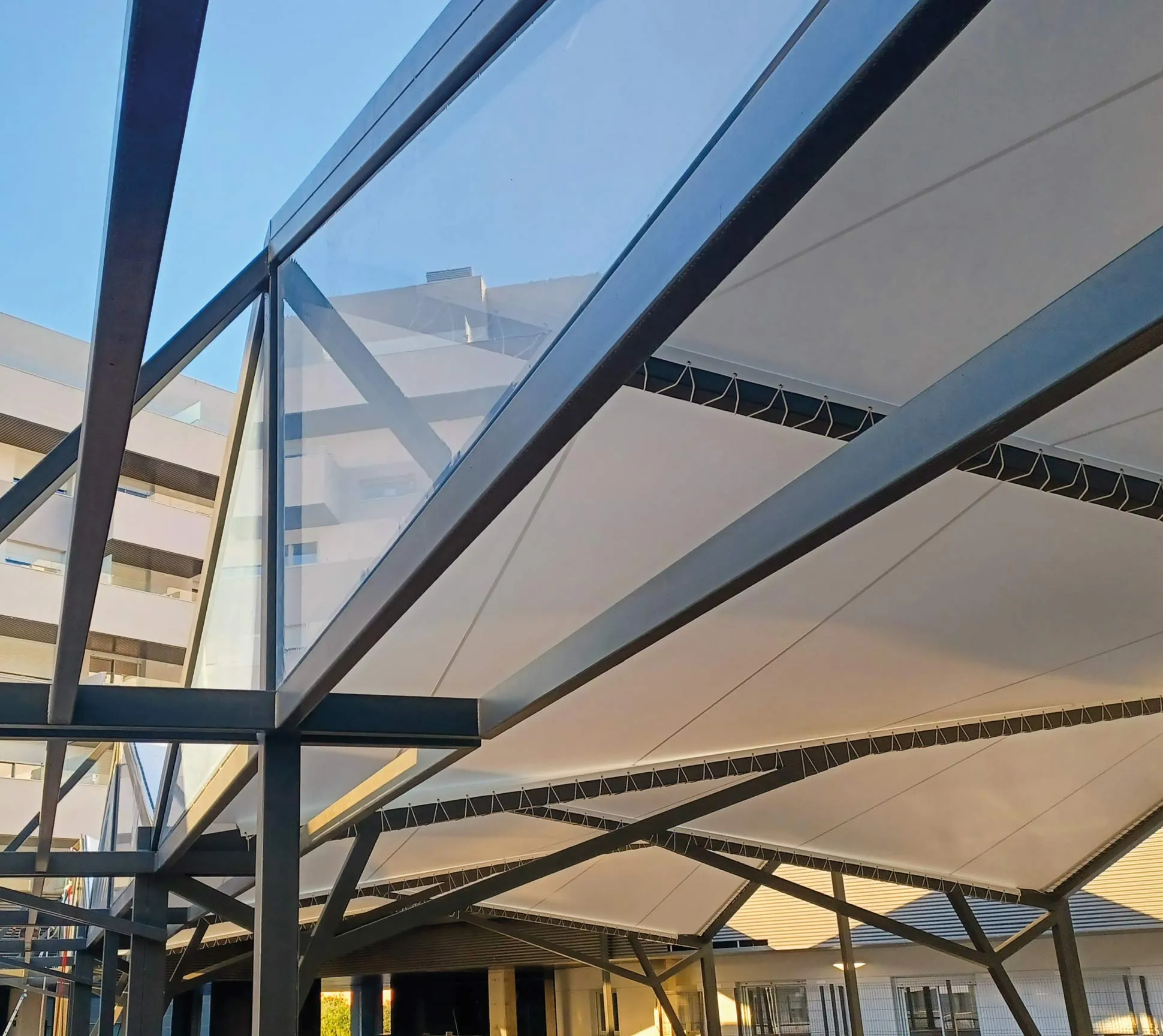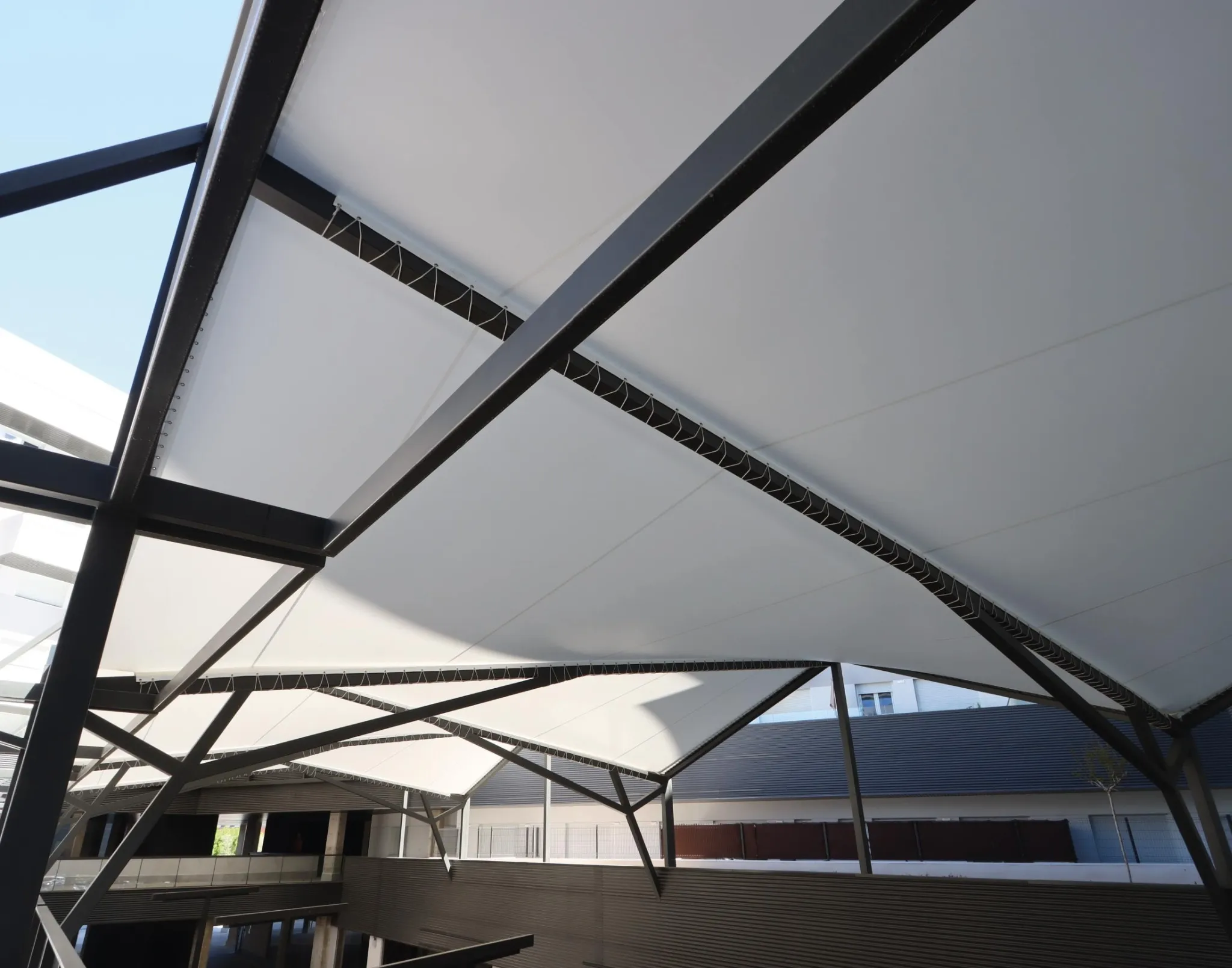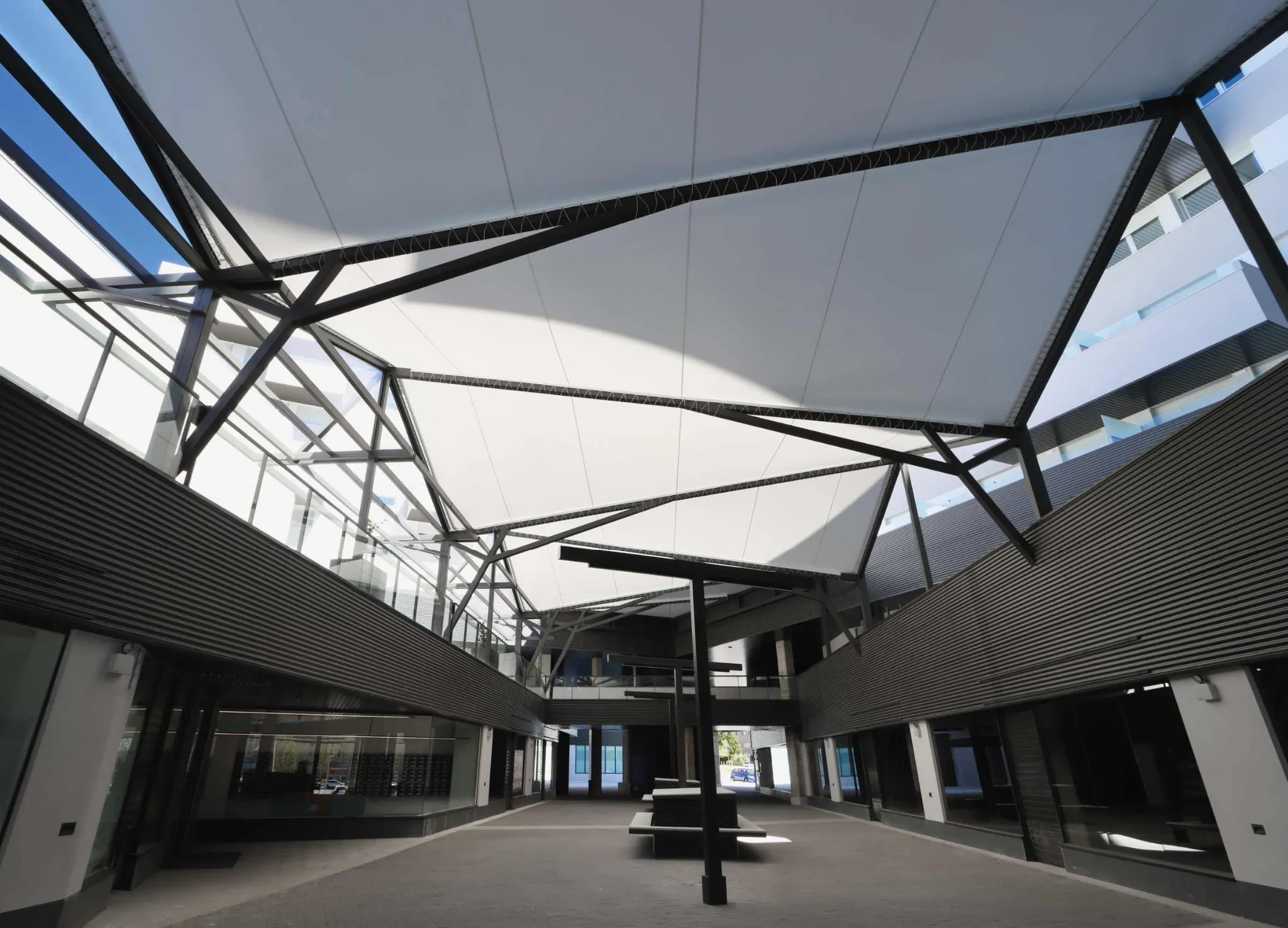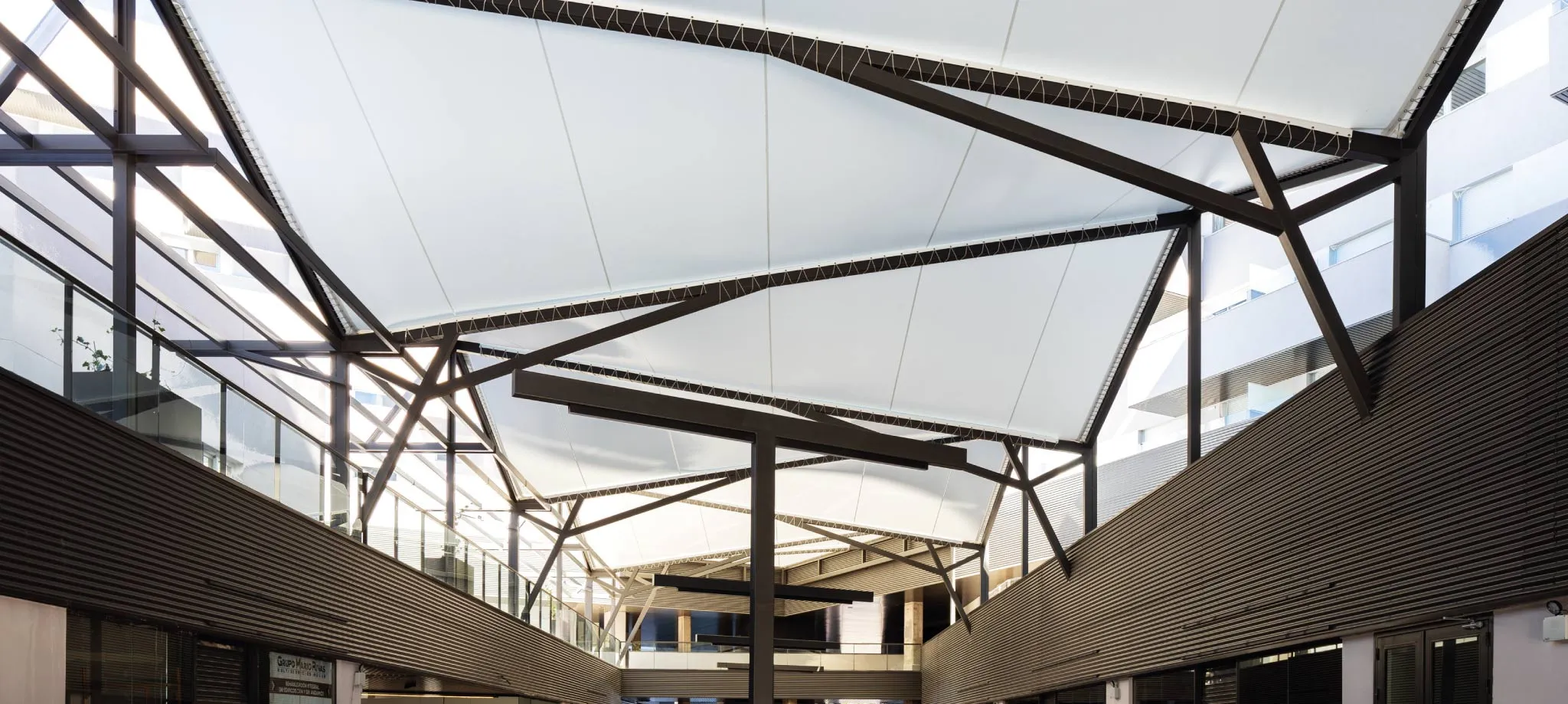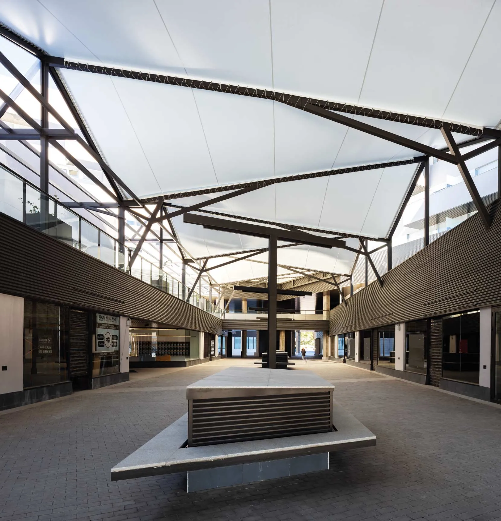 This project consists of creating a textile roof for the commercial gallery area of the complex. The geometry of this roofing design extends and adapts to the contours of the façades of the adjacent buildings, according to the plans received.