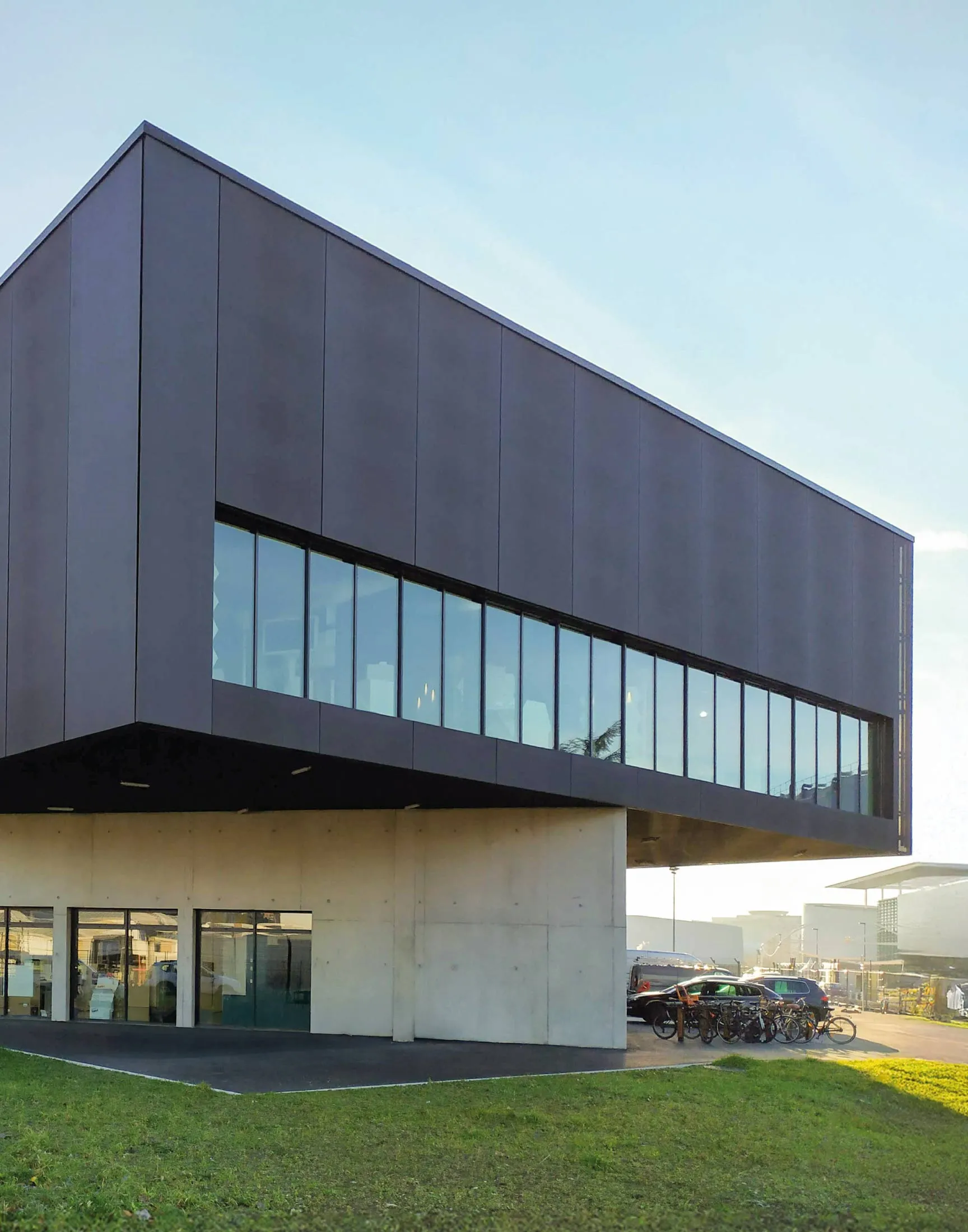 The top floor façade of this building is composed of i-tensing panels coated with Frontside View 381 membrane in black to contrast with the lower floor which has a natural concrete finish.