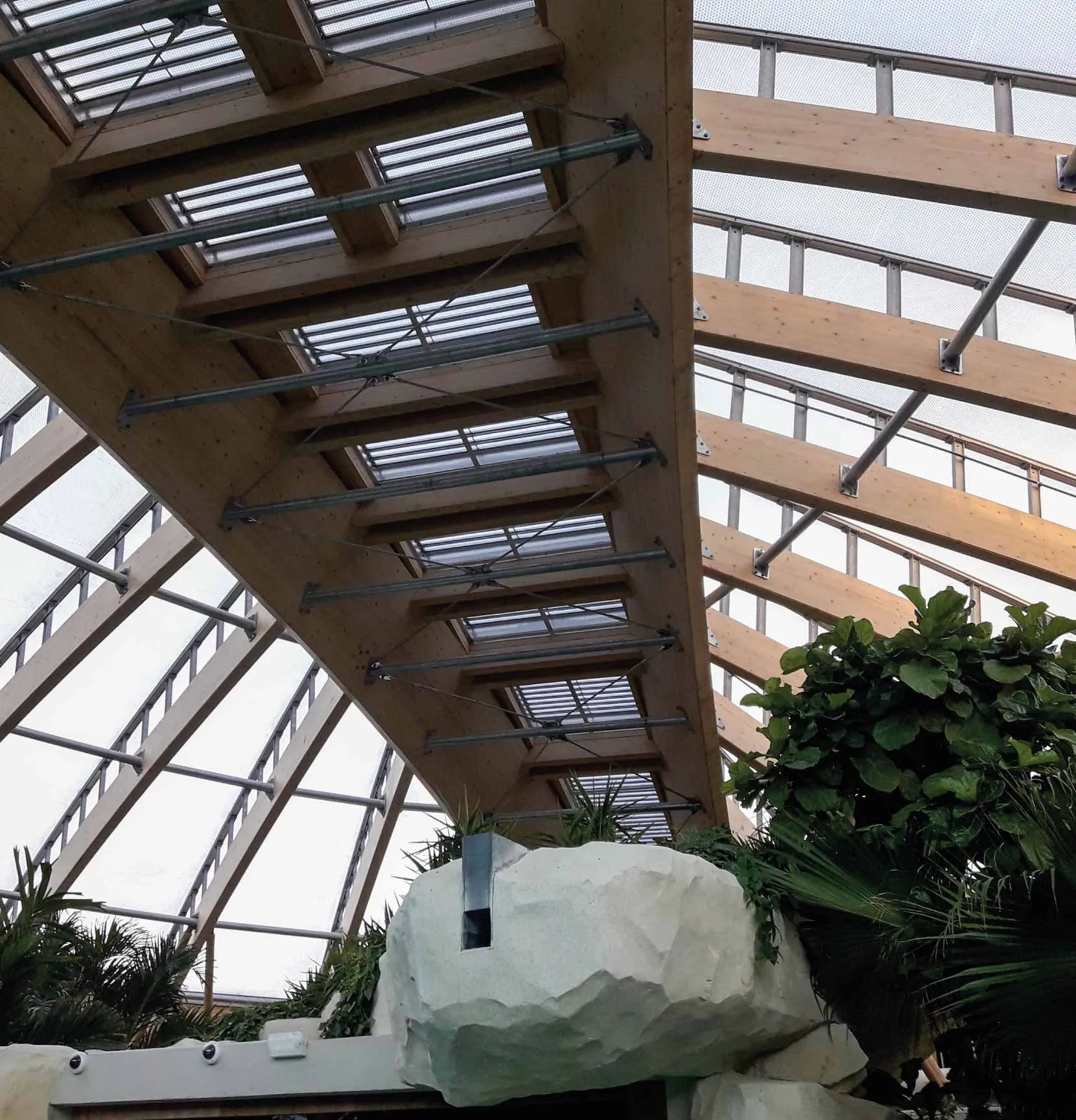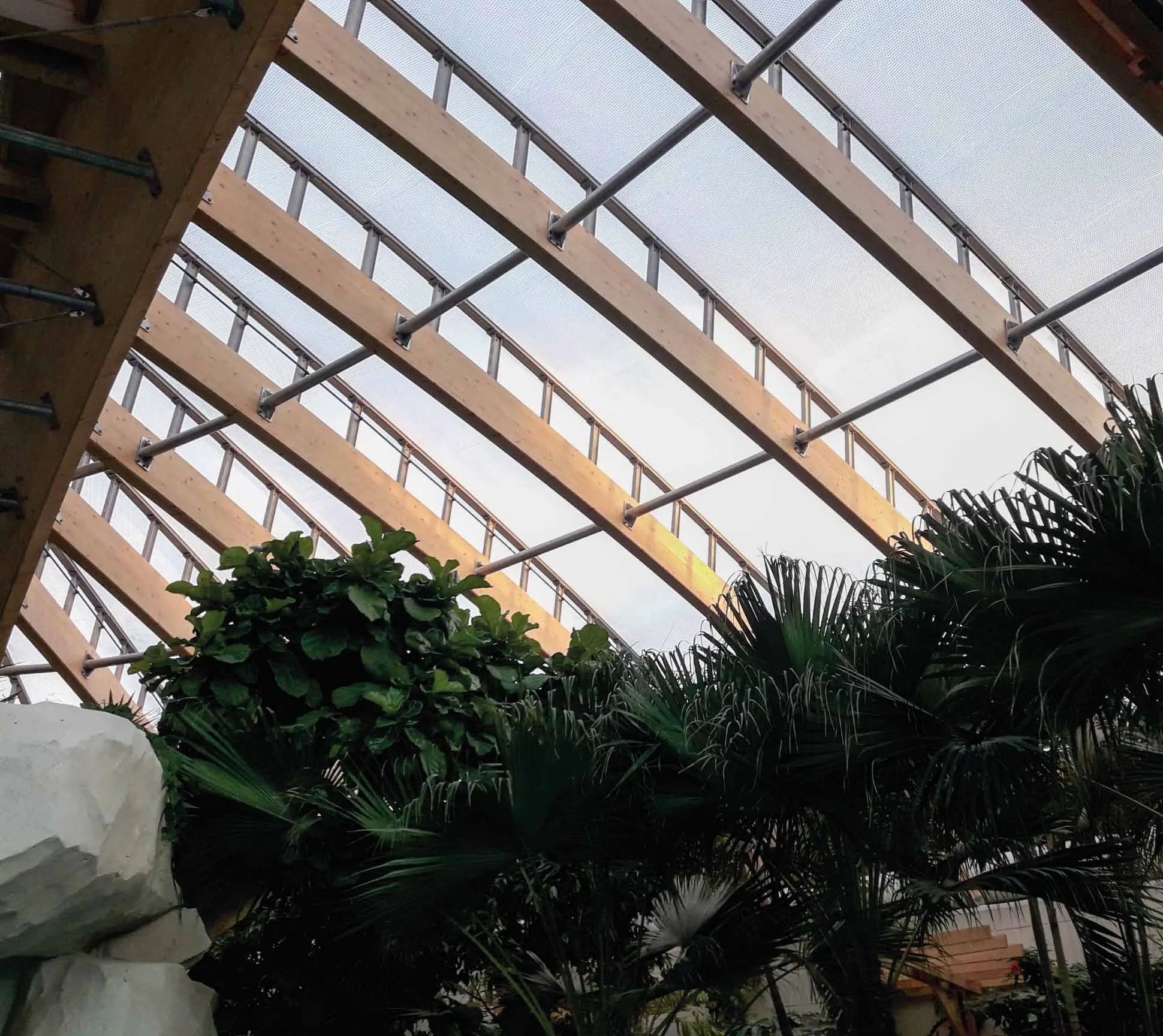 Together with the wooden structure and the tropical decoration of the interior, the roof in ETFE cushions takes centre stage with its transparency, letting in light to harmonise the space's ambiance.