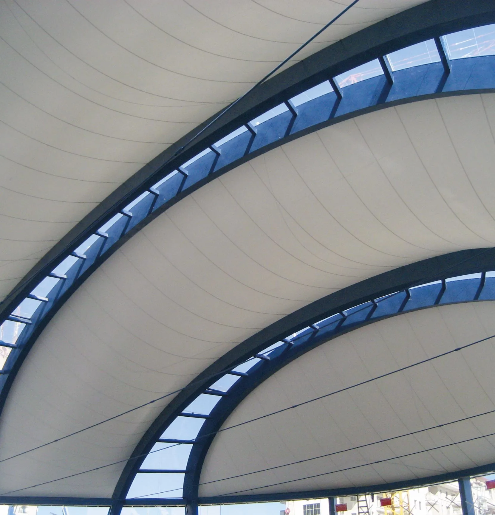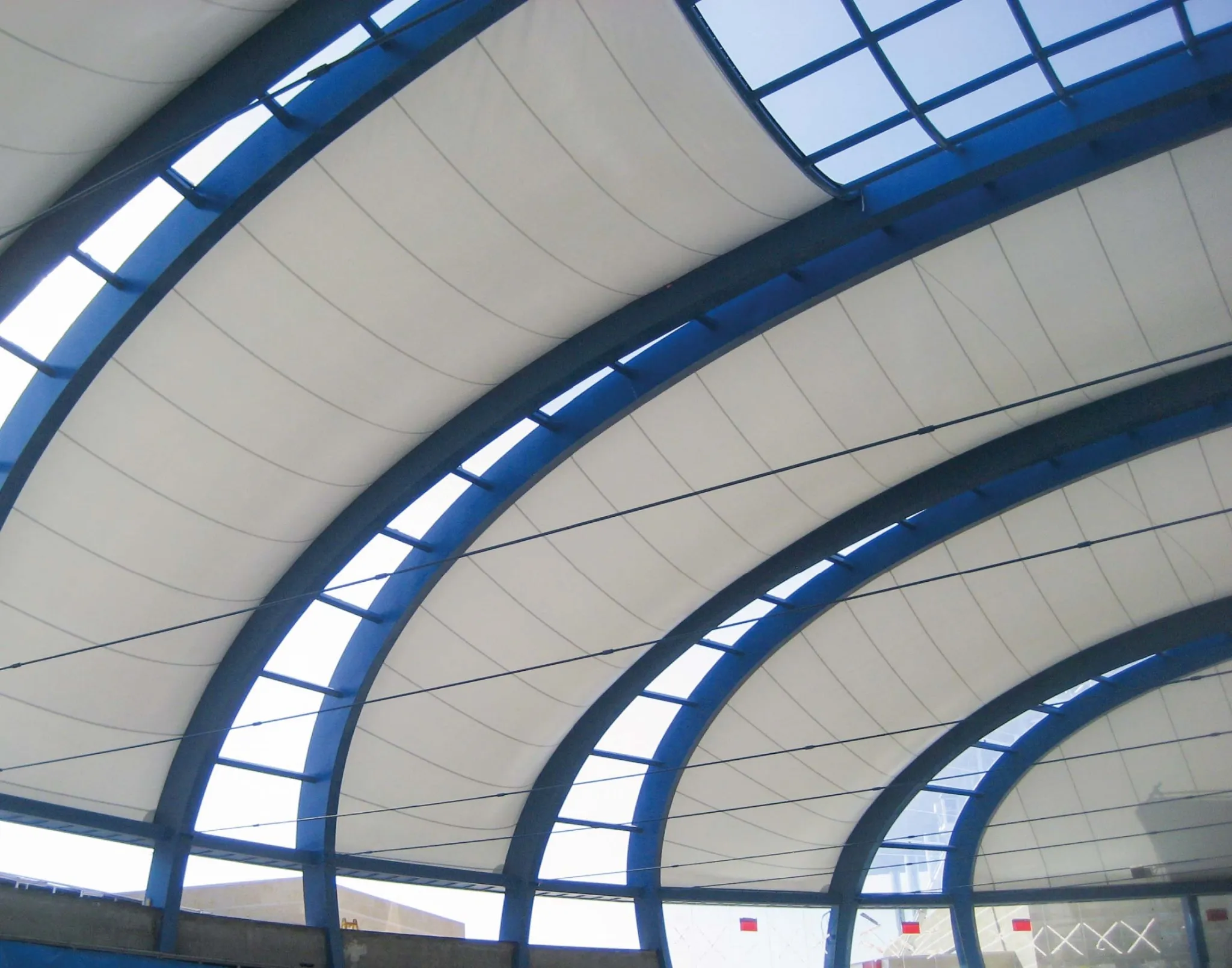 The V type fabric in the translucent section is the most resistant. The transparent areas were made with a monolayer system of ETFE reinforced with stainless steel cables. A covering that offers brightness, protection and natural ventilation.