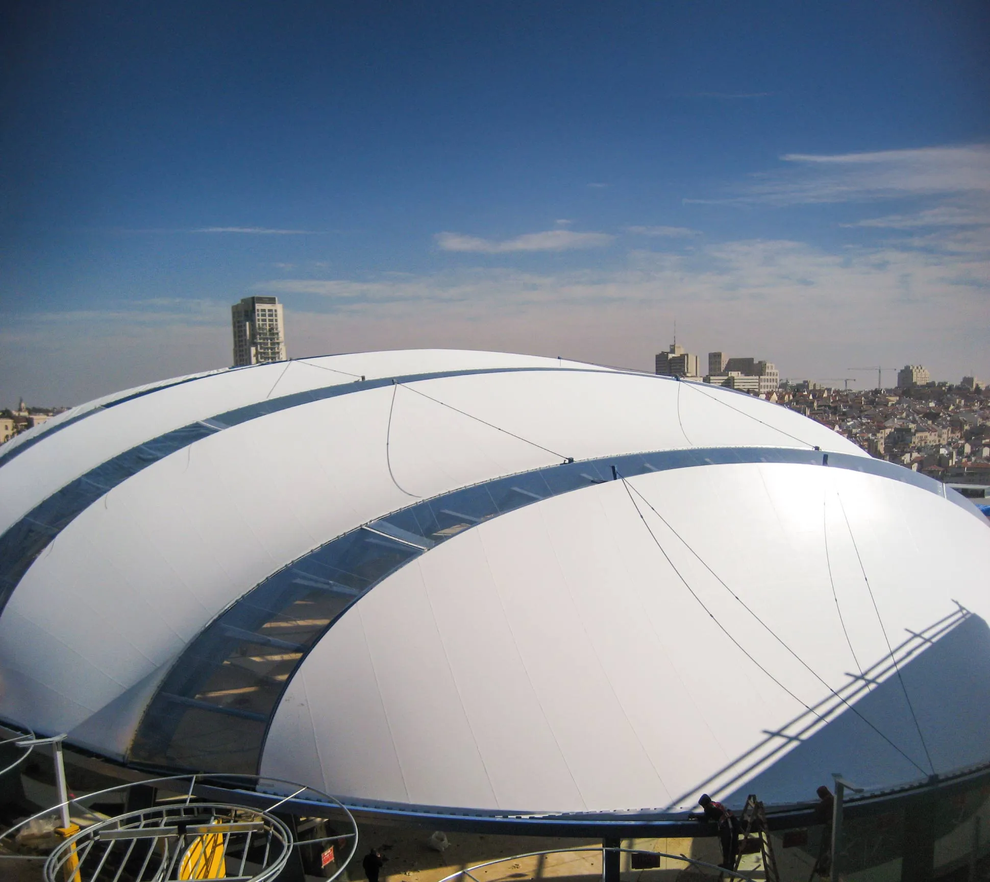 Cinema city in Jerusalem, is the largest entertainment complex and cultural centre of this Israeli city. With an area of 20,000 metres squared, with 19 screening rooms and an inner hall. The covering, the very first that includes a system of transparent ETFE foils, combines 6 translucent fabric membranes and 5 transparent sheet membranes.