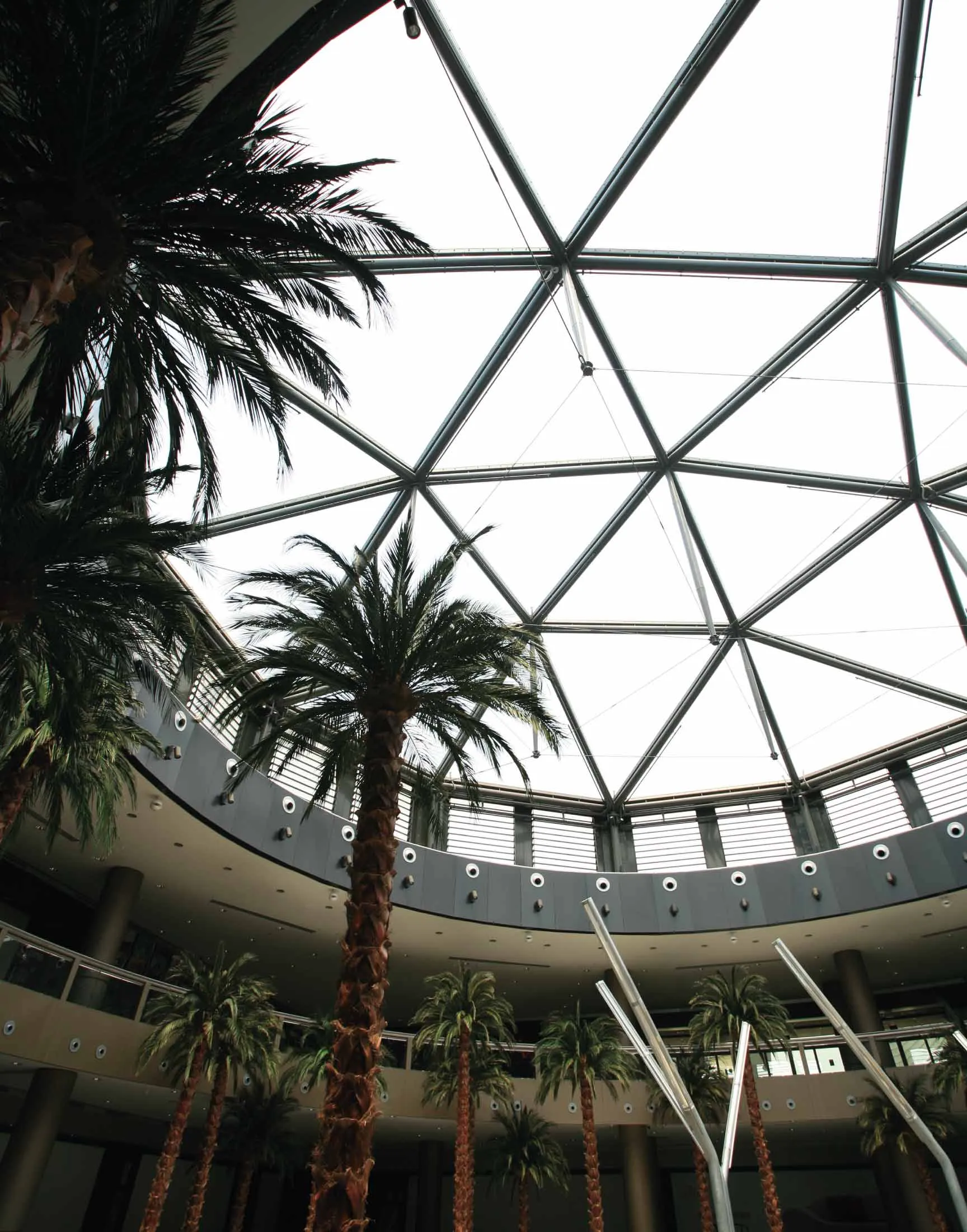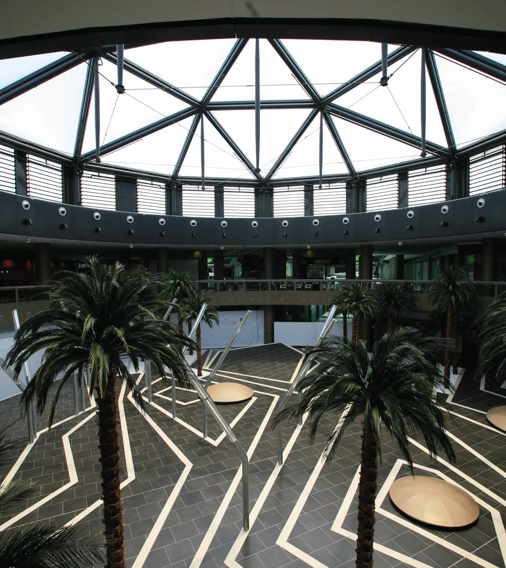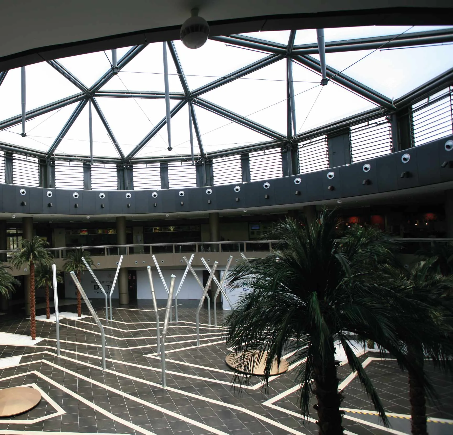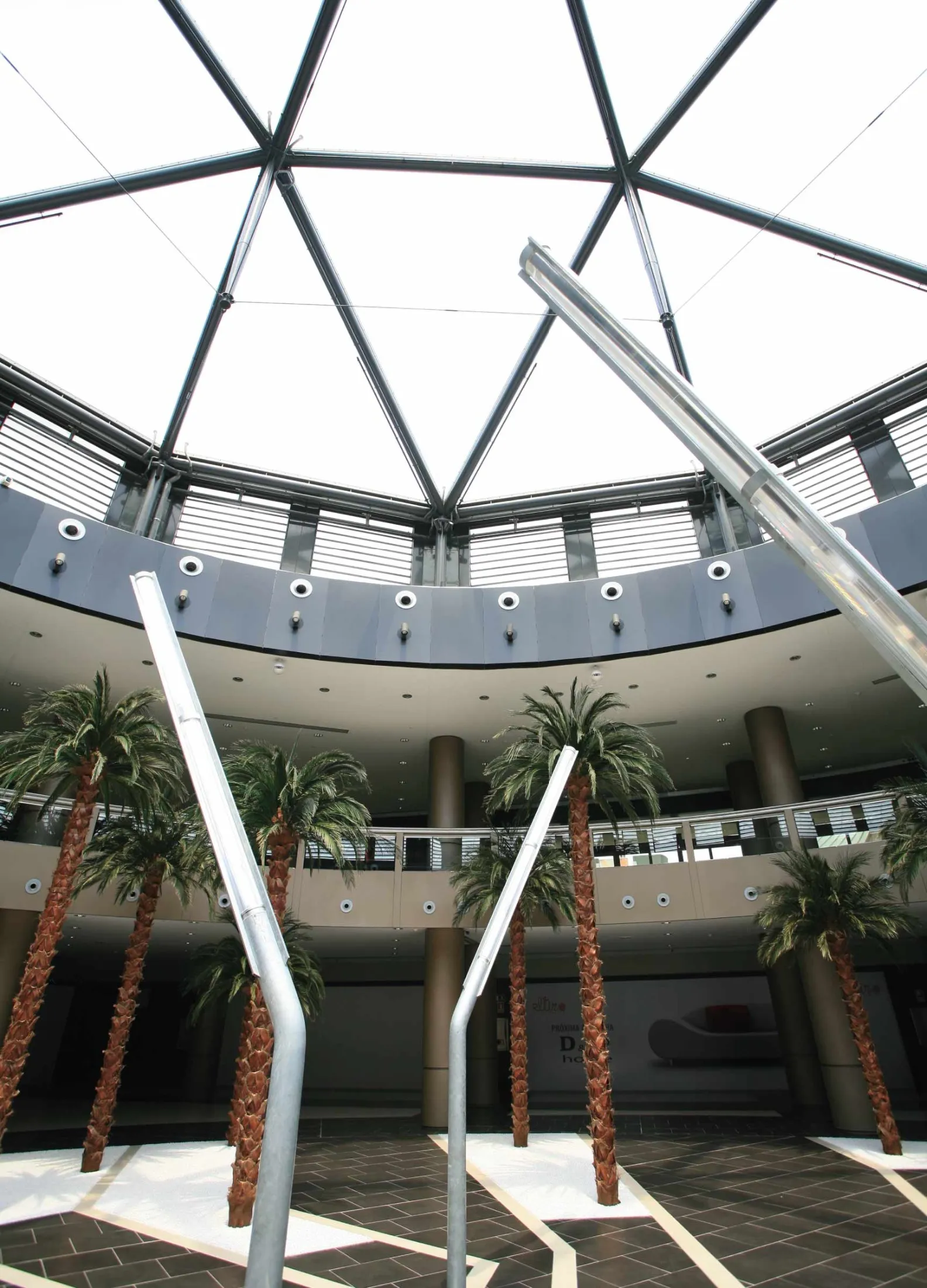 In the great square where the two main axes of the commercial space converge the dome of more than 25 m diameter appears. The spectacular geometry of the metal structure decomposes the skylight in 24 triangular cushions. The double-sheet printed cushions protect from solar radiation, while having a very high visible light pass through.