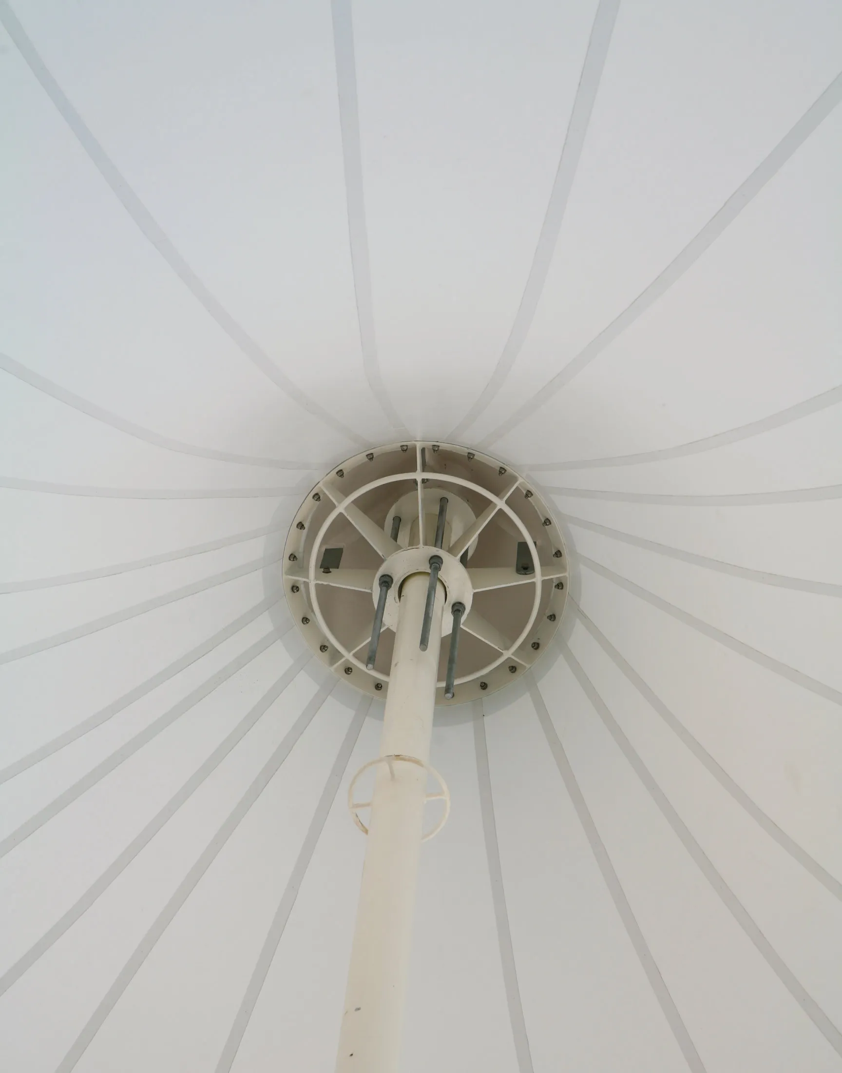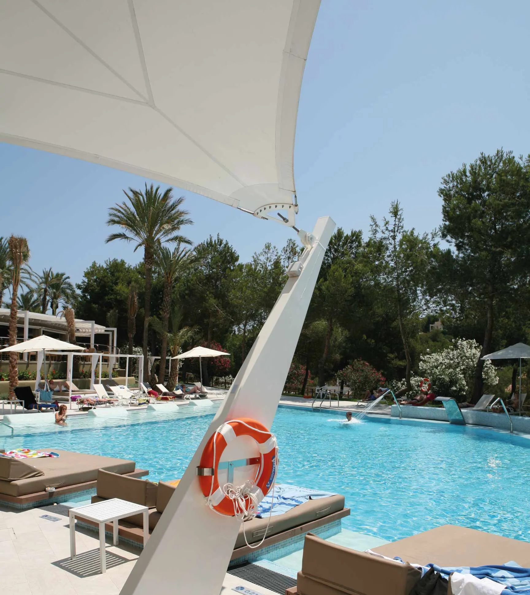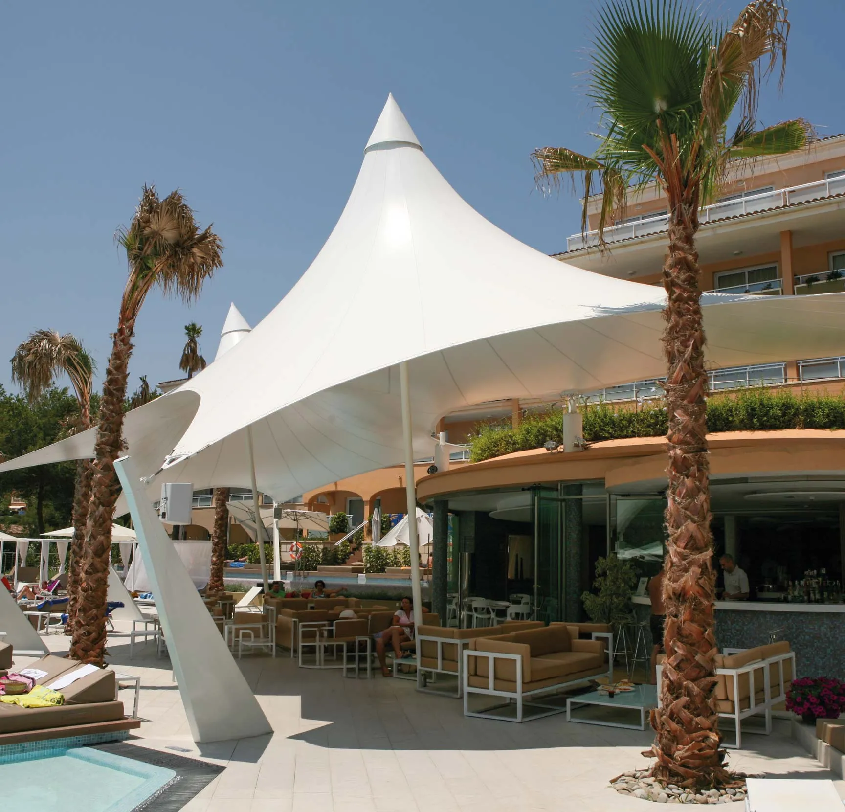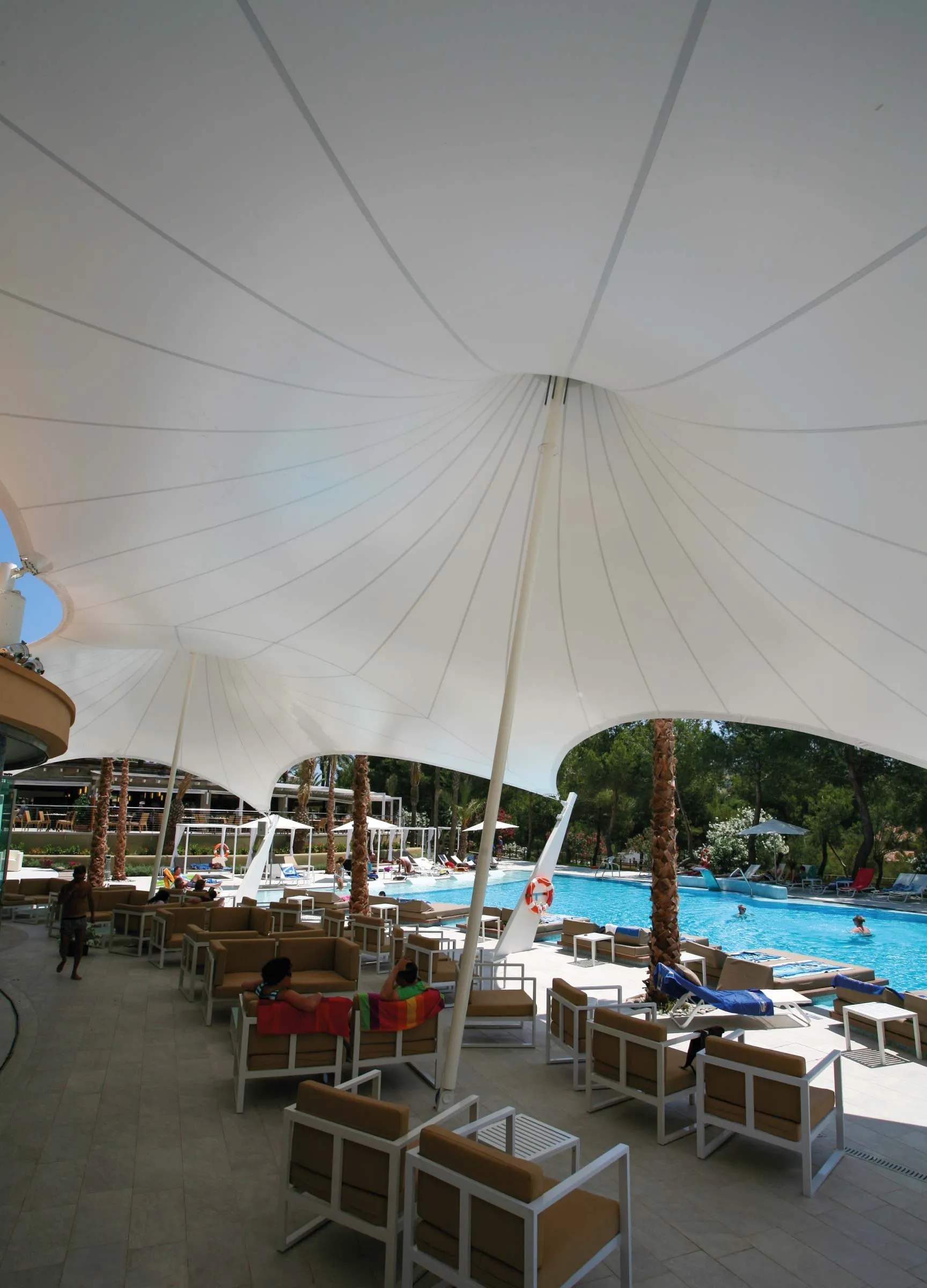 One of the refurbished zones is the Sunset bar area, where a tensile roof was chosen to cover the new “chill out” atmosphere for guests. The membrane is fastened onto the building façade, and is designed towards thepool, where it is attached to the perimeter pillars.
