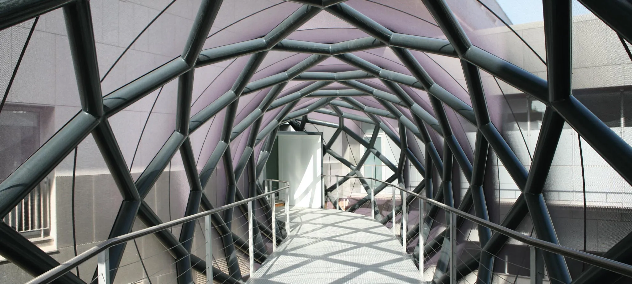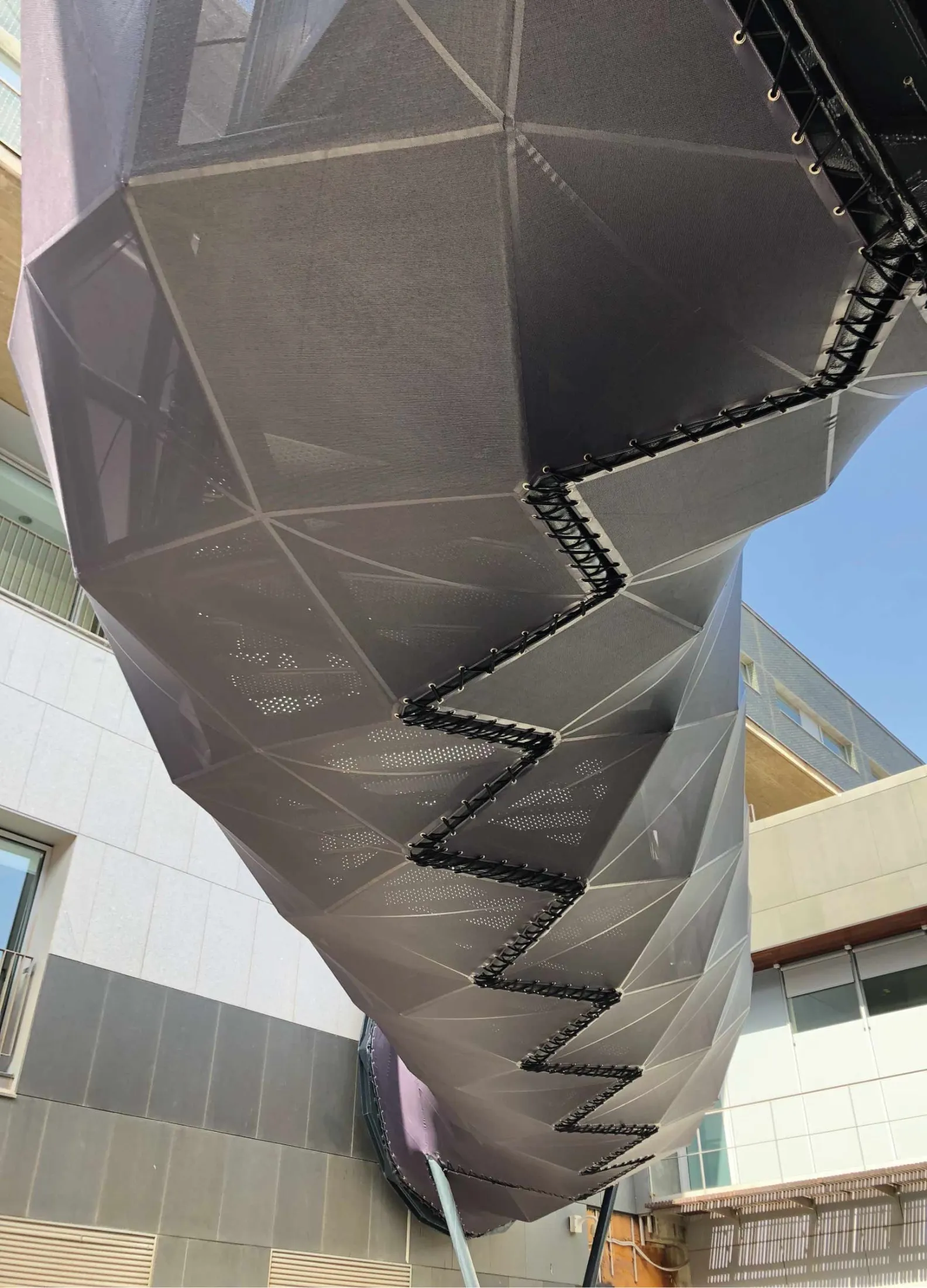 It consists on a large metal structure of bars in a spiral tube shape that connects the two buildings and is covered by a perforated membrane.