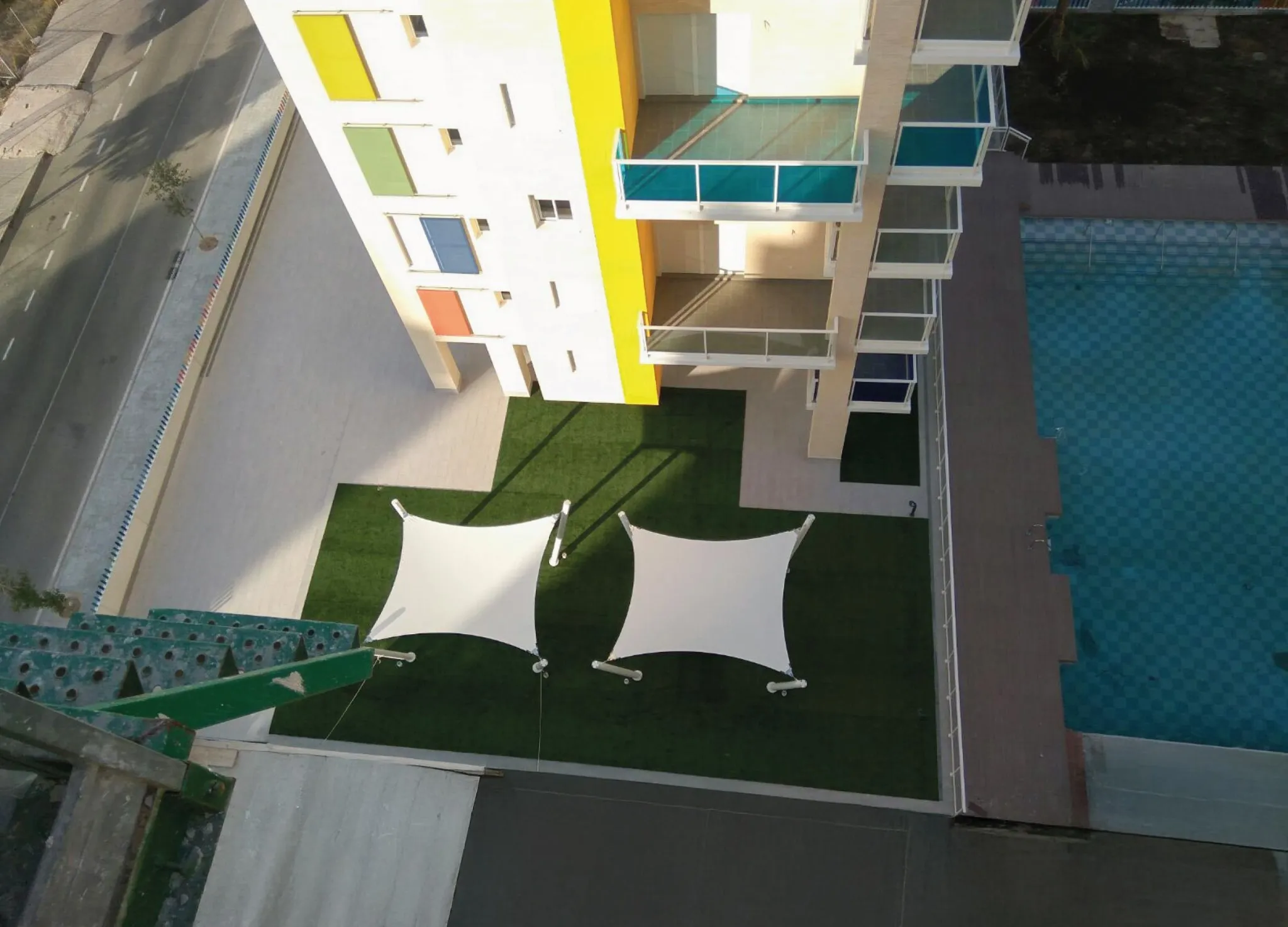 This project aims to create sun protection for the windows of the building. On the one hand, by means of the frames tensioned with the i-Tensing system, the aim is to create a mobile system of panels which allows movement to both protect from and allow the entry of light, depending on the need at any time. On the other hand, the tensioned strips of tarpaulin create a private space, through which light enters. Finally, the tensioned sails generate a relaxed space for resting in the shade.