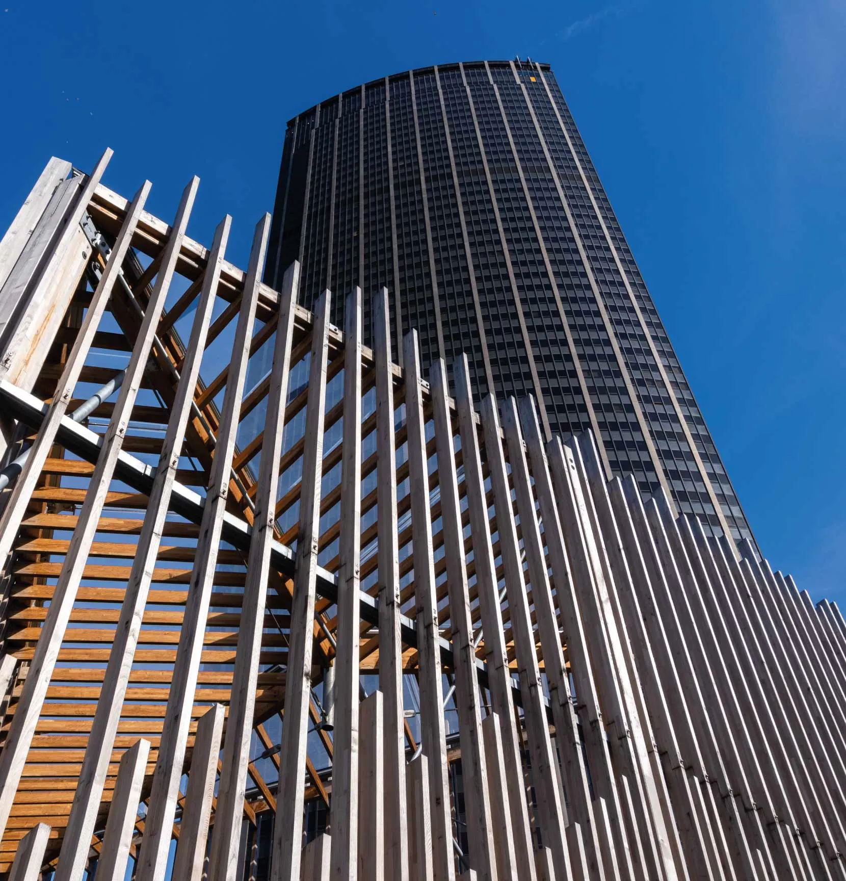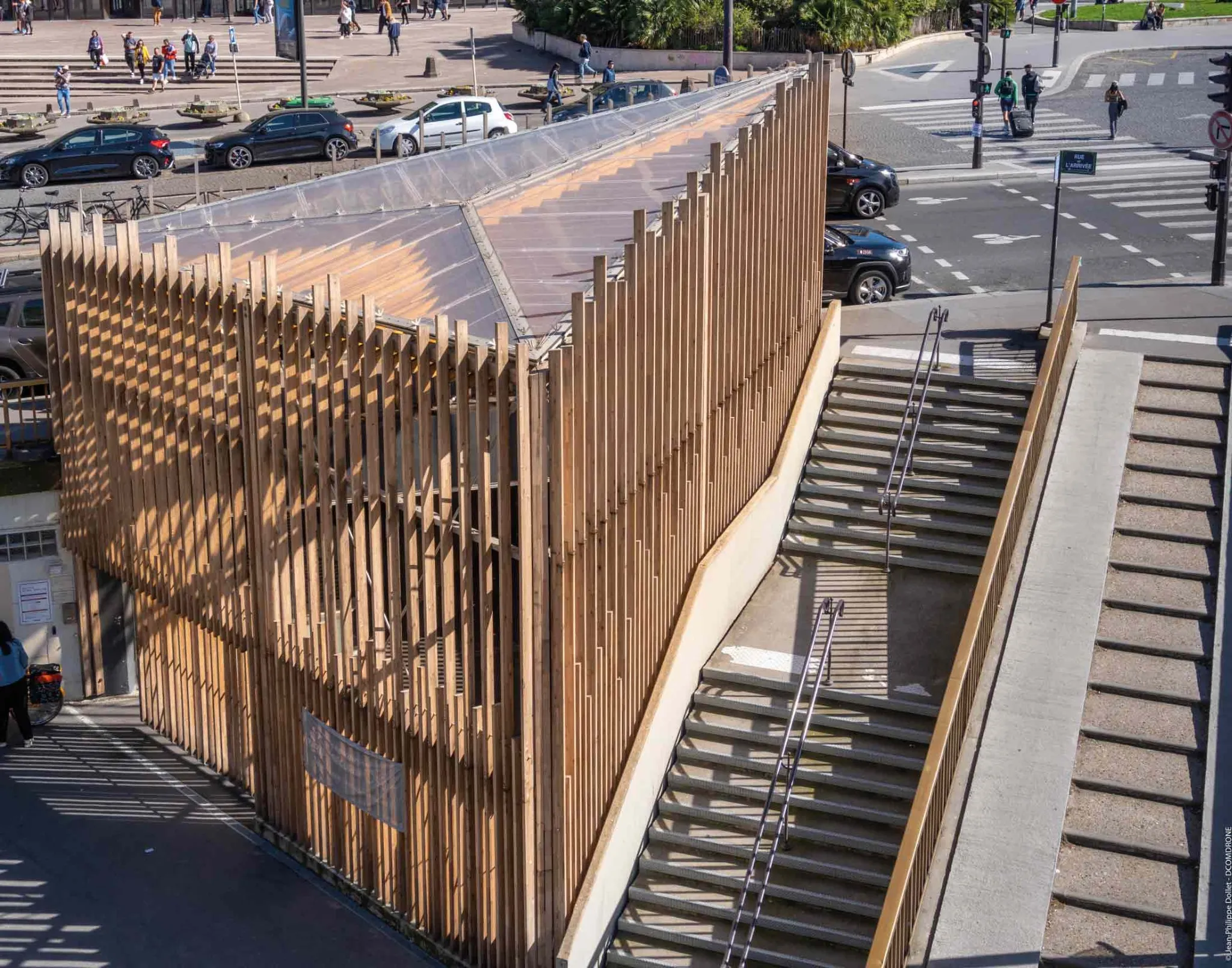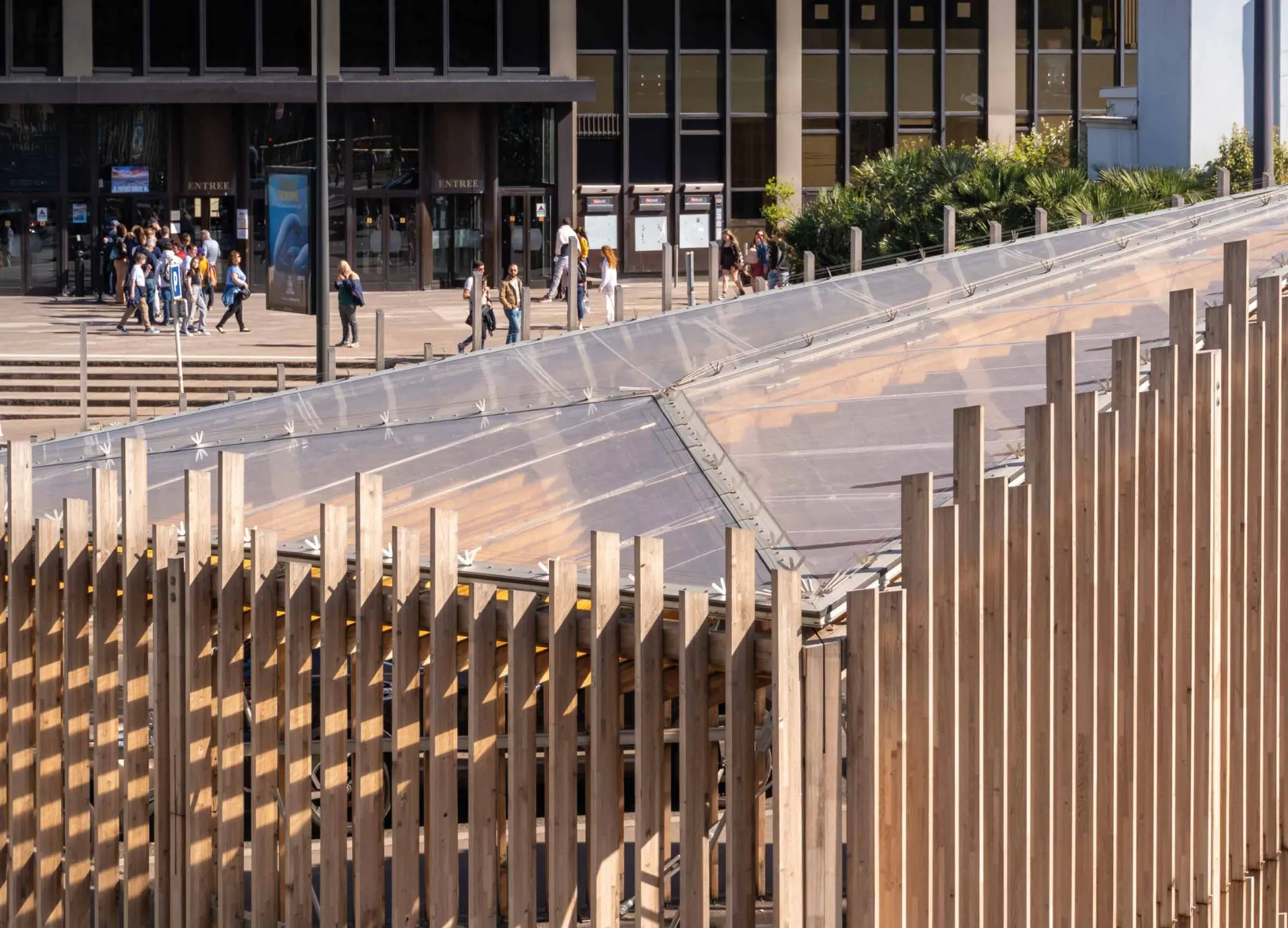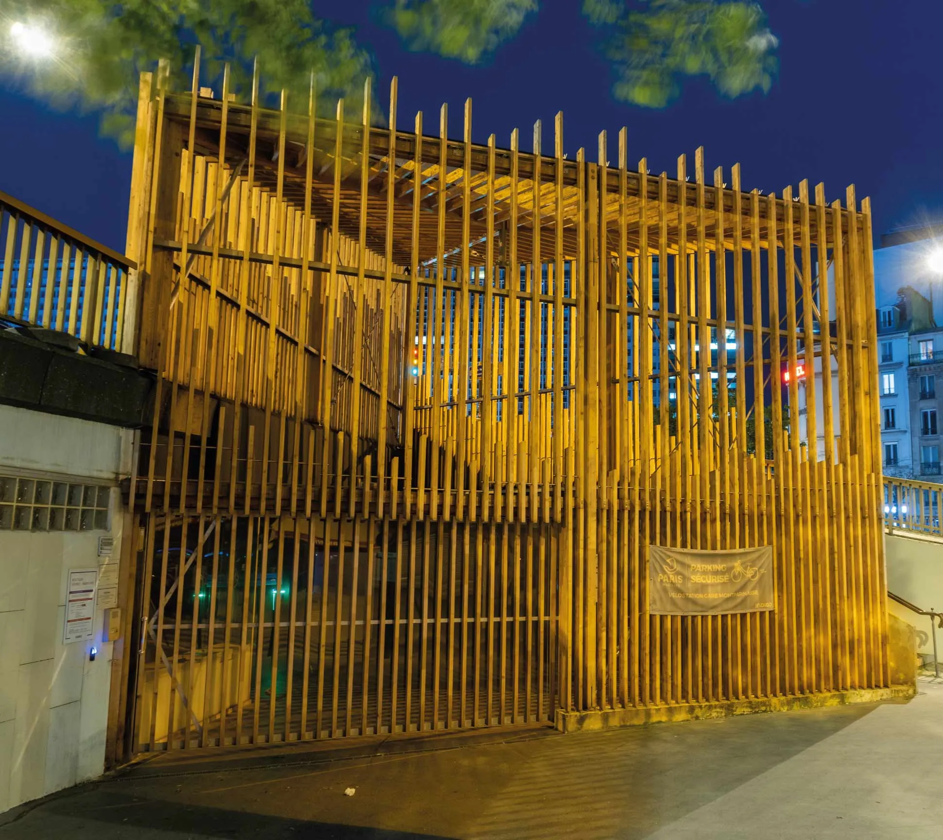 This project aims to cover the bicycle parking located in the Montparnasse district of Paris. One of the main elements of the intervention is the transparent cover at the entrance to the bicycle parking area. The aim is to create an access space protected from adverse weather conditions. The roof is a wooden structure with an inclined triangular floor plan, measuring approximately 9m on each side and 6m high. The membranes that guarantee the watertightness of the roof are made with a system of single-layer, tensioned ETFE sheeting.
