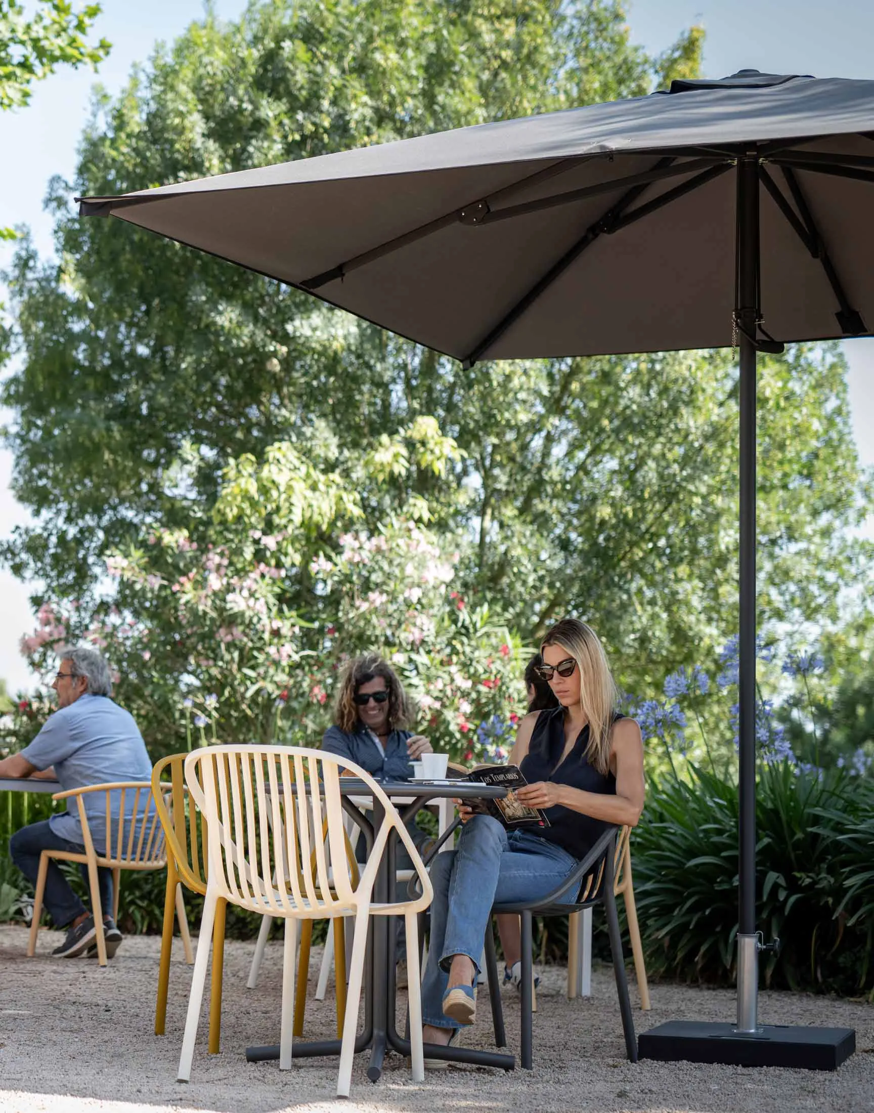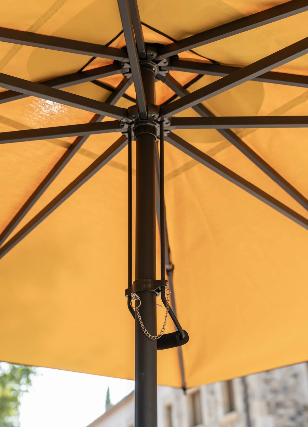 Rayden es un parasol ergonómico que facilita el día a día de restaurantes, hoteles y cafeterías. Su sistema de manija push-up permite una apertura suave y sin esfuerzo le convierte en el parasol más cómodo de la colección.