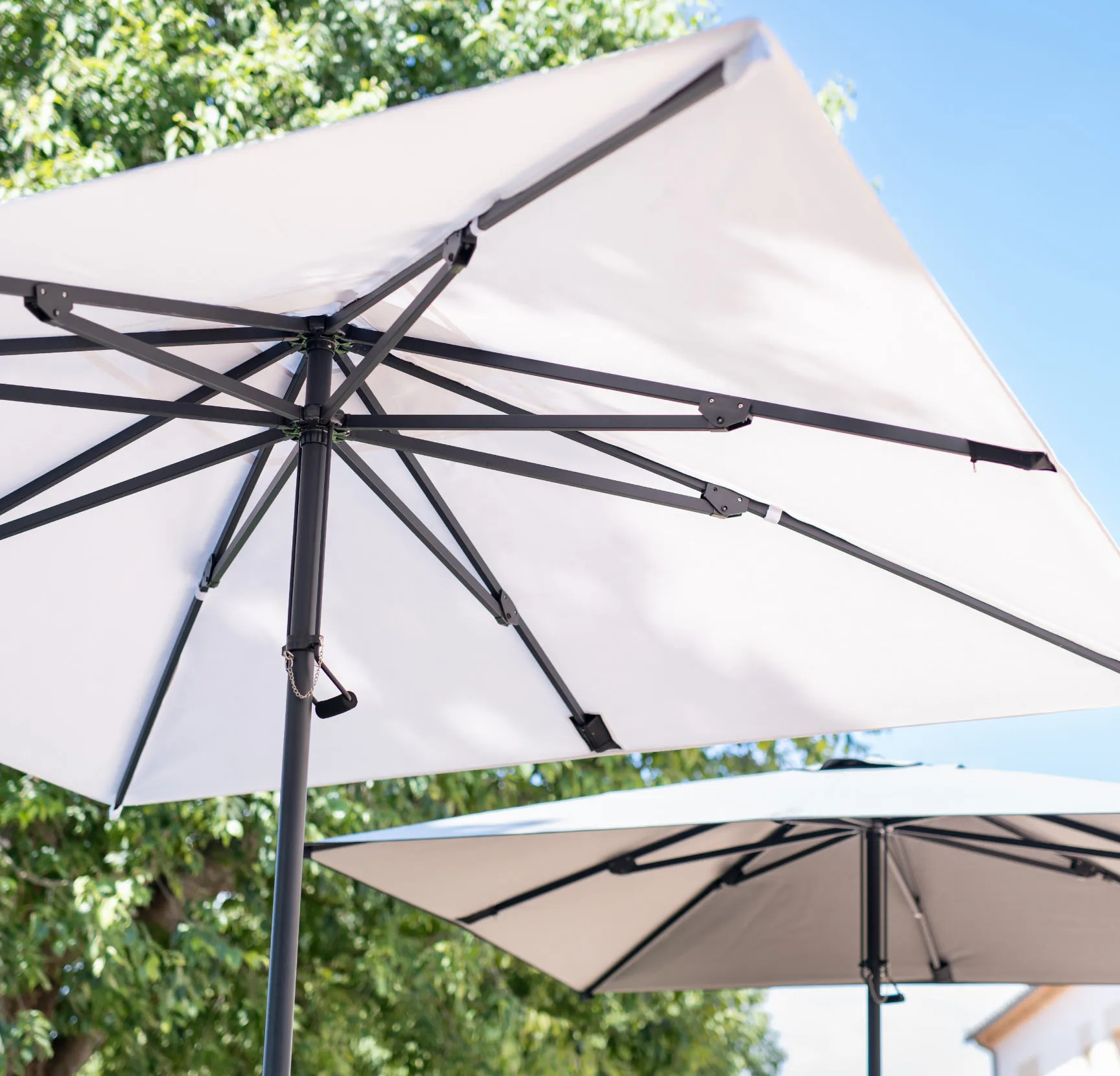 Comodidad y ergonomía son los sellos distintivos de Rayden, un parasol diseñado para facilitar el día a día de establecimientos comerciales. Su sistema exclusivo de apertura manual con empuñadura de tensión le convierte en una solución rápida y eficaz para el uso cotidiano. Además, su estructura robusta de aluminio y sus 8 radios, proporcionan protección resistente durante todo el año.