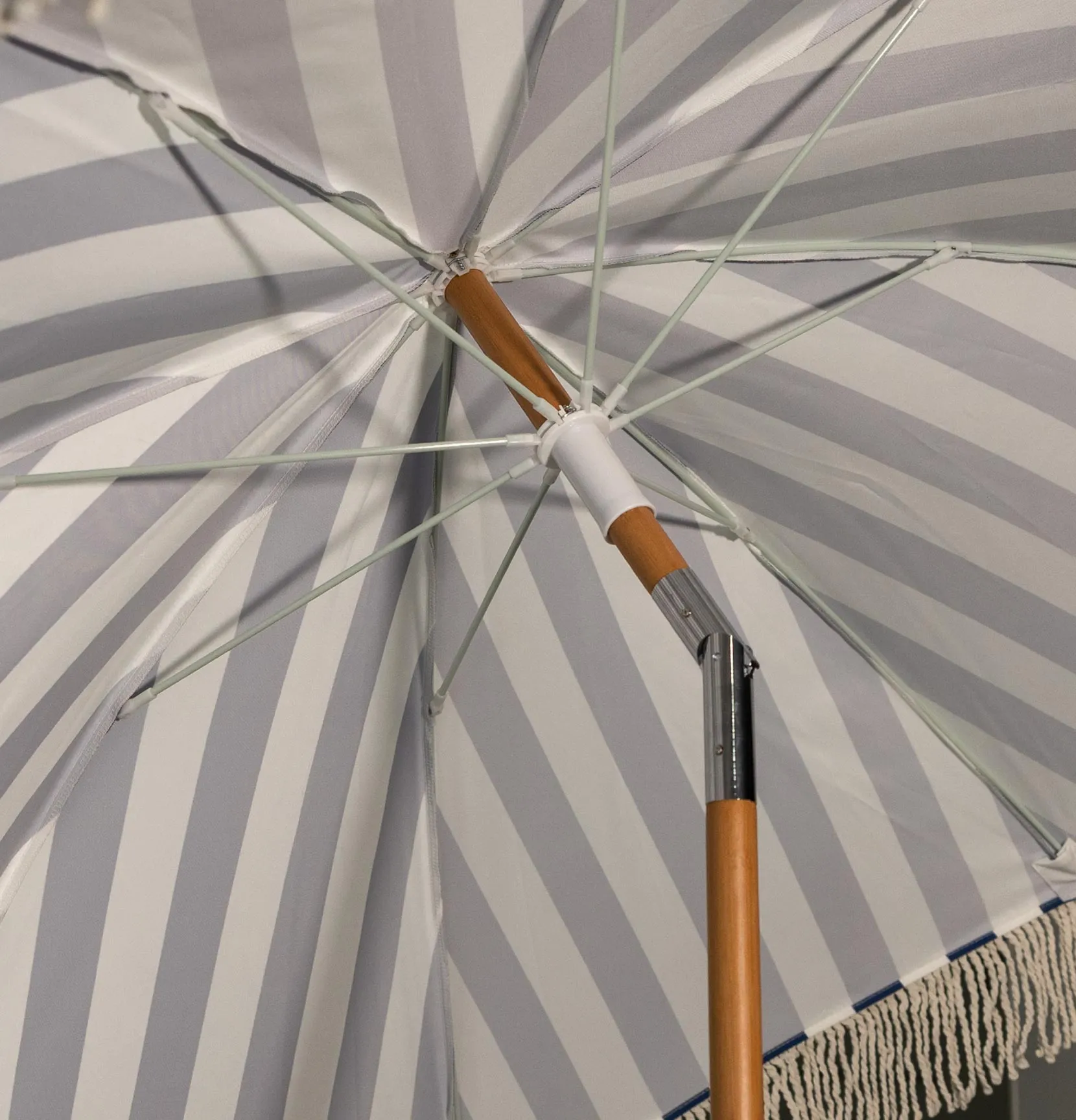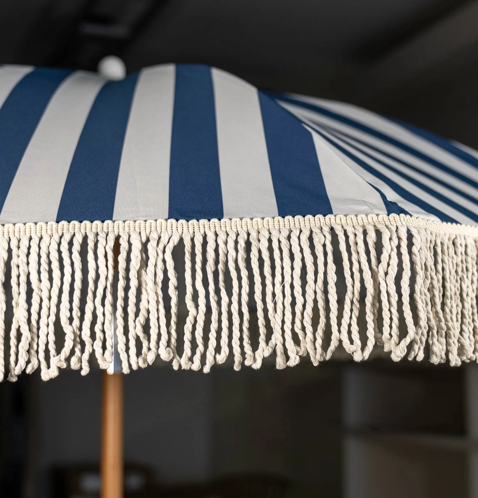 Novara está pensado para espacios que piden sombra sin perder ligereza visual. Su perfil estilizado, el mástil centrado y el tamaño reducido lo convierten en una opción especialmente versátil para rincones junto a la piscina, pequeñas terrazas o zonas de descanso donde cada pieza cuenta. El listado azul y blanco aporta un carácter más gráfico y refrescante que se aleja de la calma mediterránea de Siena para acercarse a una estética más costera, mientras que los flecos añaden un detalle decorativo que refuerza su identidad. El resultado es un parasol pequeño, funcional y con una presencia que viste el exterior desde una clave más expresiva.