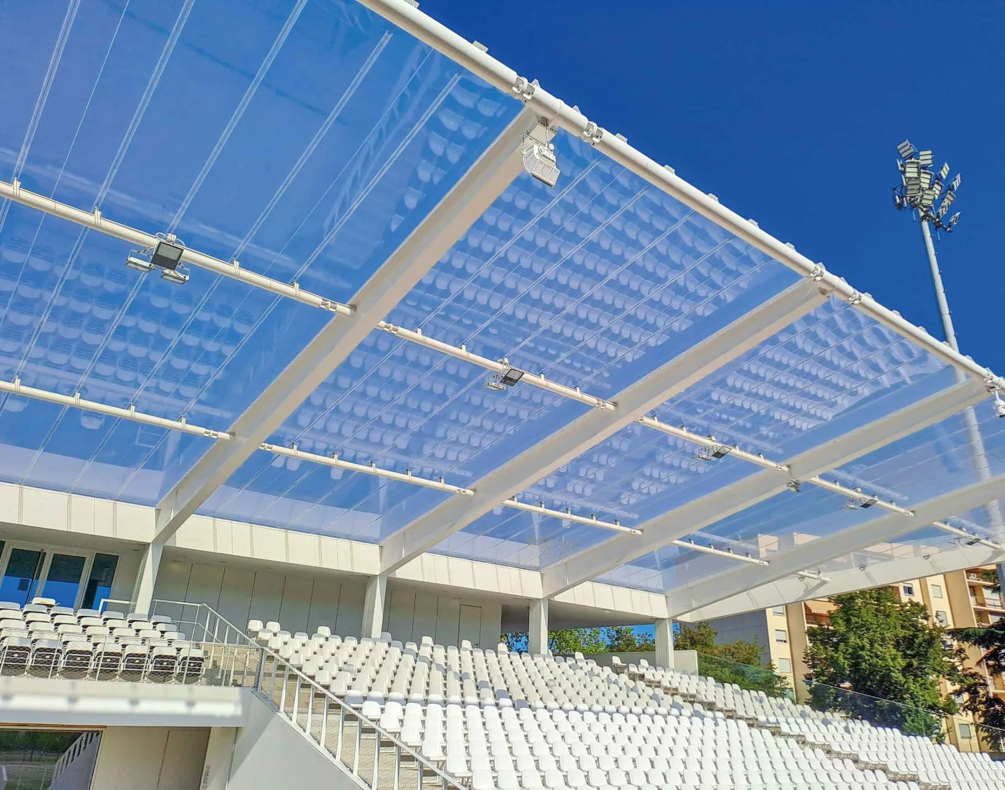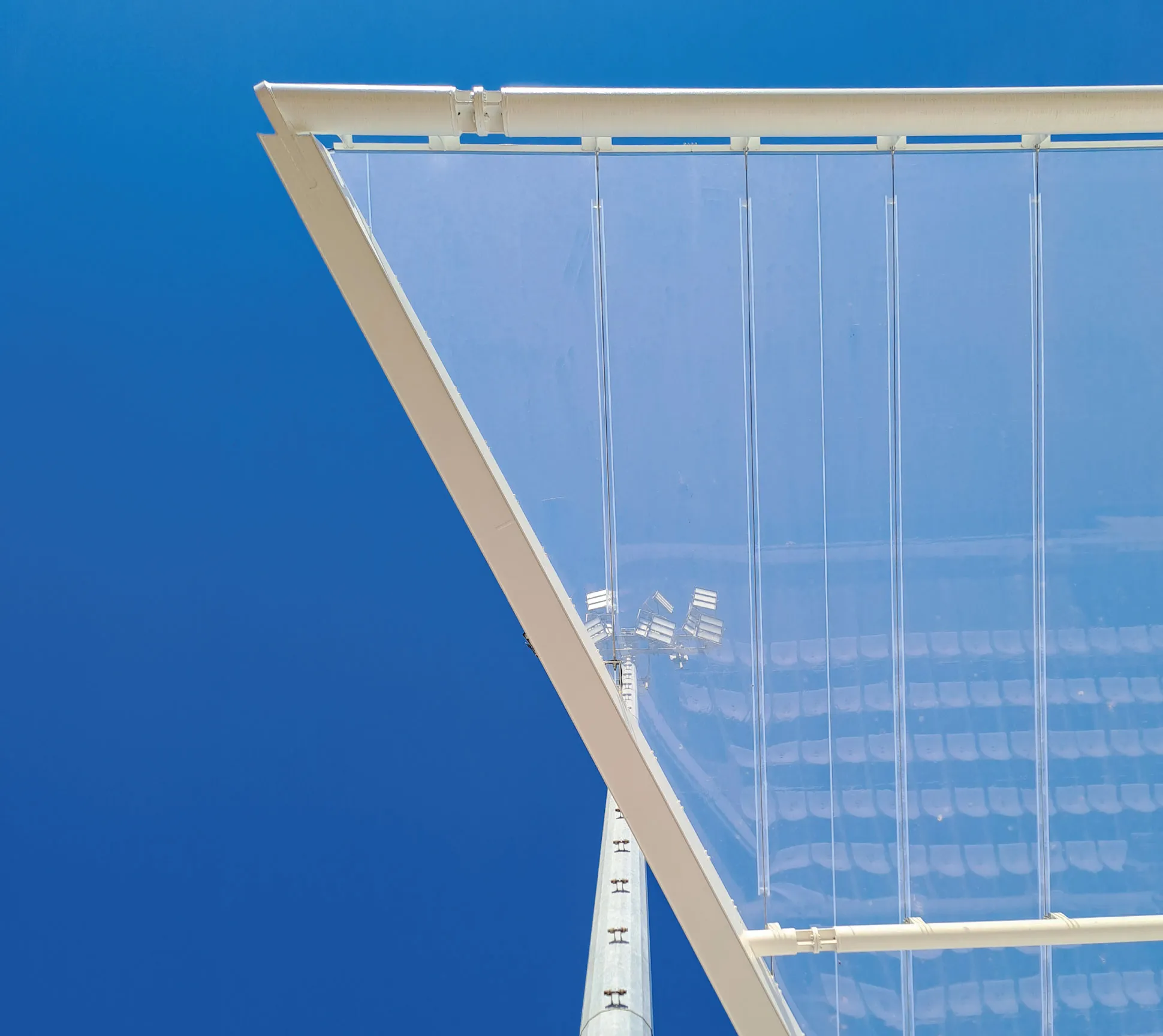 La cubierta adopta el sistema de ETFE monocapa para minimizar peso (≈1 kg/m²) y cargas sobre la estructura existente. Perfiles perimetrales de aluminio aseguran la tensión homogénea, mientras que cables inox alineados con la pendiente dotan al sistema de estabilidad frente a viento y succión. El montaje se completó en dos semanas, sin interferir con la temporada deportiva.