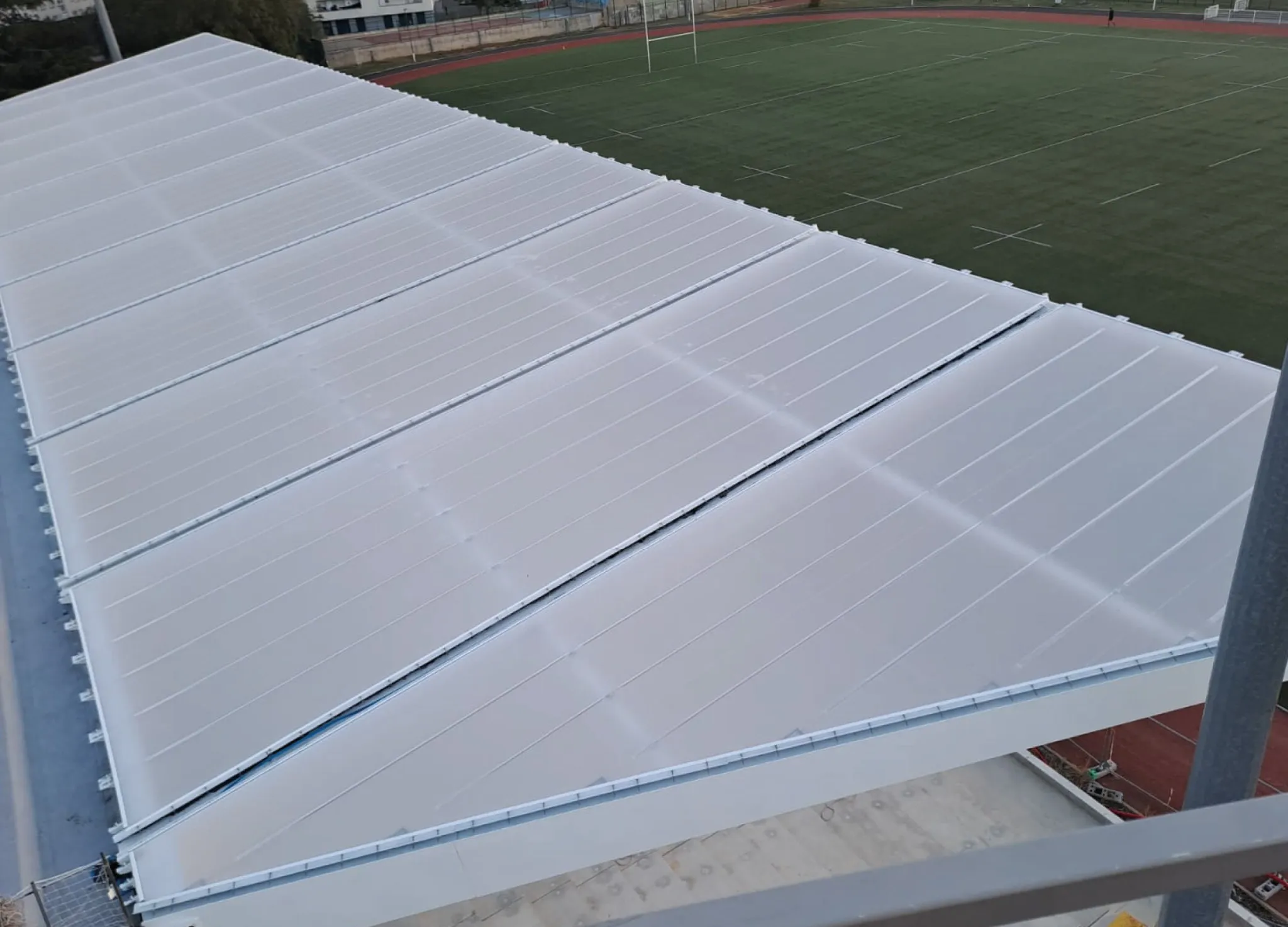 La tribuna principal del Stade Boiron‑Granger incorpora una cubierta de ETFE monocapa que redefine la experiencia de grada: protege sin ocultar el cielo y aporta ligereza estructural a un recinto histórico del sureste de Lyon. IASO participó fabricando e instalando las 12 membranas que siguen la geometría trapezoidal de la estructura metálica, logrando un conjunto translúcido de alta eficiencia.
