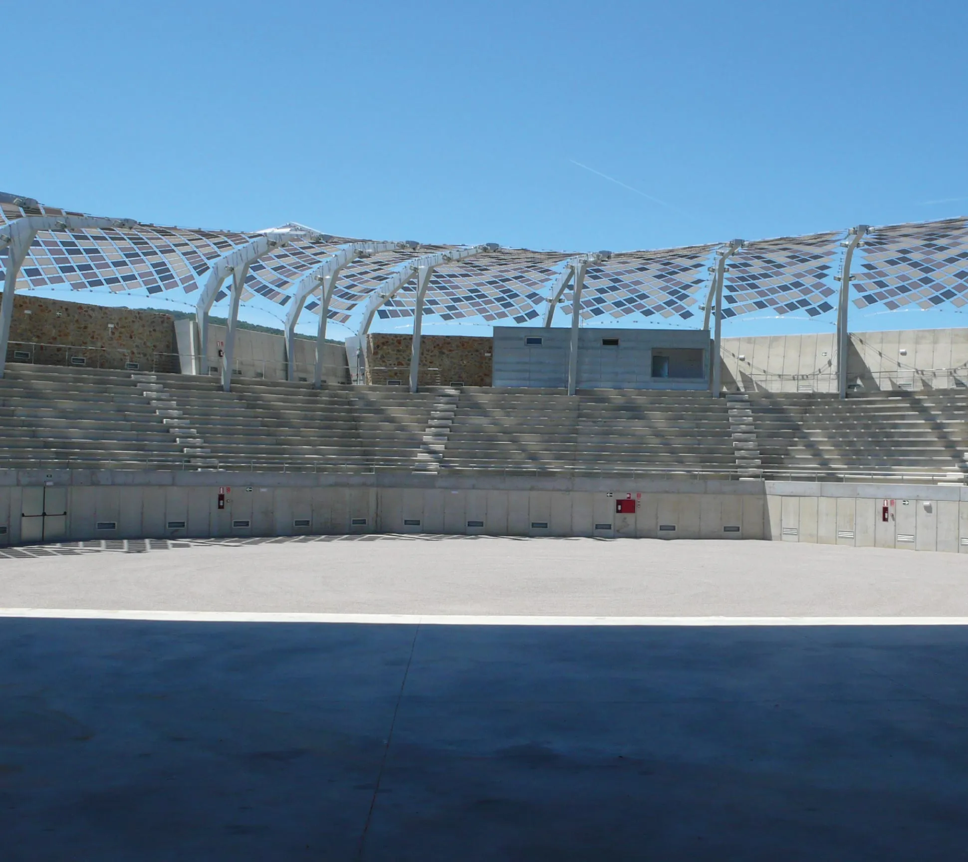 En el Auditorio de Llerena, en Badajoz, se ha instalado una cubierta de malla de cables de más de 1.500m² divida en nueve partes.