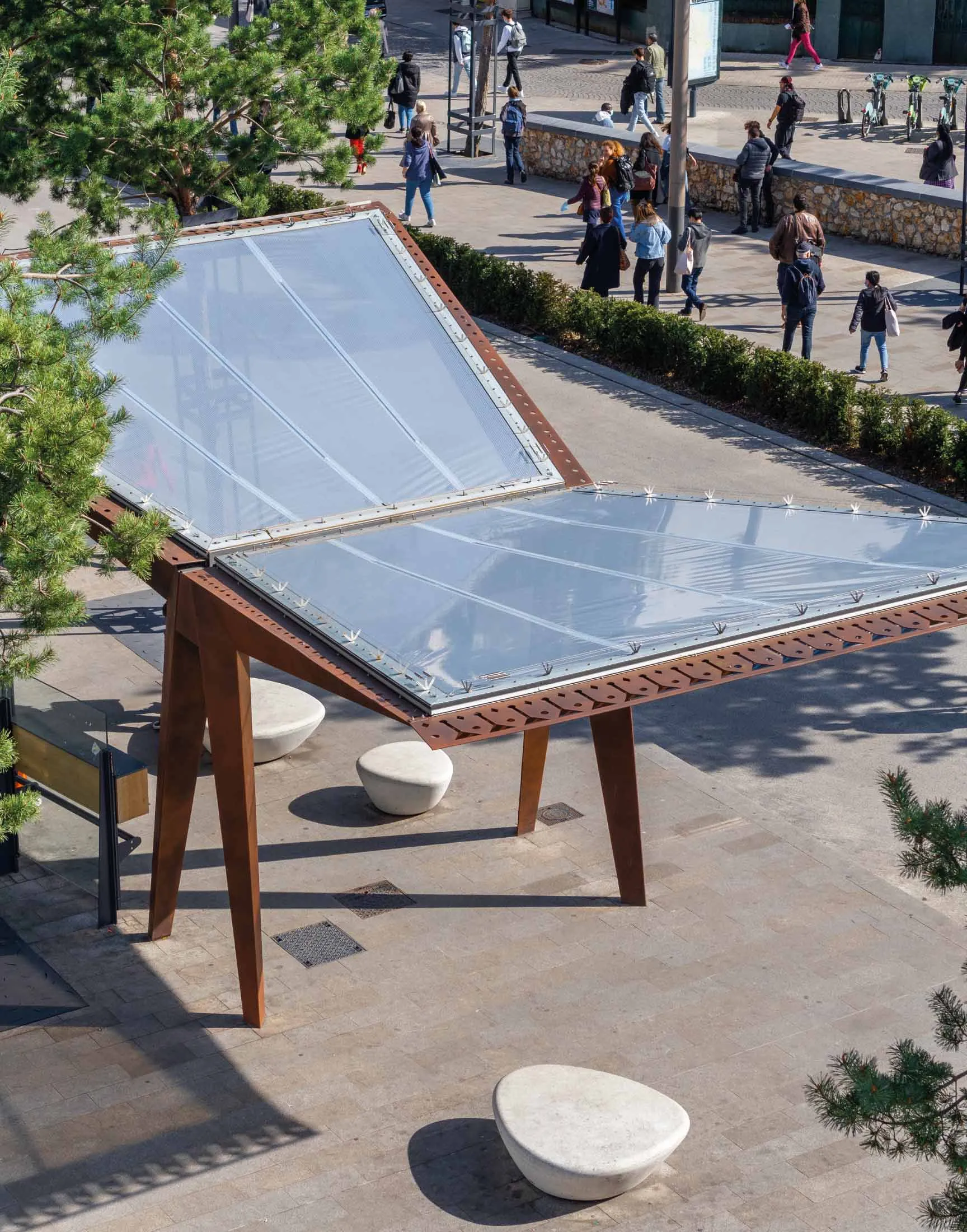 Cada una de las 4 marquesinas se compone de 2 membranas simétricas de ETFE monocapa, unidas por su eje de simetría. Las 4 marquesinas están situadas en la plaza central alrededor de la cual estacionan los diferentes autobuses, y están dispuestas de tal forma que se superponen las unas con las otras para crear un espacio de espera para los viajeros de una longitud superior a 25 m.