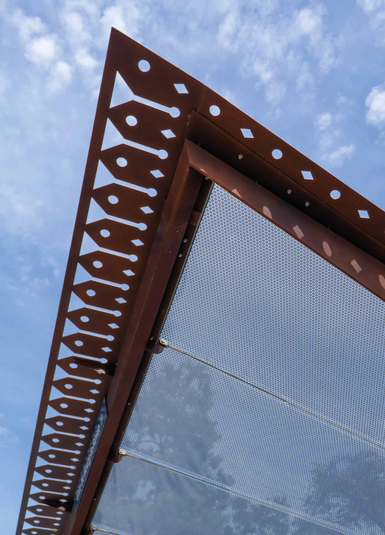 Esta obra se ha realizado con el sistema de ETFE monocapa de 250 micras de espesor, serigrafiado con un diseño de puntos de color aluminio y diámetro 16mm sobre el 70% de la superficie.