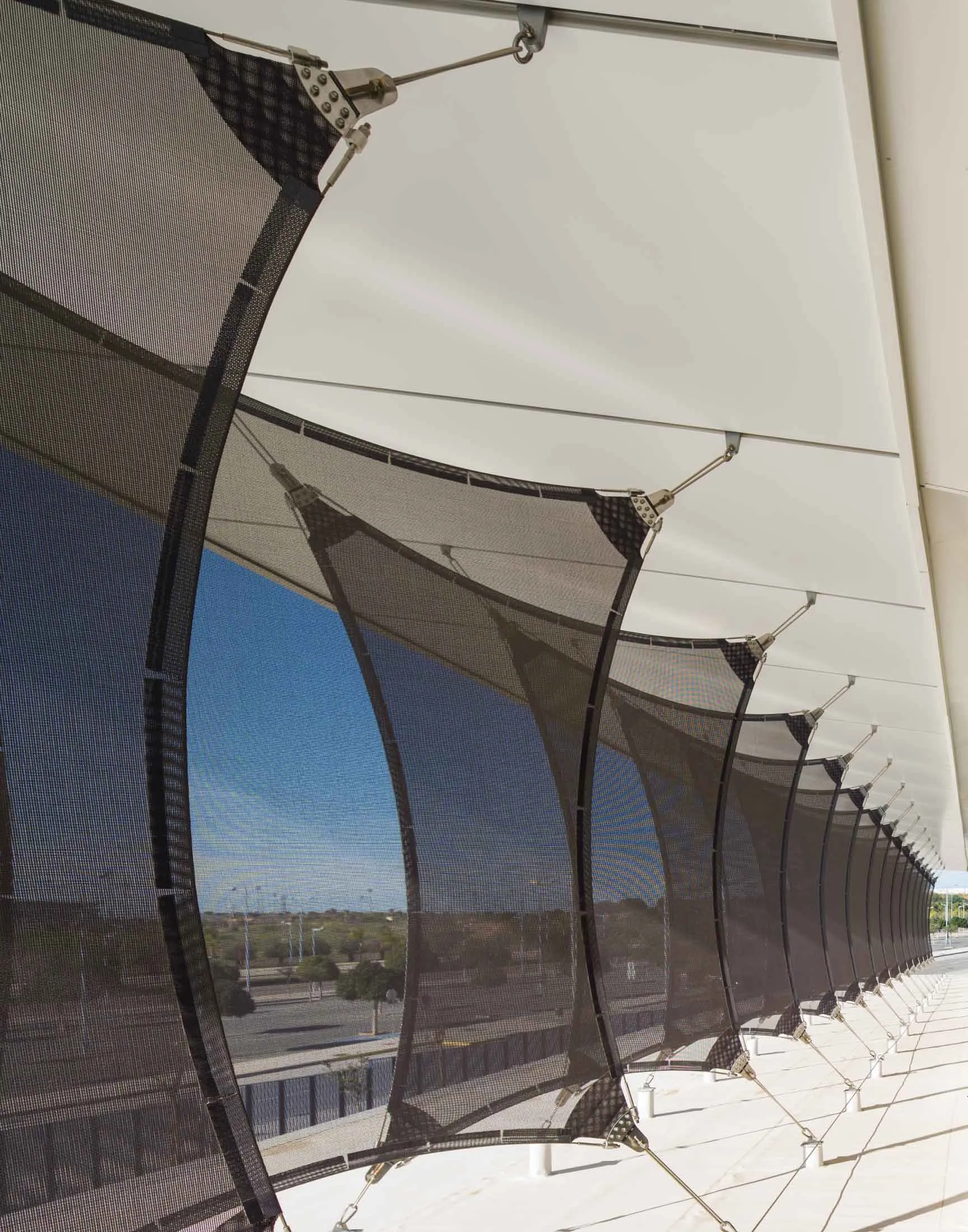 La envolvente textil está formada por paneles i-tensing y velas tensadas cubriendo una superficie de 7.500m² y 1.145m², respectivamente. Con el objetivo de proporcionar protección solar a las aulas, las velas tensadas se orientan de forma diferente según cada fachada. En cambio, con los paneles i-tensing situados en el falso techo, se busca un acabado estético de líneas rectas que cubre los herrajes de las velas y los mismos del panel.