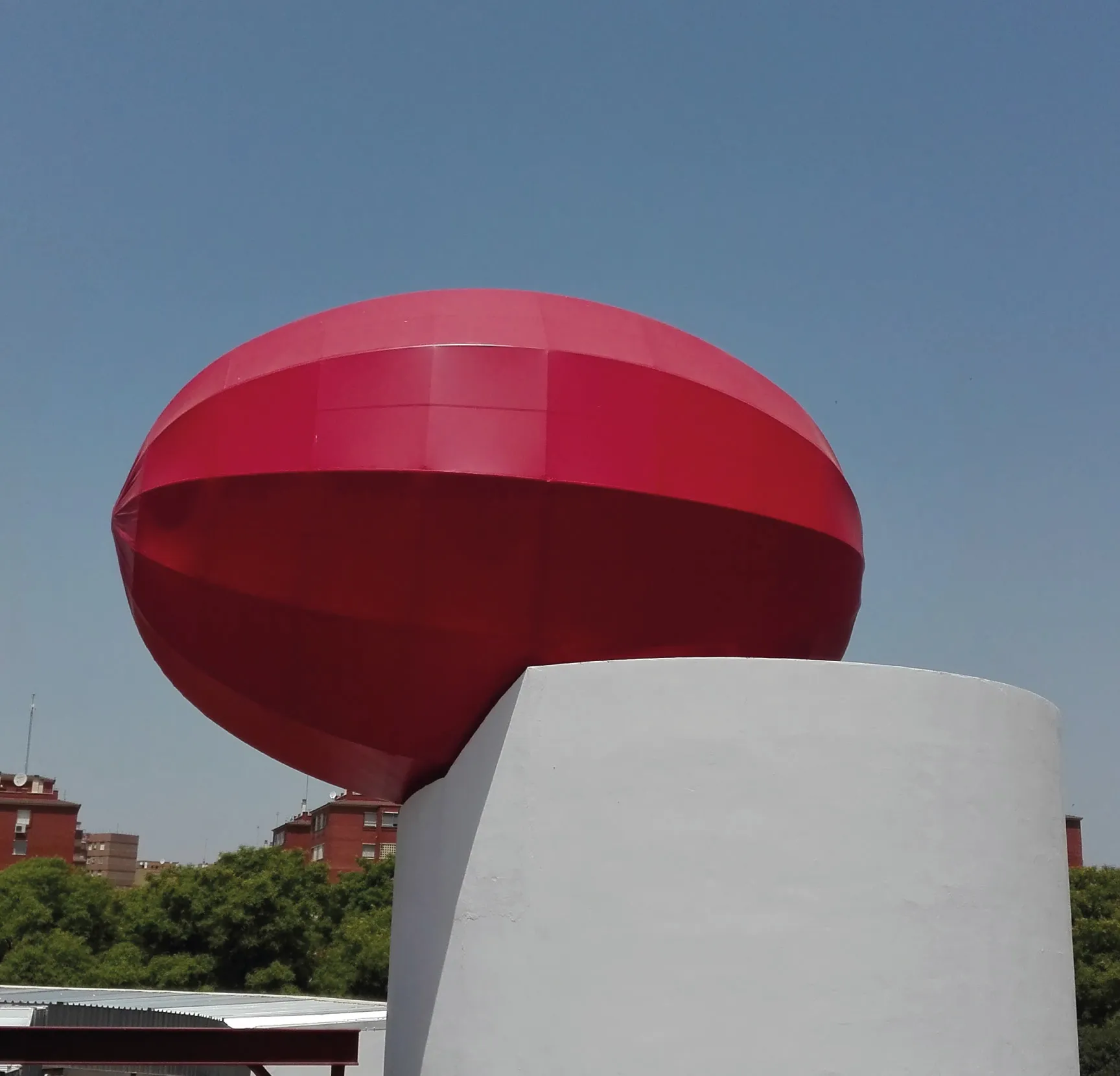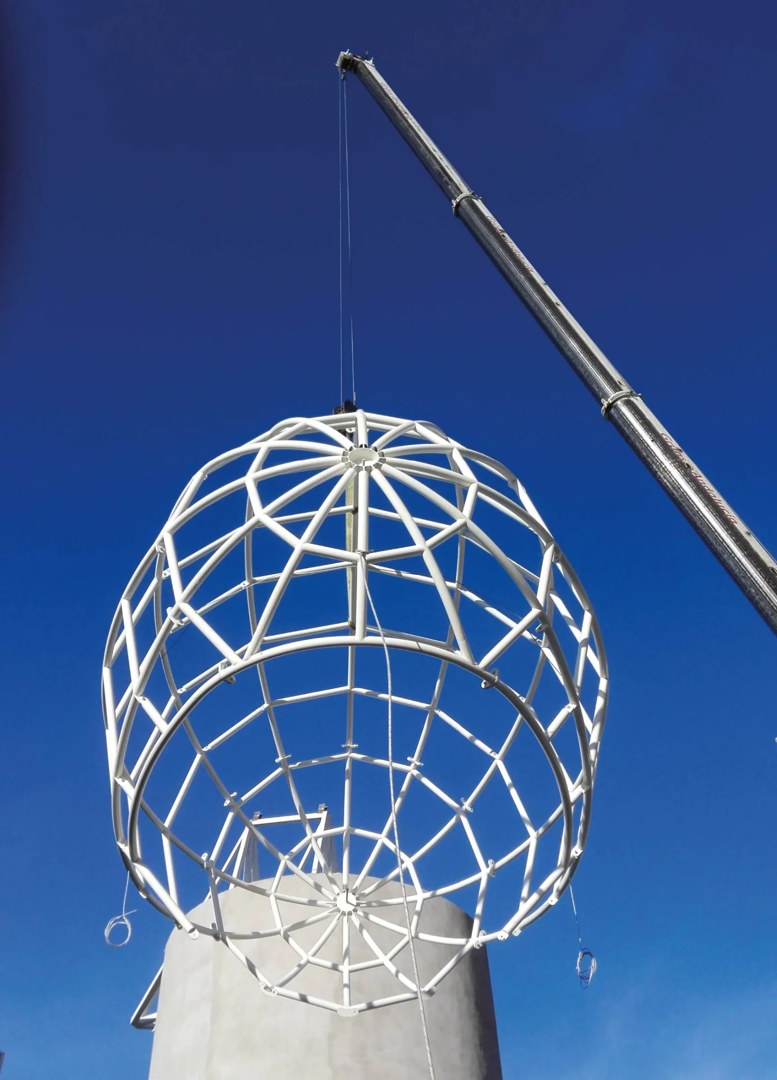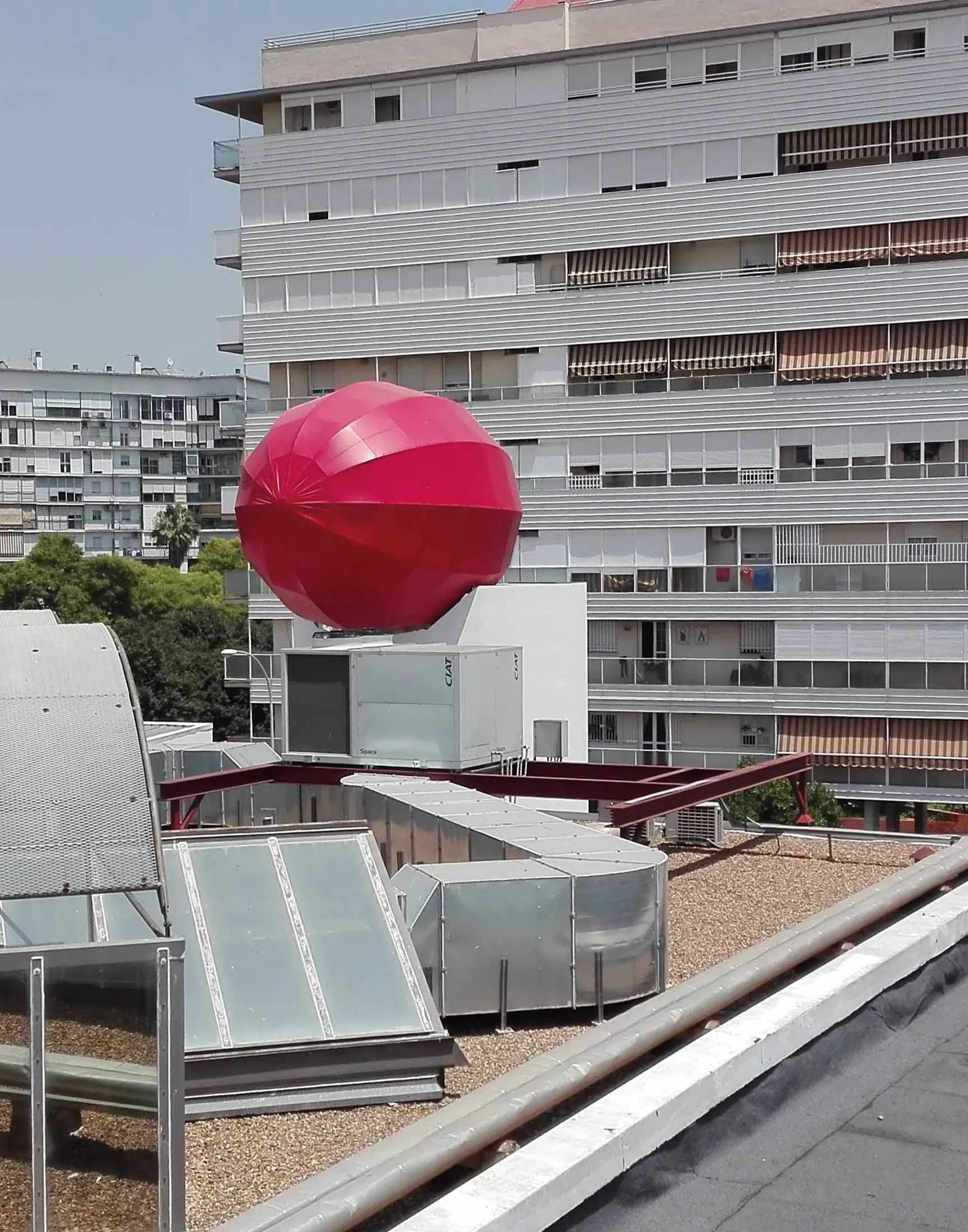 La estructura metálica tubular inferior forma arcos de extremo a extremo conformando el elipsoide. Con el objetivo de reforzar la estructura, la estructura incluye costillas dispuestas a lo largo del elipsoide. La membrana que lo conforma es un tejido de PVC ferrari 502 color rojo que envuelve y se tensa en el hueco inferior de la torre mediante acordonado con goma.