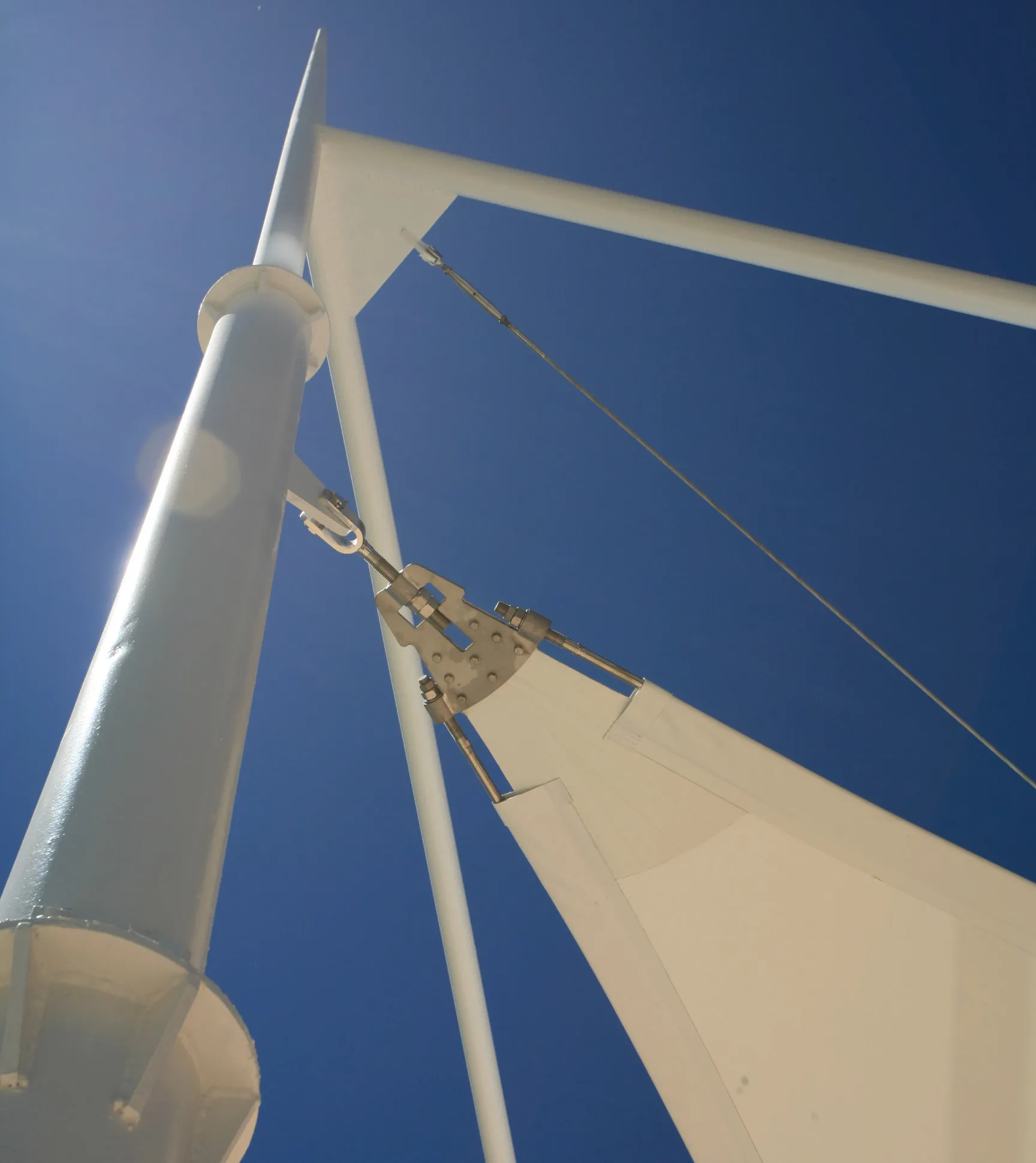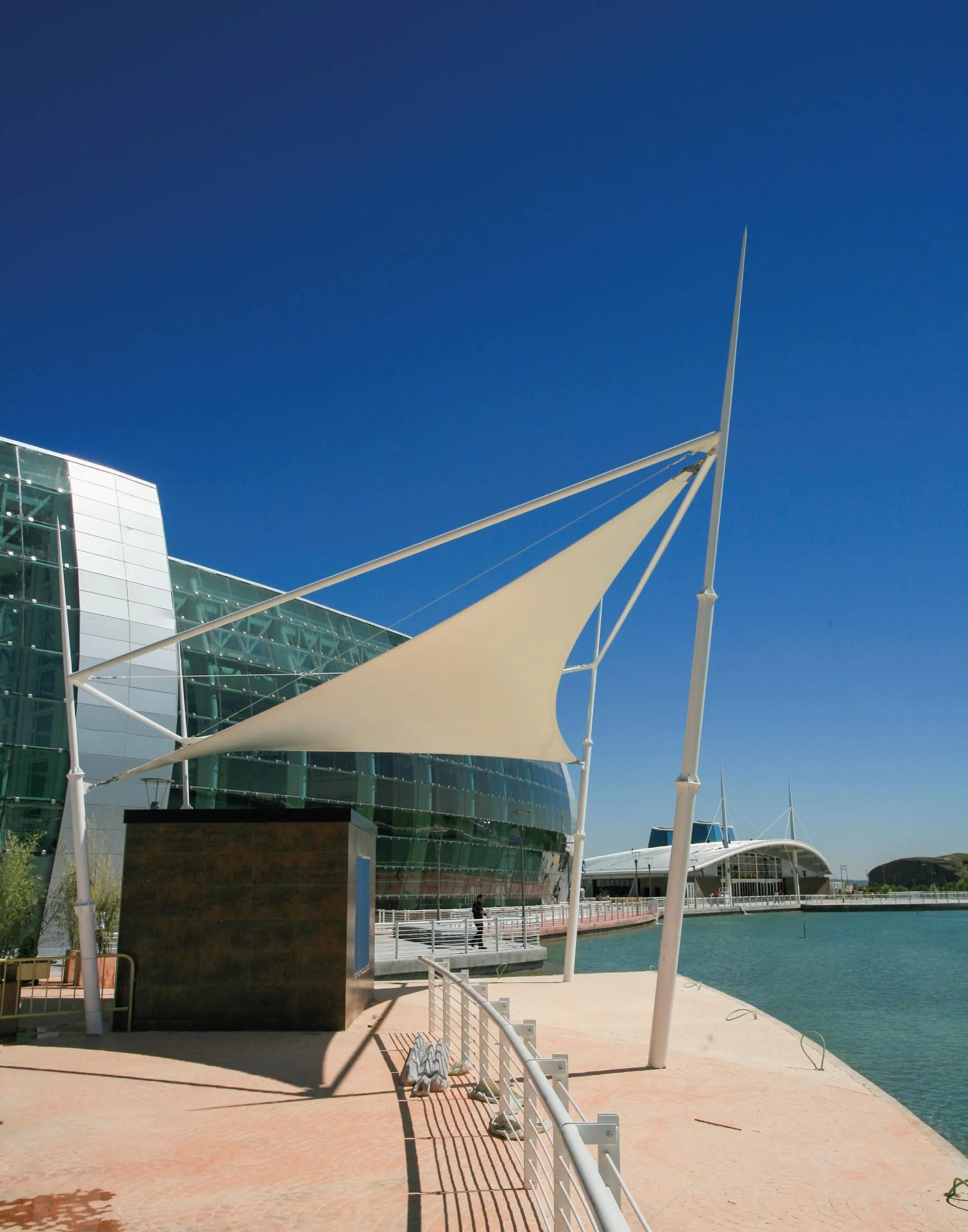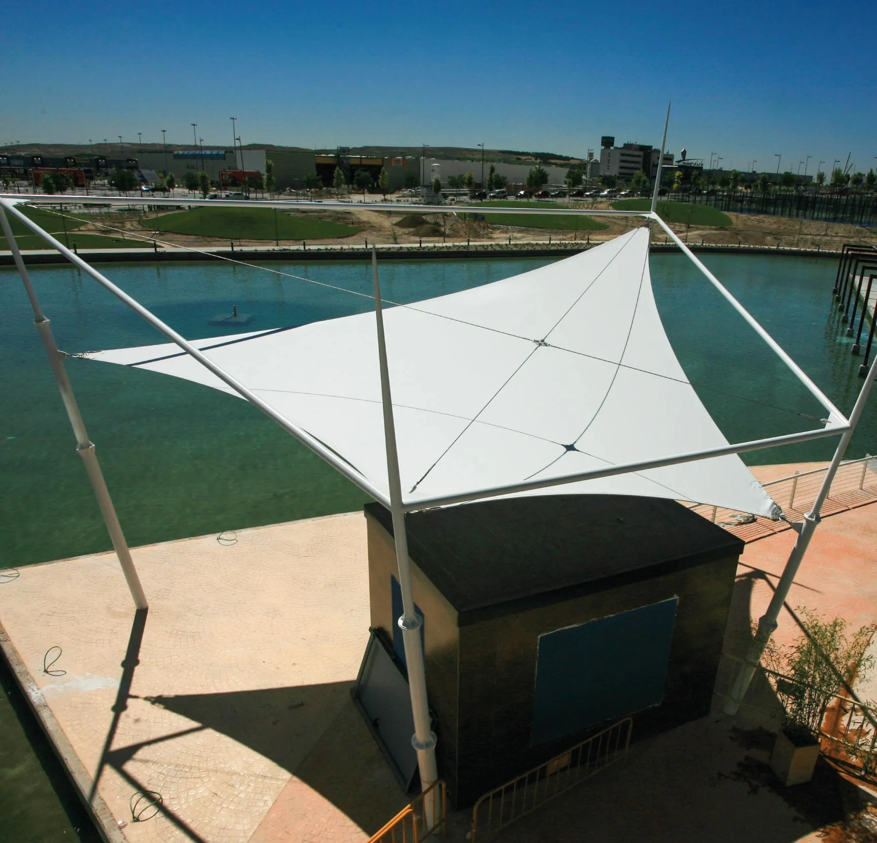Cubierta tensada de planta trapezoidal de cuatro vértices, en forma de paraboloide hiperbólico, situada sobre la terraza exterior del kiosco, junto al embarcadero.