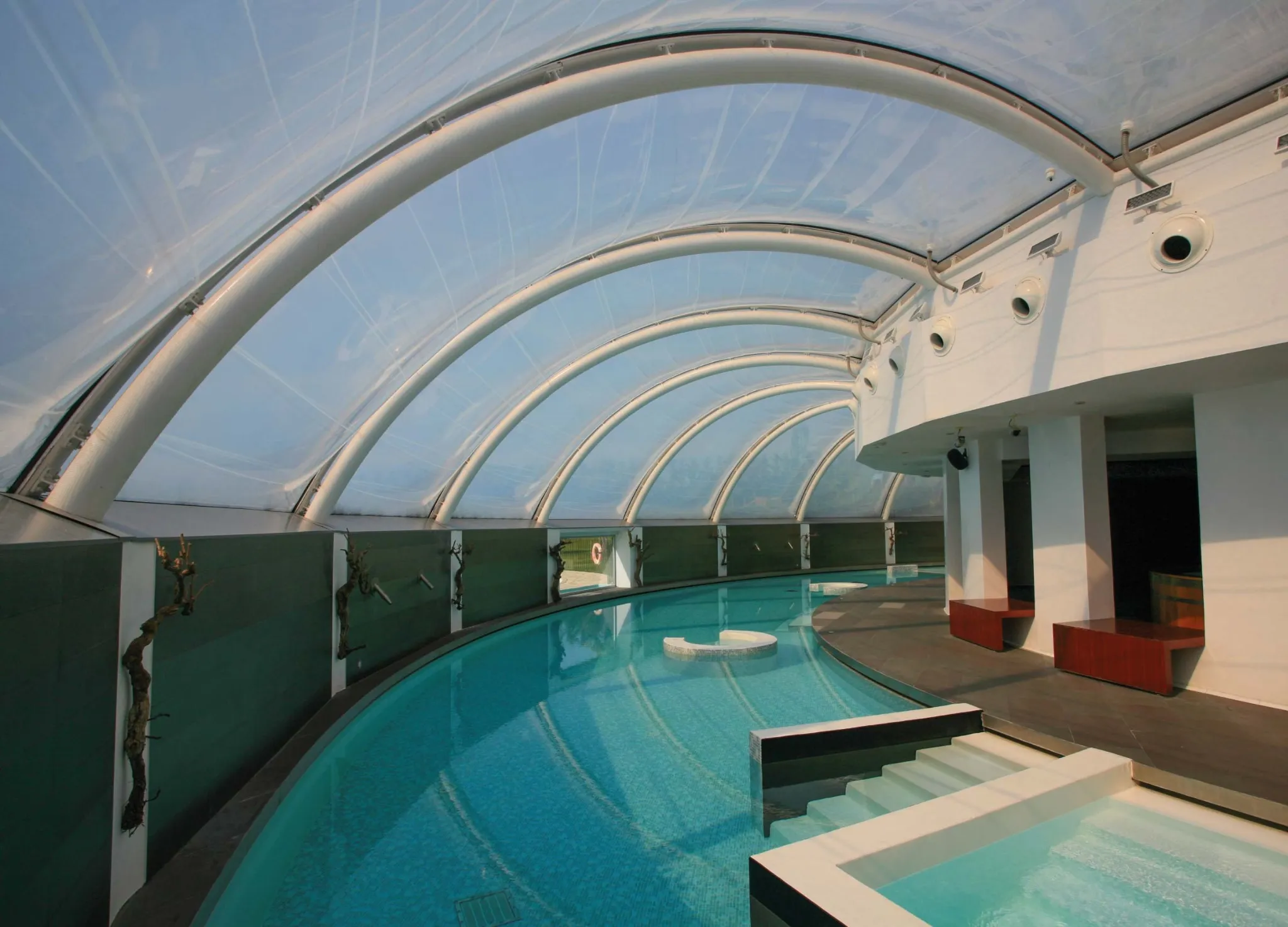 La modernidad de los materiales se mezcla con la elegancia del clasicismo del hotel. Los LEDs crean dinamismo y luminosidad en el espacio. El material de ETFE empleado para la cubierta semicircular matiza la entrada de luz y de radiación solar, mediante la impresión de una de sus capas. Su geometría en forma de arcos, que nacen desde la terraza superior y se apoyan en el jardín, aporta un volumen interior que unido a su gran transparencia hacia el entorno exterior, contagian a los clientes el descanso y el relax que persiguen.