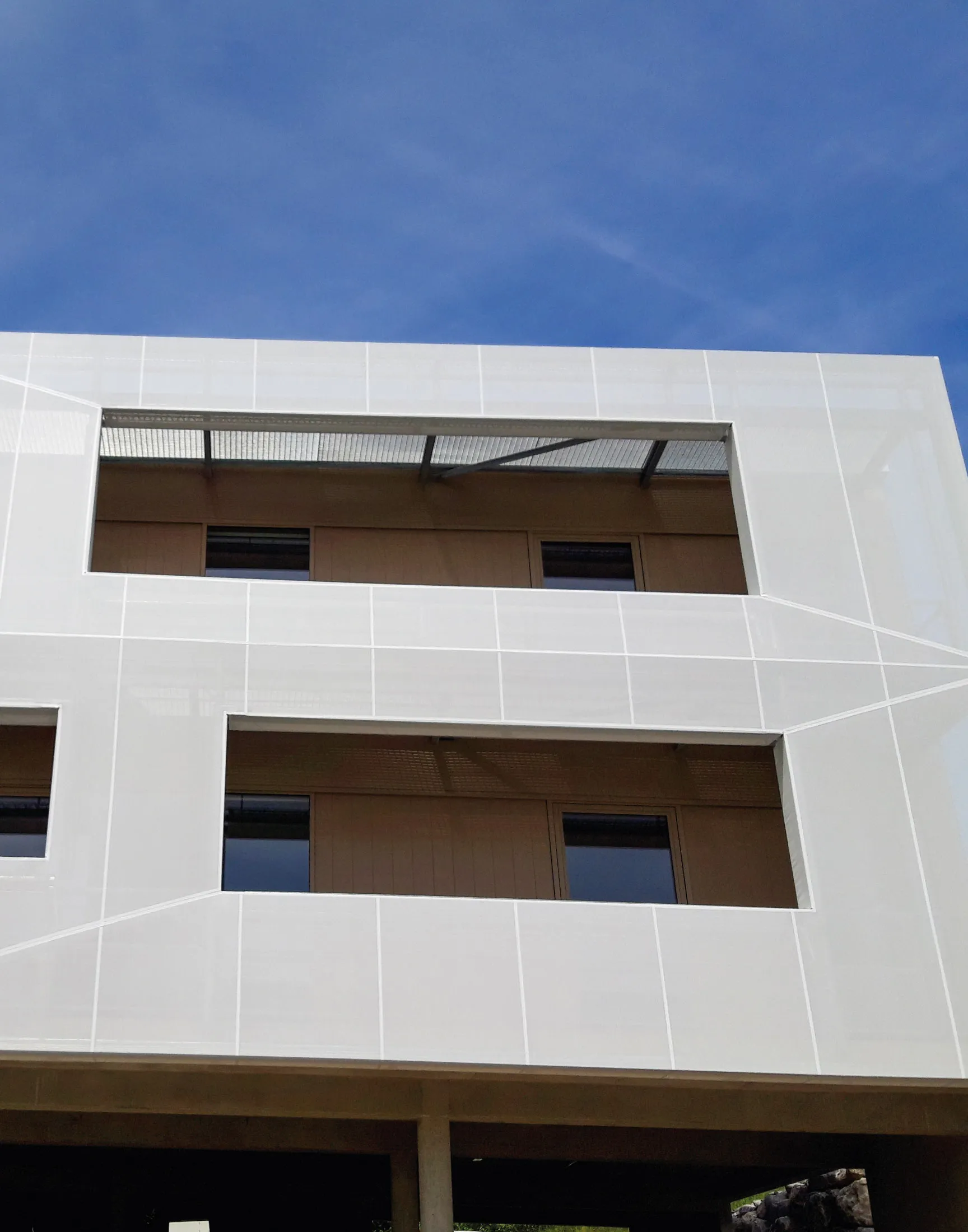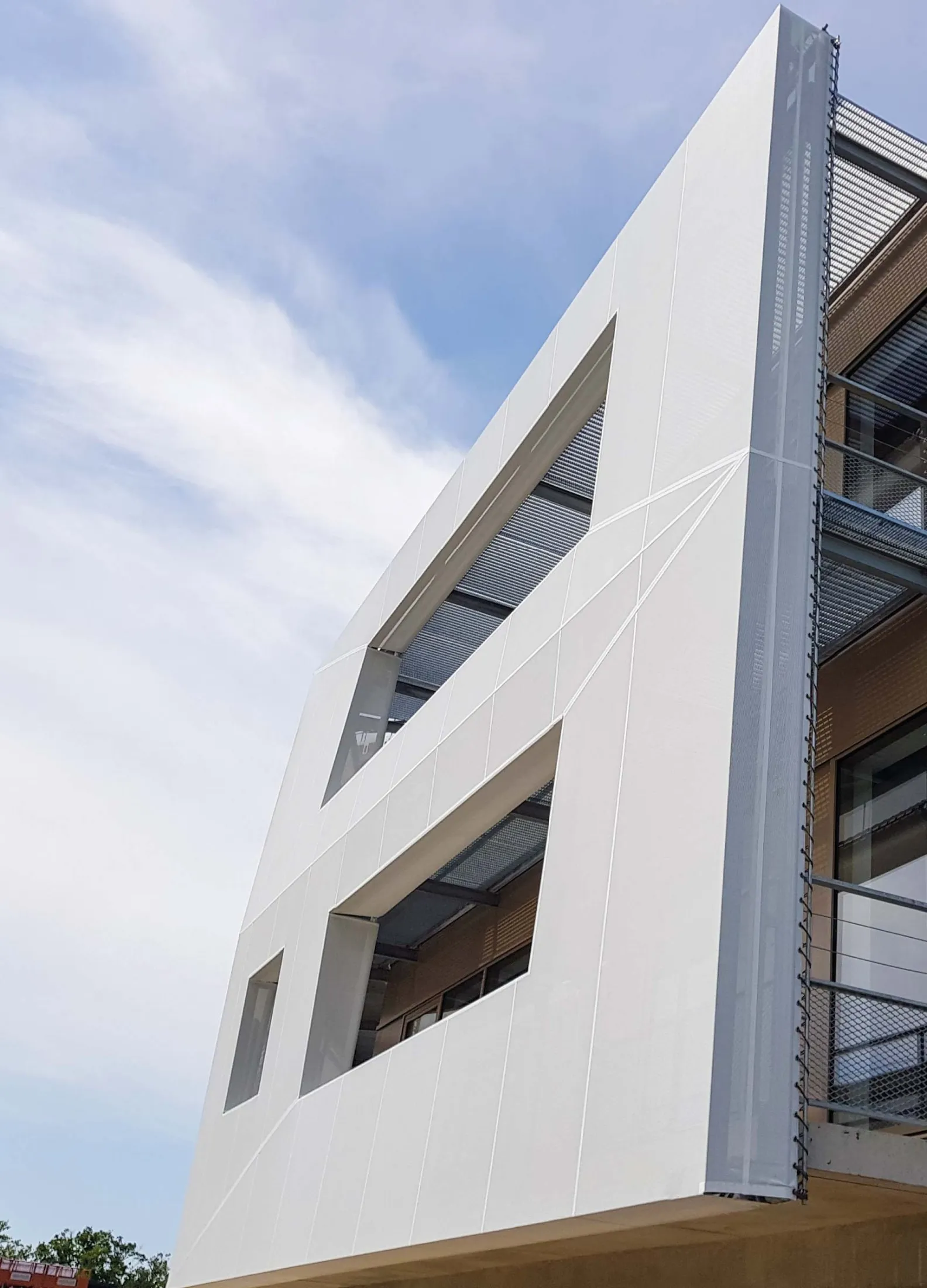 La membrana textil es el revestimiento final de la fachada principal del edificio y presenta múltiples quiebros para marcar planos de diferente inclinación definidos por el arquitecto. Se ha realizado en membrana Frontside View 381 de Serge Ferrari de color blanco, con una estructura en forma de malla que permite el paso de luz natural a las oficinas. La fachada integra una serie de 8 aperturas a modo de ventanas, que permiten a los usuarios del edificio asomarse al exterior a partir de dos pasarelas que recorren la totalidad de la fachada desde el interior.
