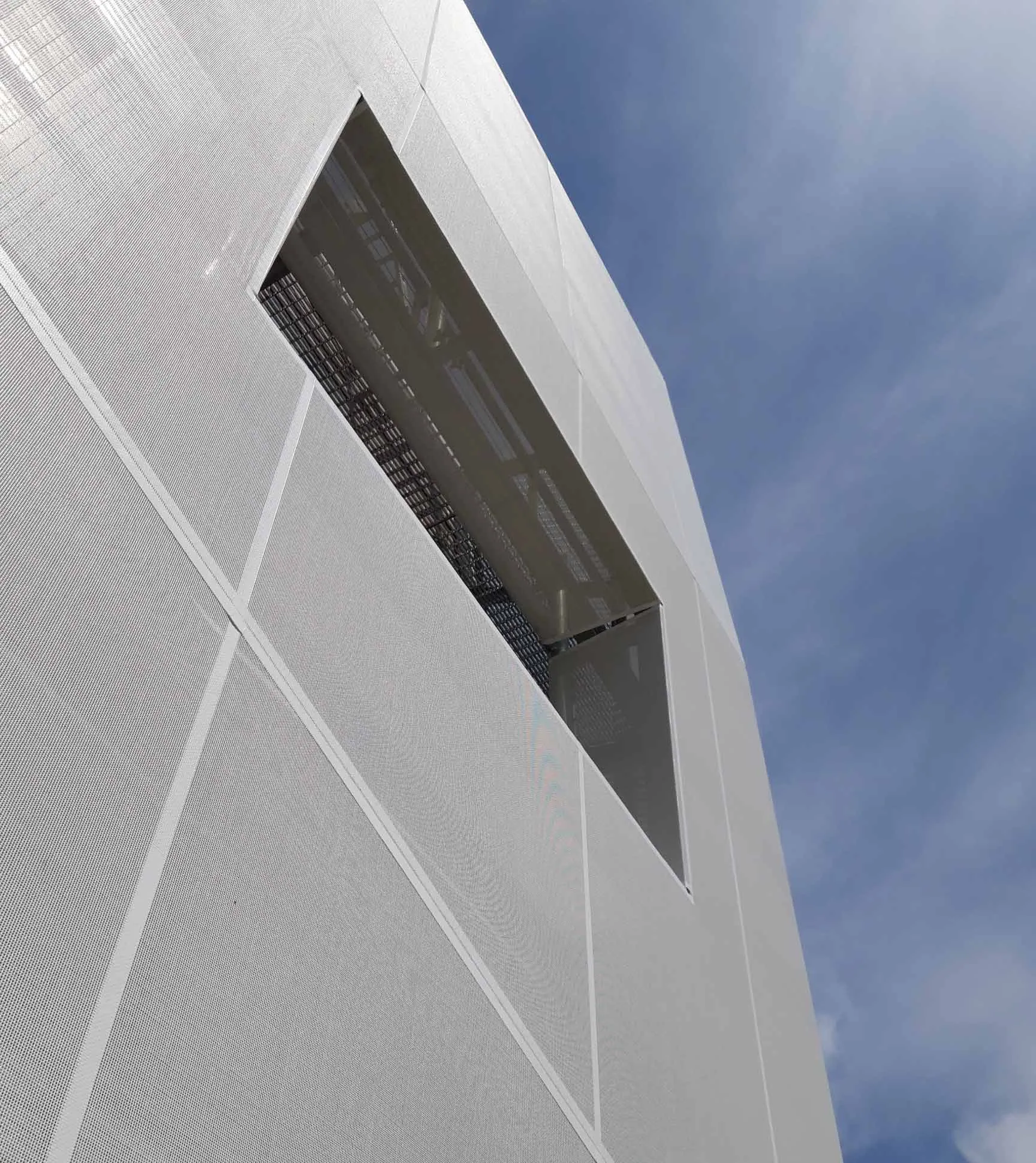 La fachada textil se ha realizado con membrana Frontside View 381 de Serge Ferrari, constituida de poliéster recubierto de PVC.