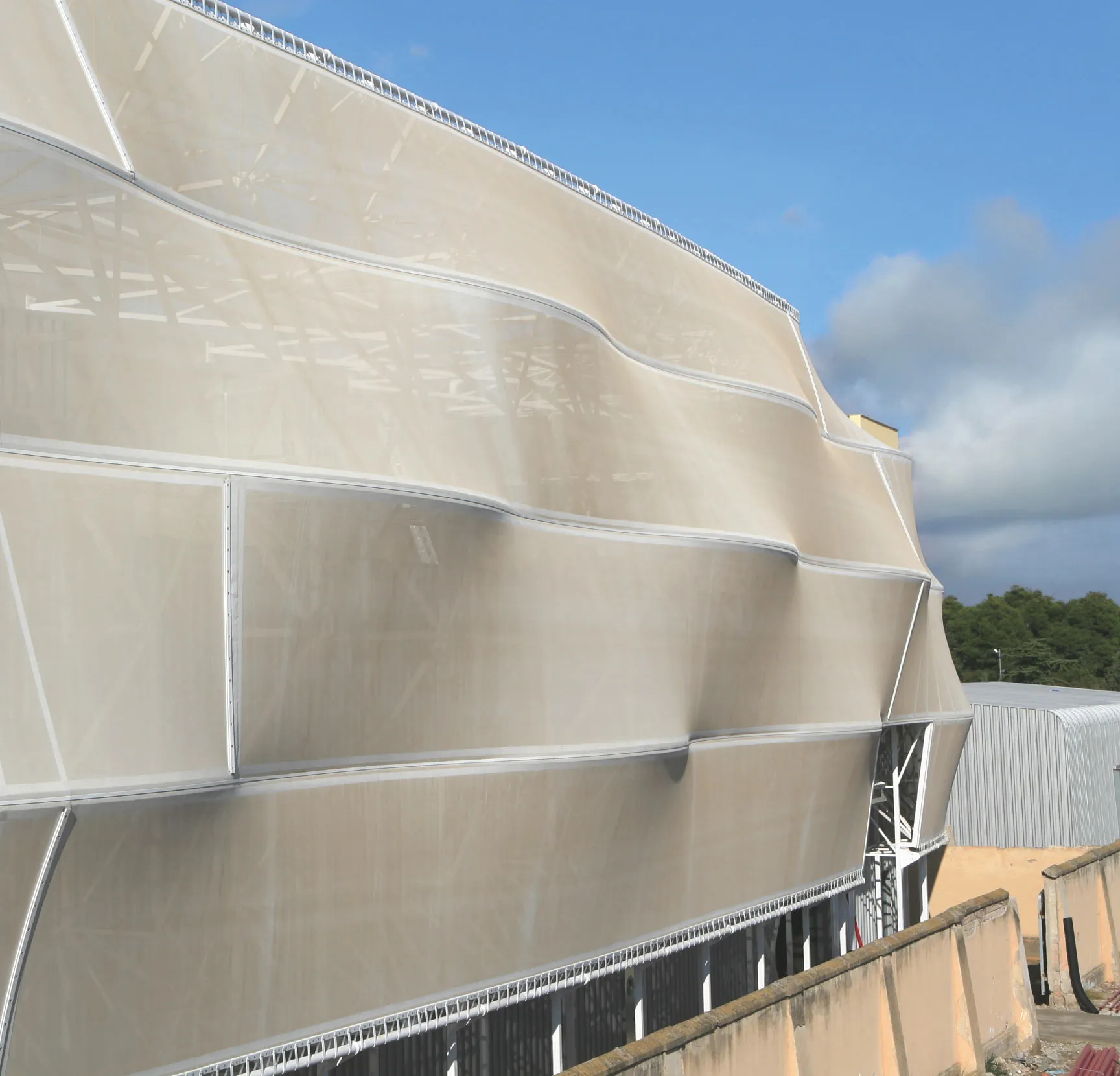 DESCRIPCIÓN DE LA OBRA Envolvente con tejido rejilla en el edificio plató, y cubierta de doble membrana con aislamiento para el vestíbulo de entrada al edificio Magical
