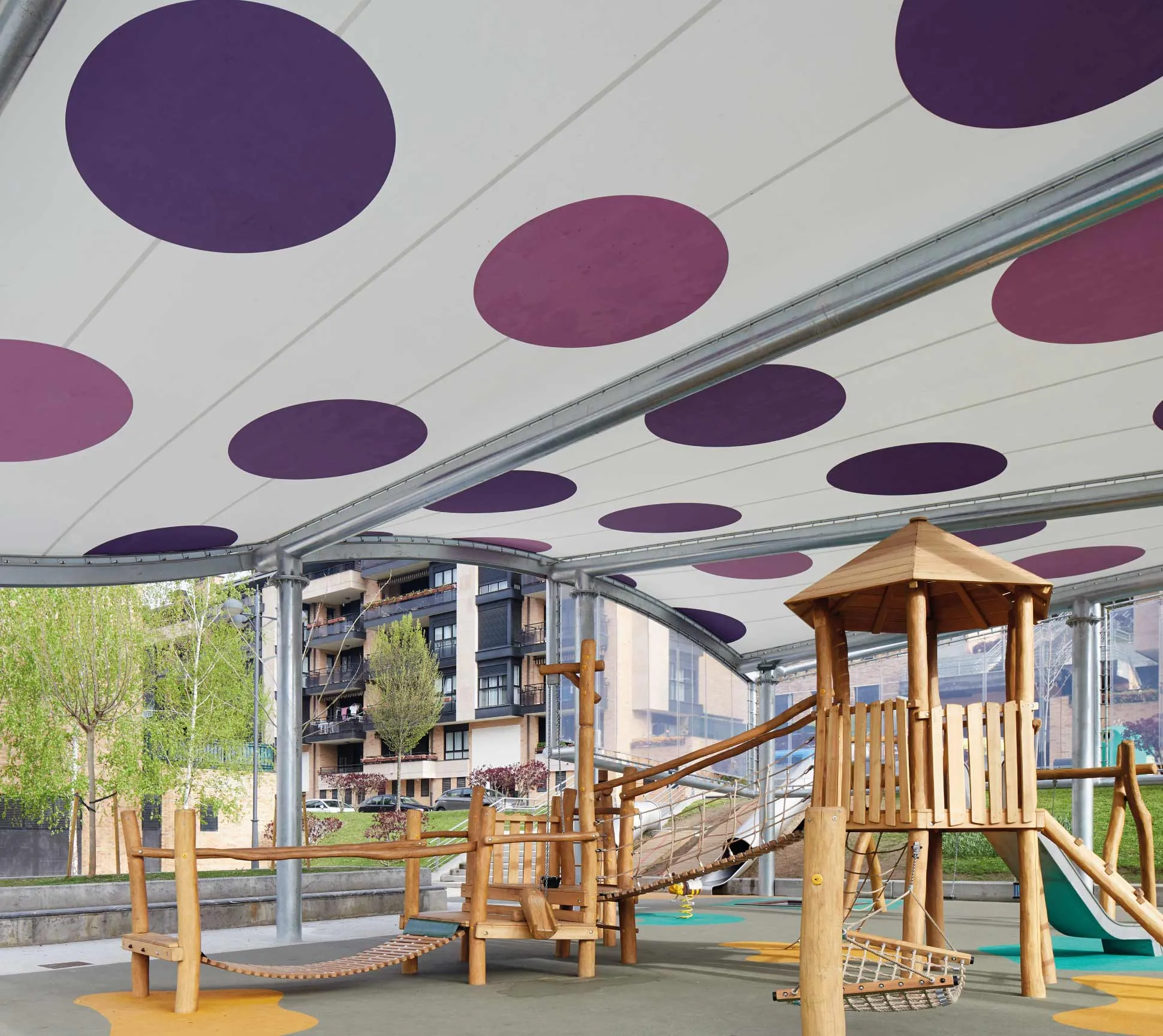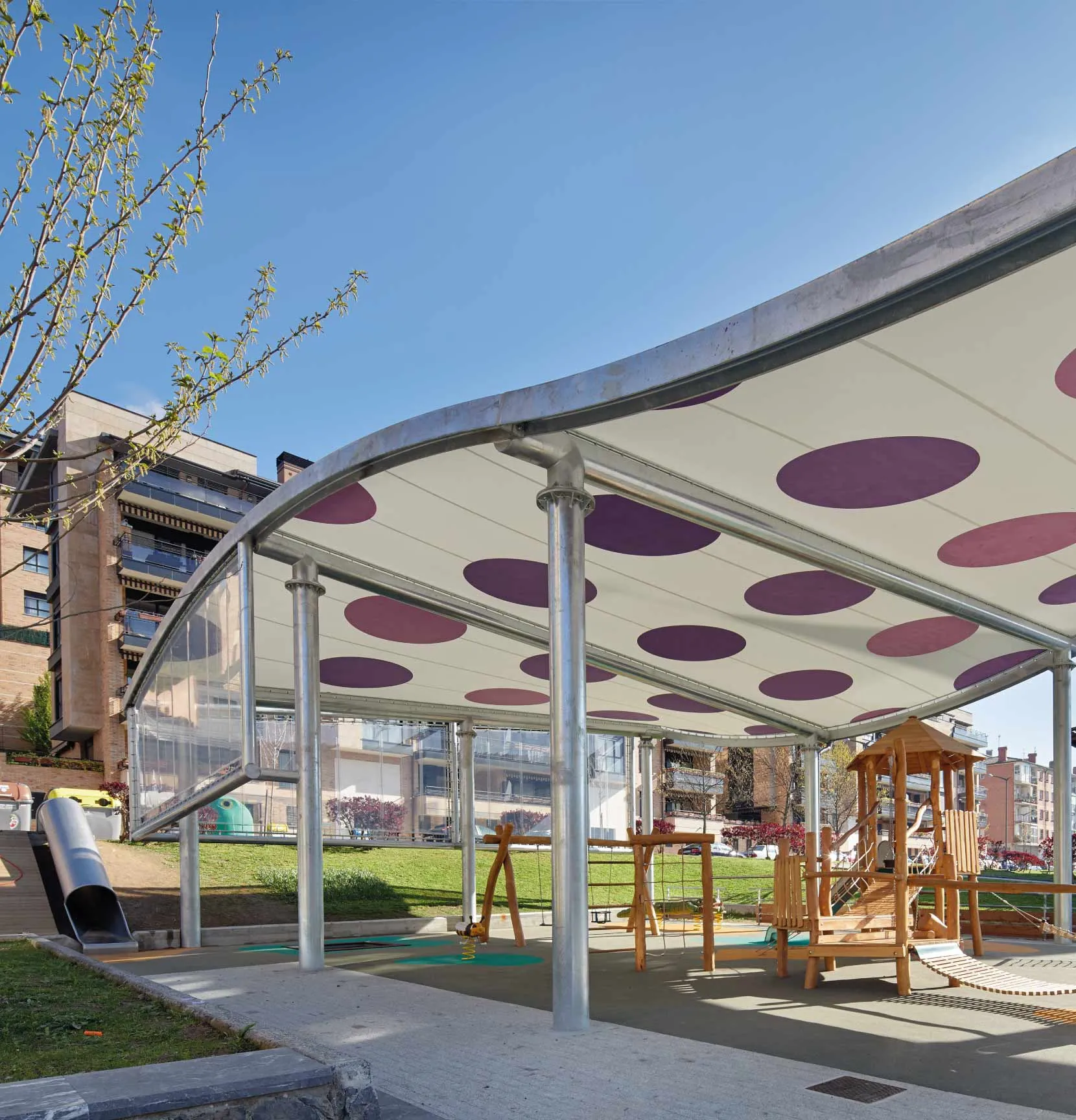 La gran novedad de esta lona tensada es la rotulación por su cara interna de grandes lunares de 2 m (aprox) de diámetro de varios colores, lo que da muestra de la versatilidad y posibilidades que ofrecen este tipo de membranas.