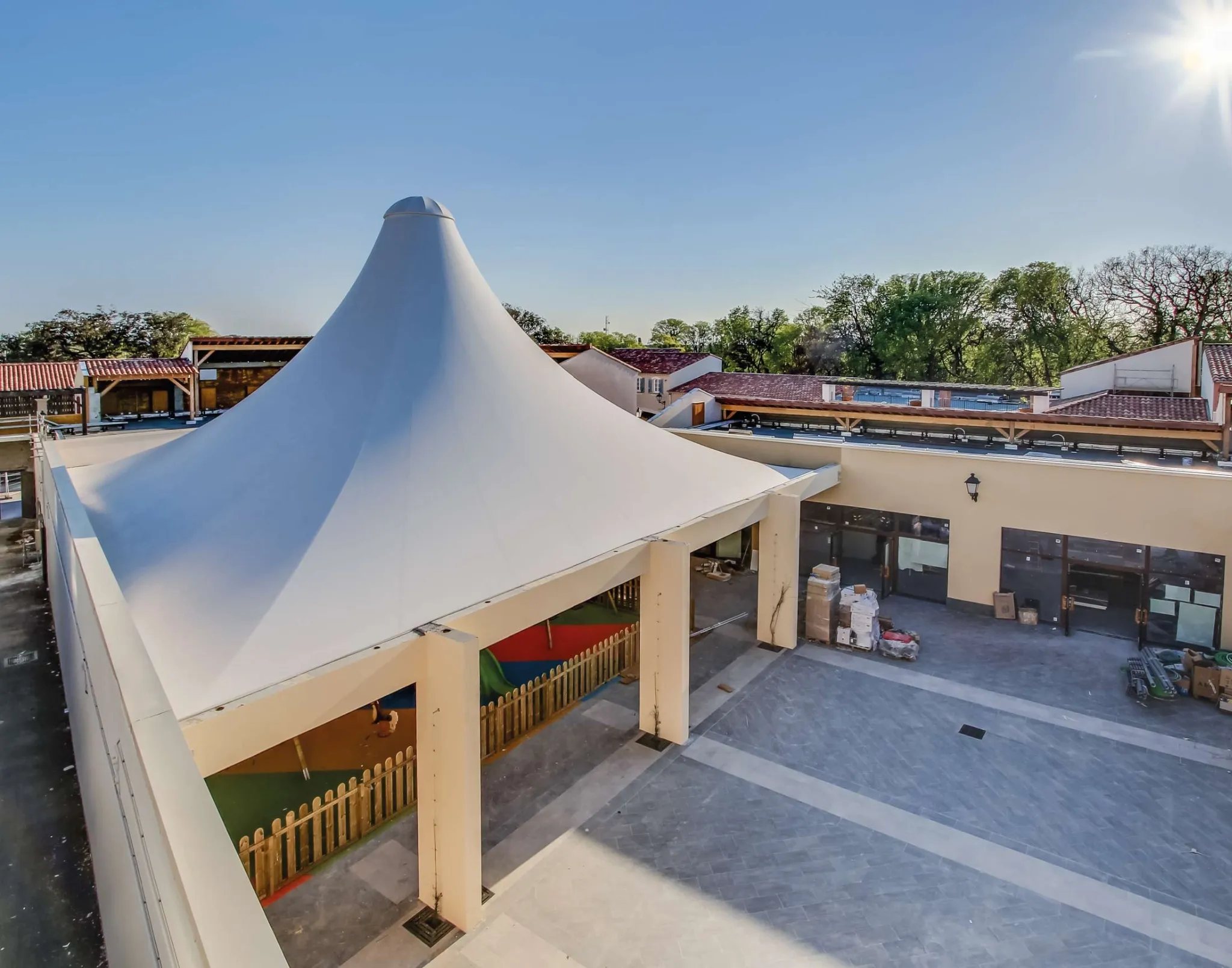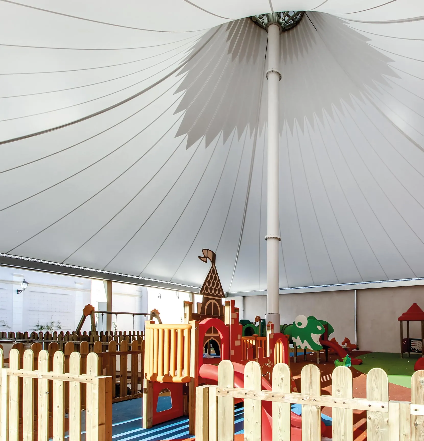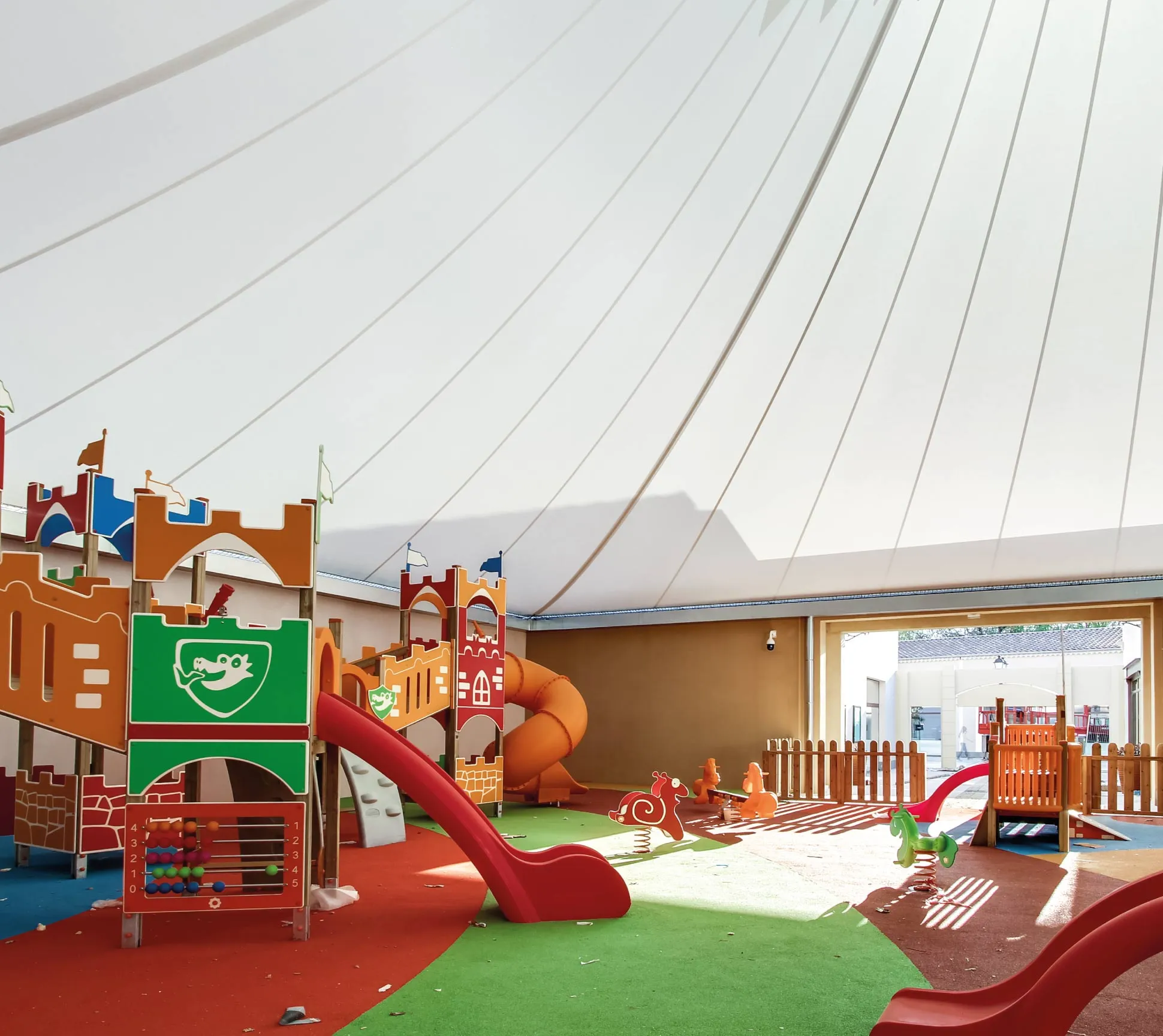 En este entorno con diseño de pueblo provenzal se encuentra una gran carpa de lona tensada de PVC, la cual protege el área de las inclemencias del tiempo cubriendo una superficie de recreo infantil de unos 480m².
