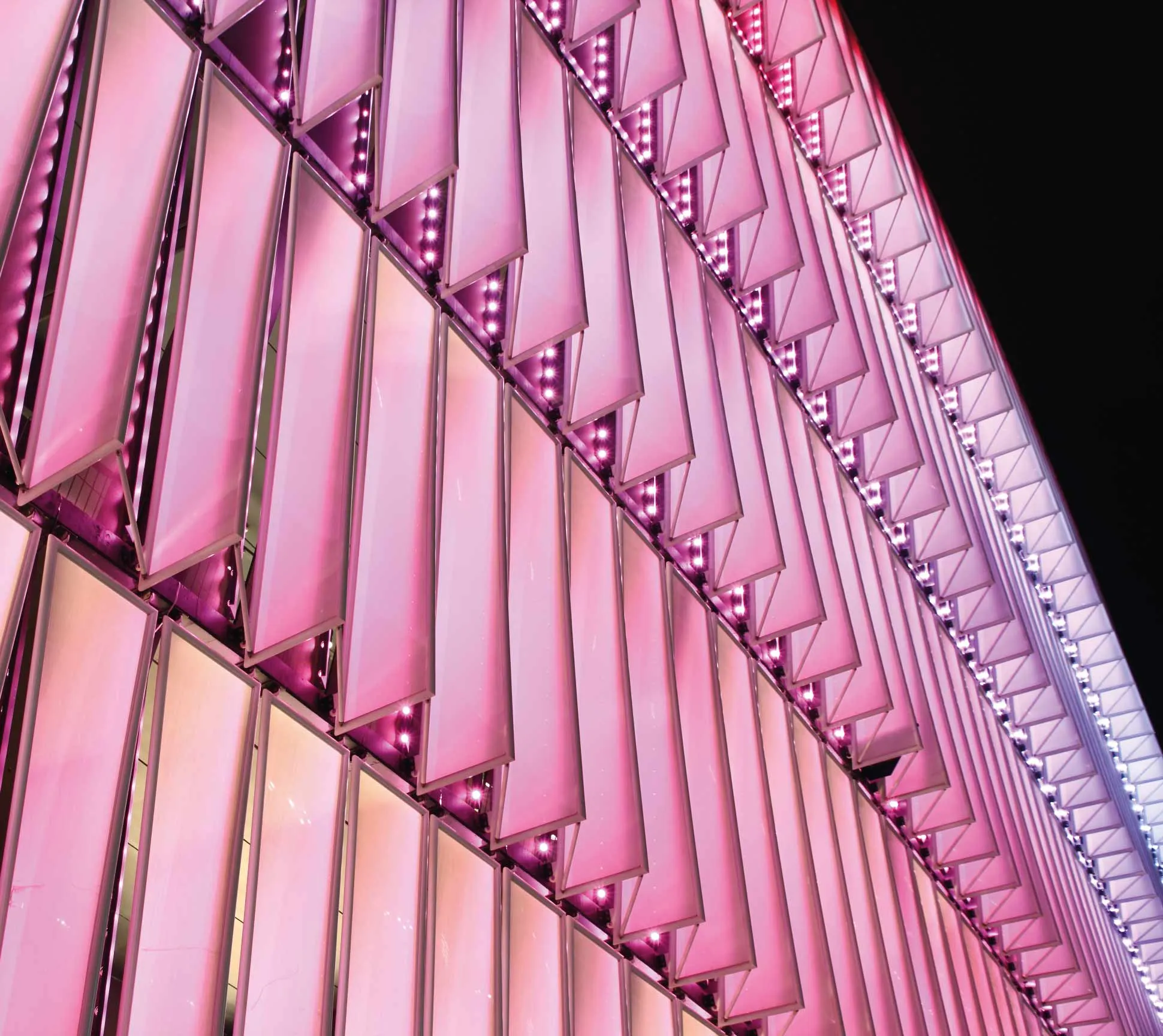 Sous différents angles, le bâtiment révèle un aspect dynamique, obtenu grâce aux lames de 5,40 m sur 1,20 m avec une géométrie à double courbure. La construction du nouveau stade San Mamés a été prévue en deux phases. La façade se compose de plus de 2 700 lames identiques réparties sur 5 niveaux. Chaque élément comporte un cadre métallique construit avec un profilé à section circulaire. IASO a mis au point un système de fixation dissimulé, intégré à l'intérieur du profilé. Le film blanc est parfaitement précontraint. Le résultat est une façade unique, perméable à la vision et permettant une ventilation naturelle du bâtiment.