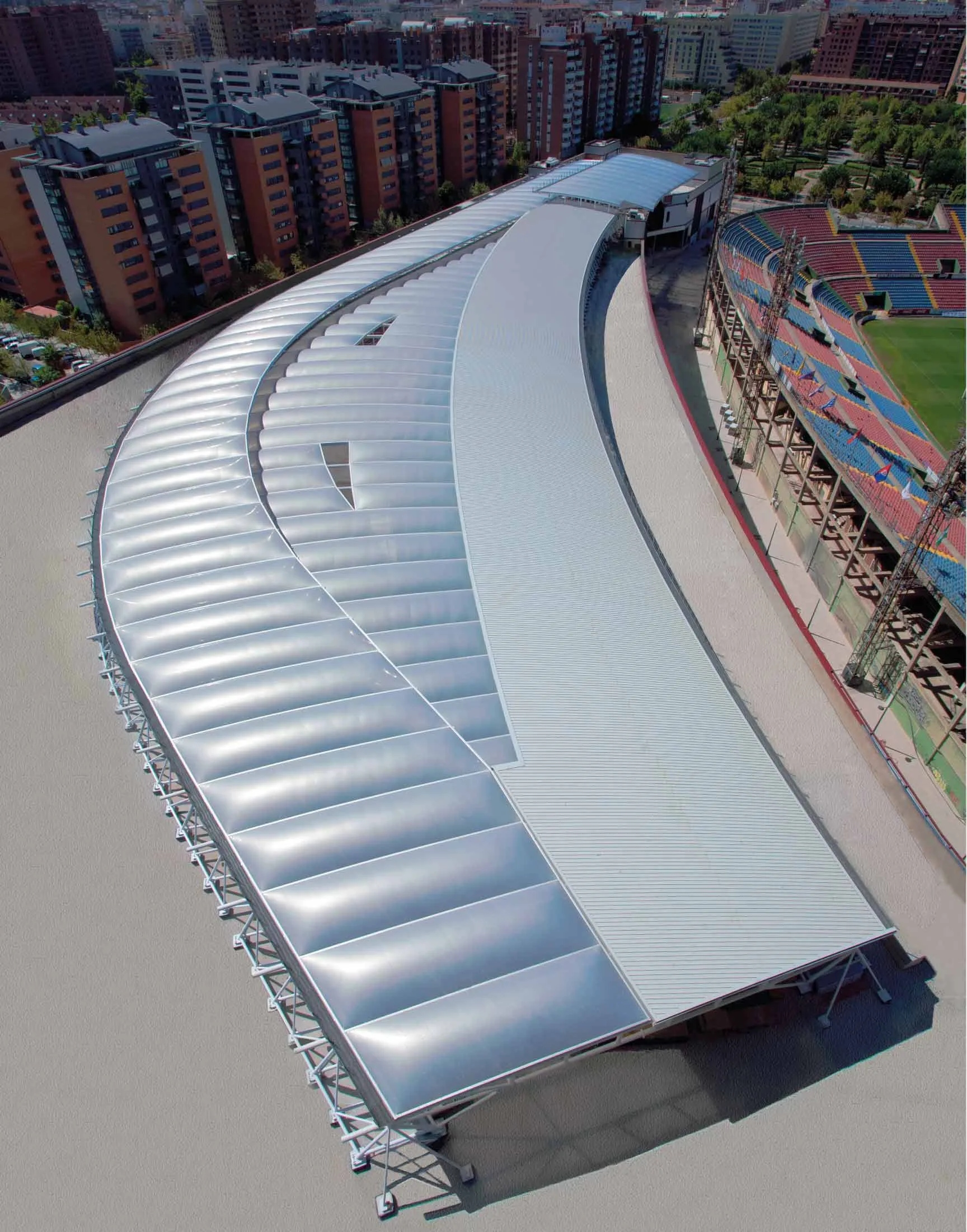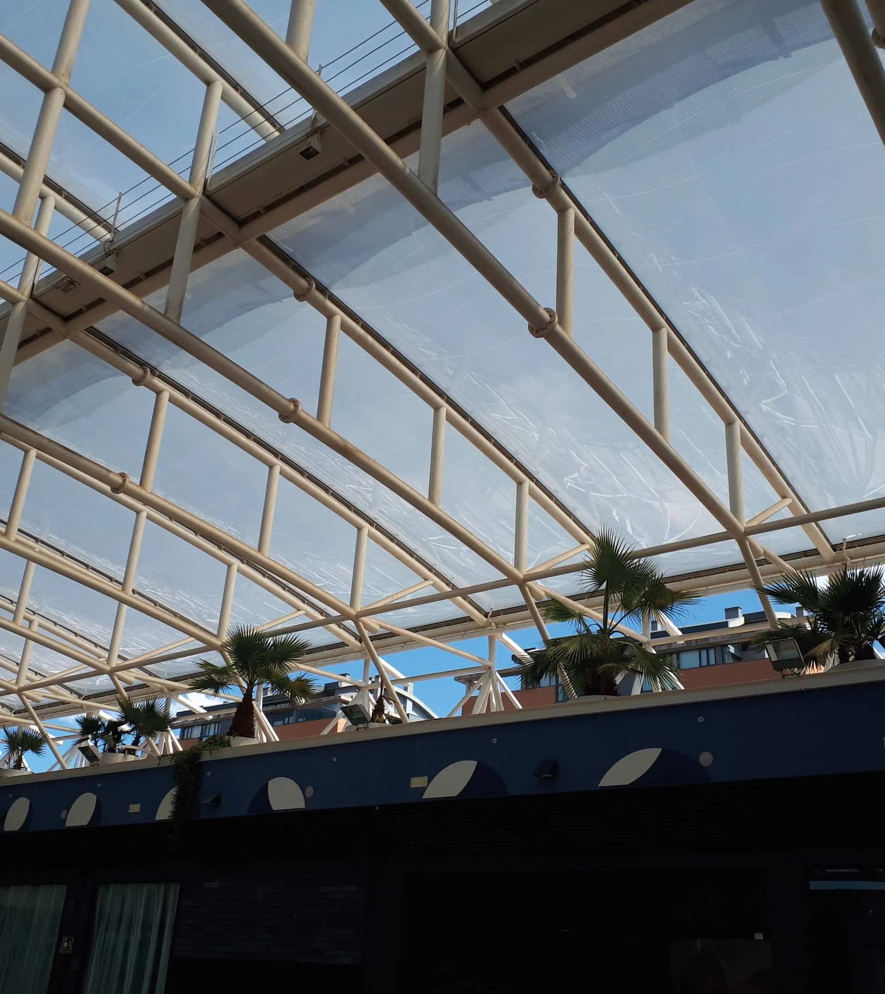 Lorsque nous appliquons ce terme à une couverture en ETFE nous pouvons dire, de façon simple, que cela signifie voir clairement à l’extÉrieur, voir passer les nuages. C’est ce que l’on ressent À l’intérieur de l’Arena Multiespacio. Une grande marquise transparente qui protège les clients et permet la ventilation naturelle de l’enceinte.