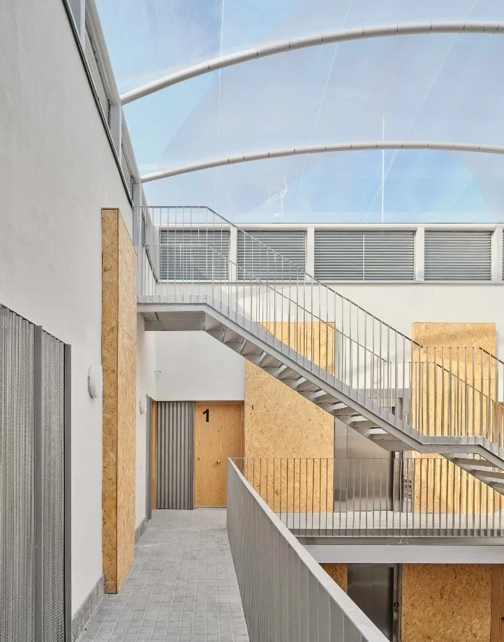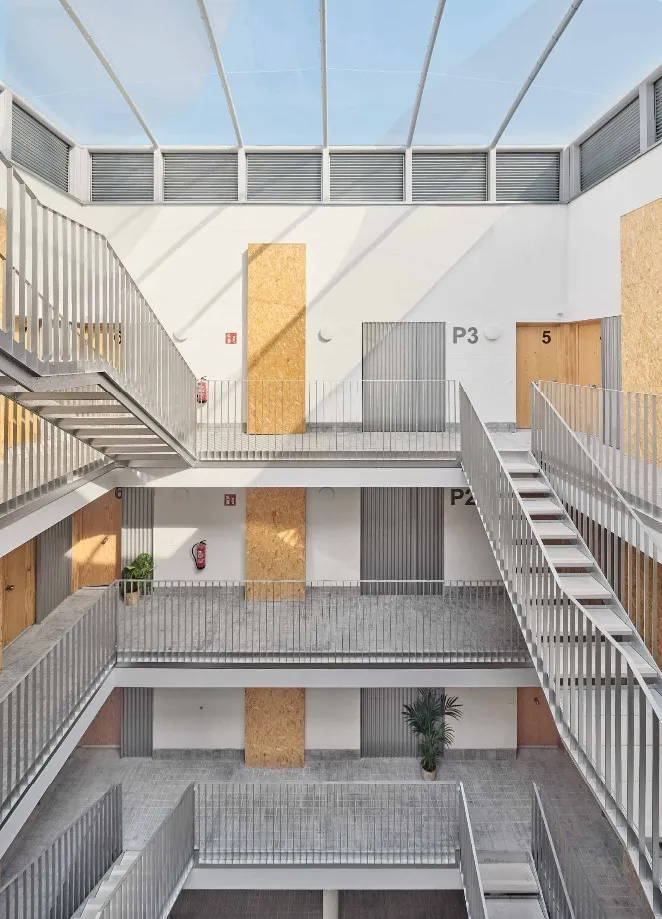 Du point de vue de l’utilisateur, le bénéfice est immédiat : le patio central est protégé des intempéries tout en conservant un éclairage naturel ample et confortable. La couverture contribue à améliorer l’habitabilité du bâtiment, en générant un espace intérieur plus stable et agréable, où la lumière reste protagoniste, désormais avec une présence plus maîtrisée et expressive.