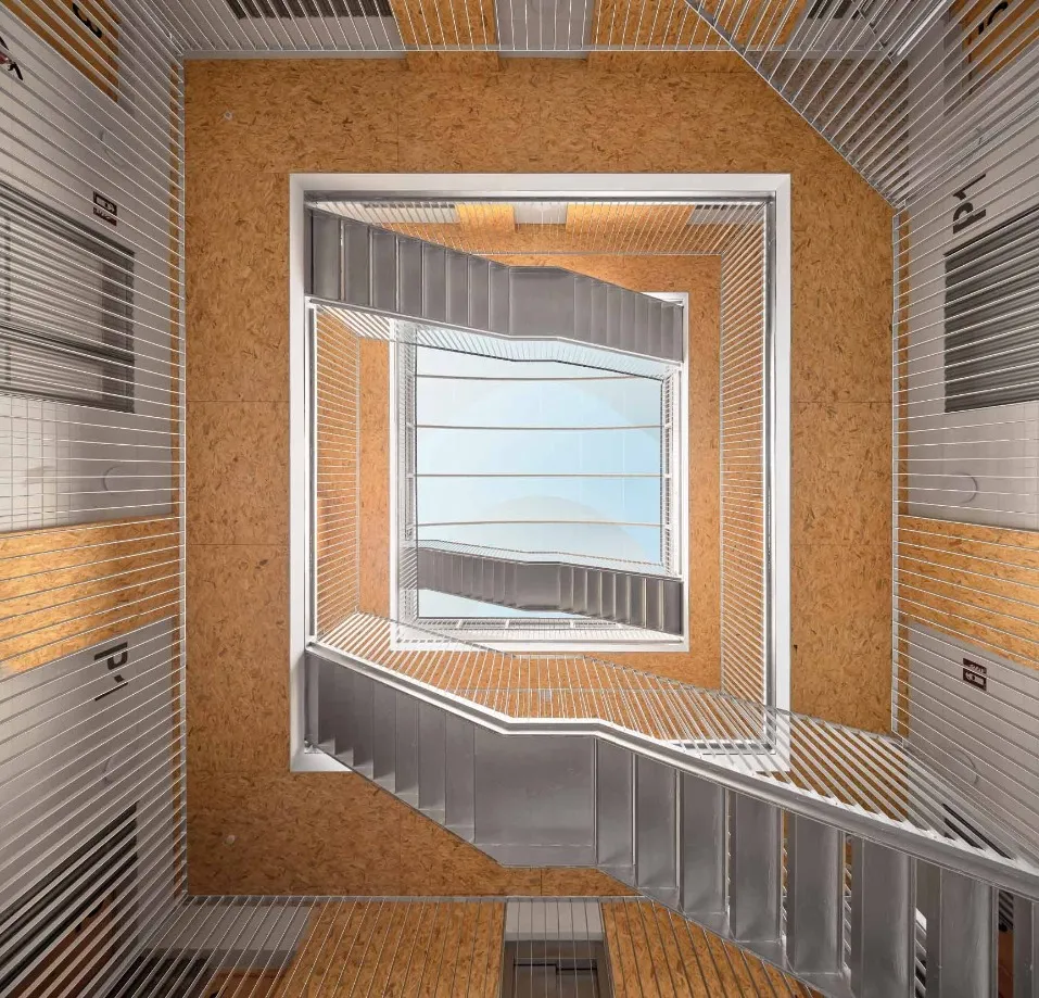Tout au long de la journée, la lumière se transforme sur les murs et les passerelles, générant une atmosphère changeante qui accompagne la vie quotidienne du bâtiment. L’intervention n’interrompt ni la clarté ni la continuité visuelle ; elle les organise avec discrétion, apportant une dimension plus soignée et contemporaine à l’ensemble.