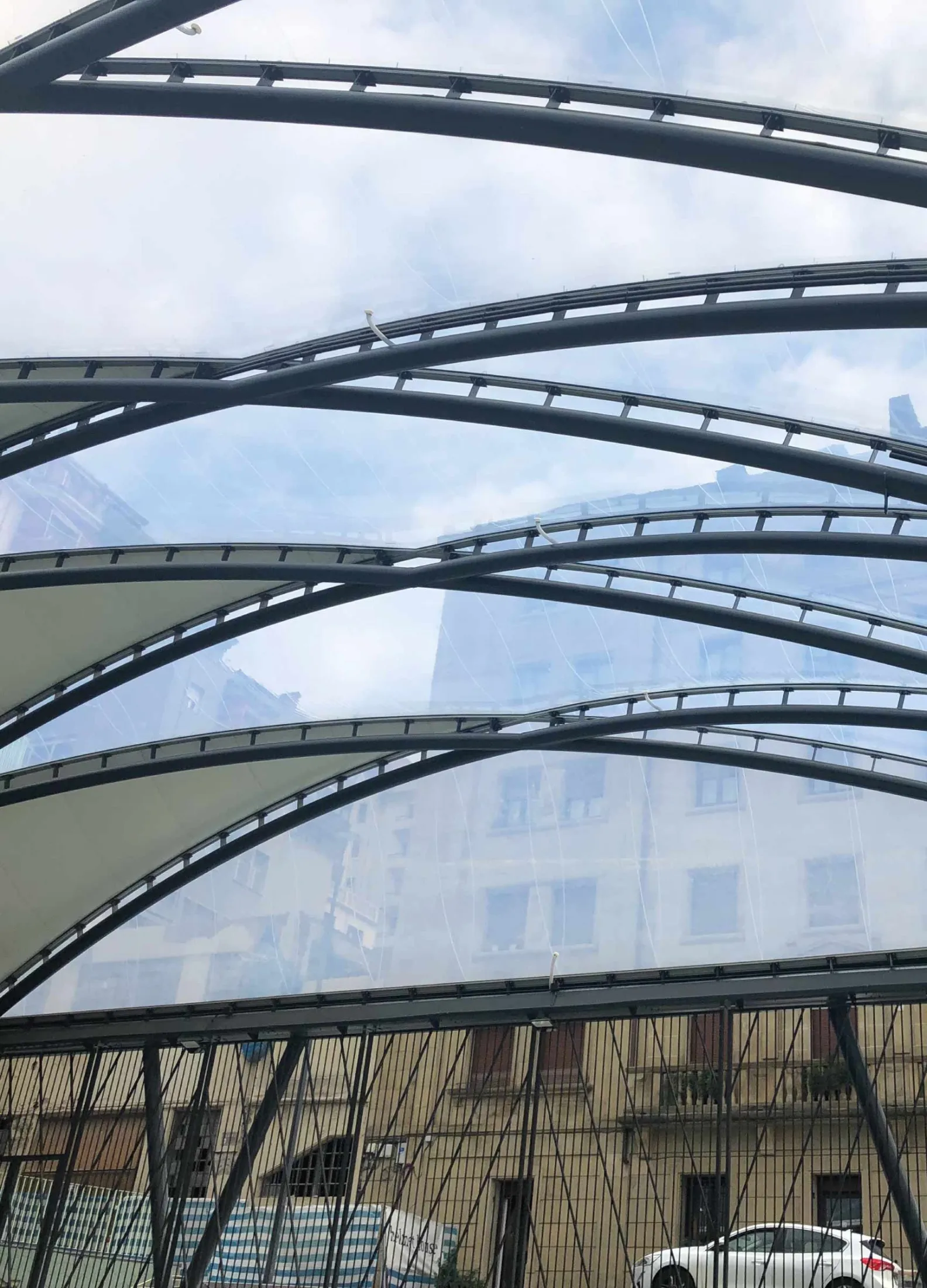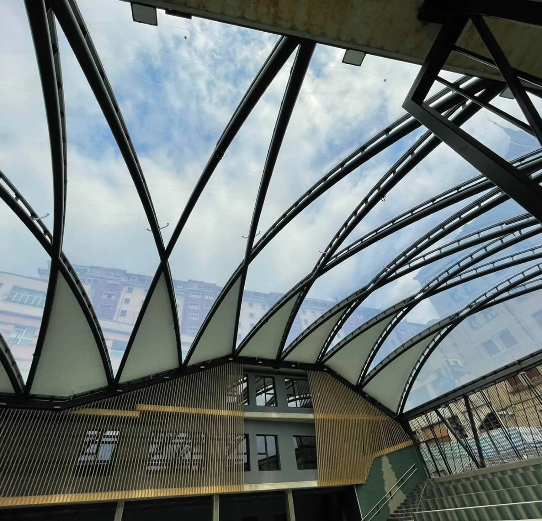 La couverture est composée de 31 coussins à deux couches (15 en ETFE et 16 en PVC) avec des géométries triangulaires et rhomboïdales qui suivent la modulation de la structure métallique avec un plan trapézoïdal et des dimensions totales de 37mx20m et une hauteur maximale de 4,5m.