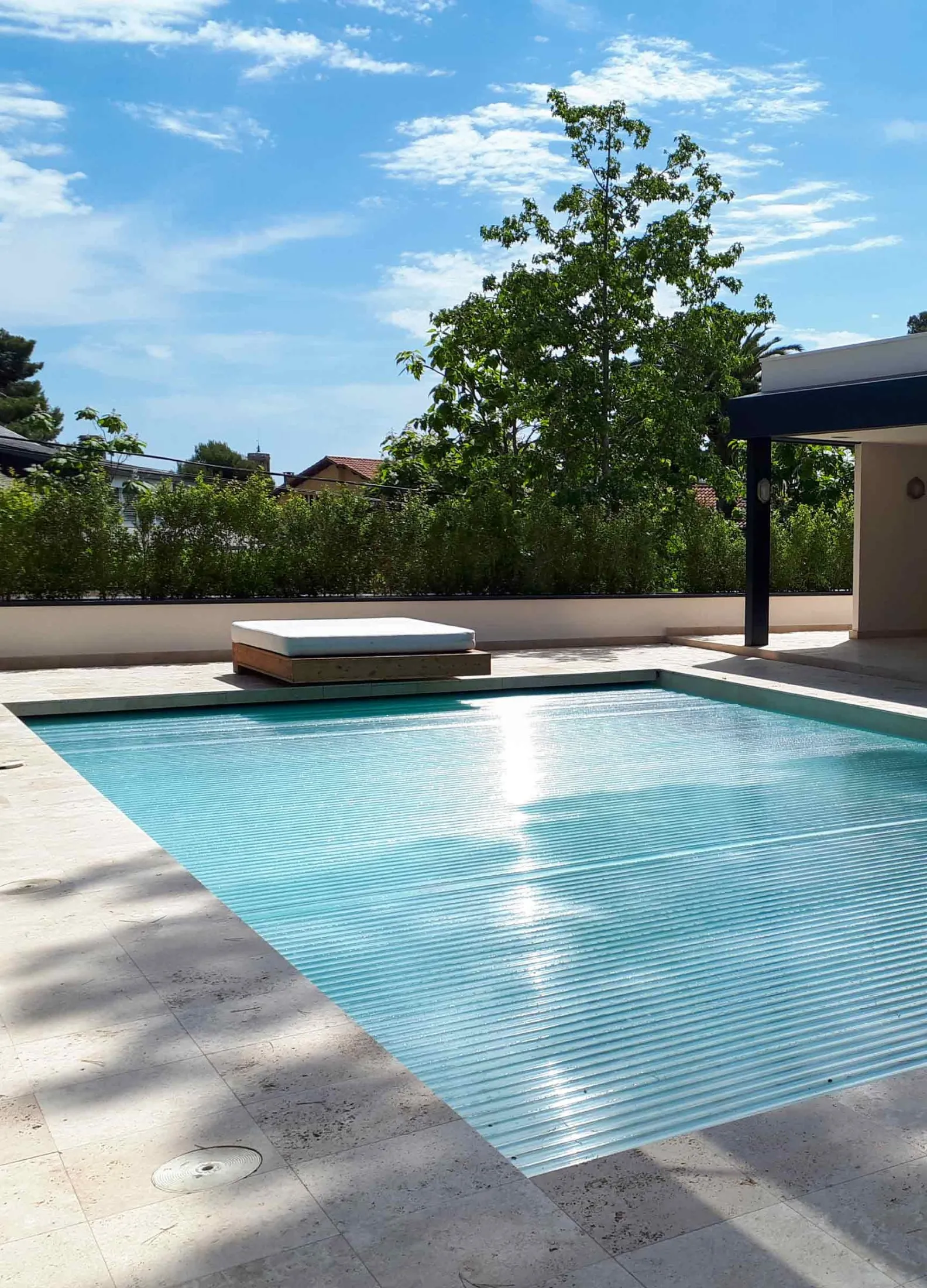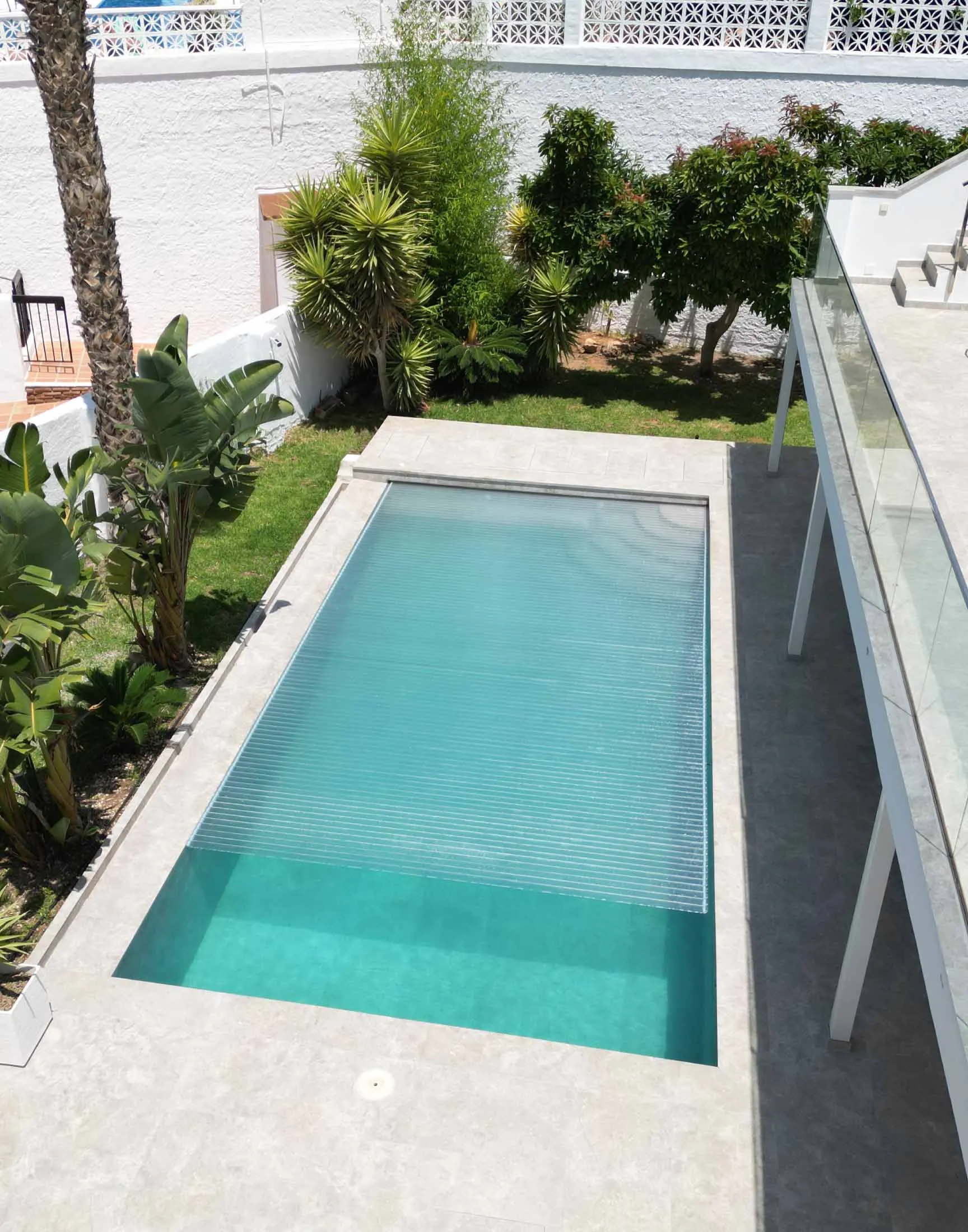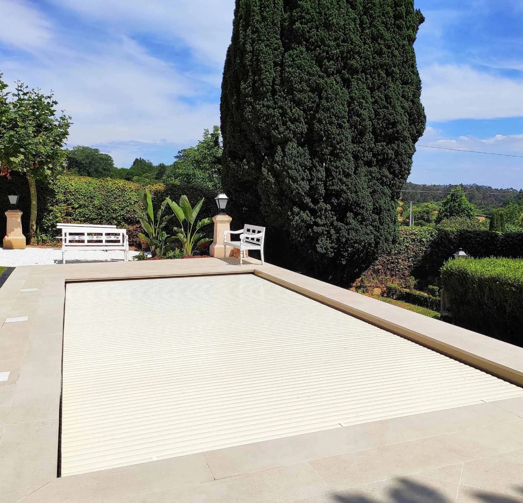 Loft-L combina proteção, estética e funcionalidade com um enrolador submerso coberto por uma tarima ao nível do solo, transformando a sua piscina num espaço único.