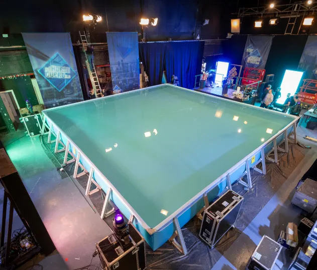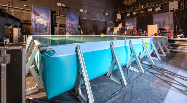 Optámos por uma estrutura modular desmontável com liner específico para garantir estanqueidade e resistência. As nossas prioridades foram três: rapidez sem comprometer a qualidade, estabilidade do conjunto e integração limpa no espaço de filmagem.