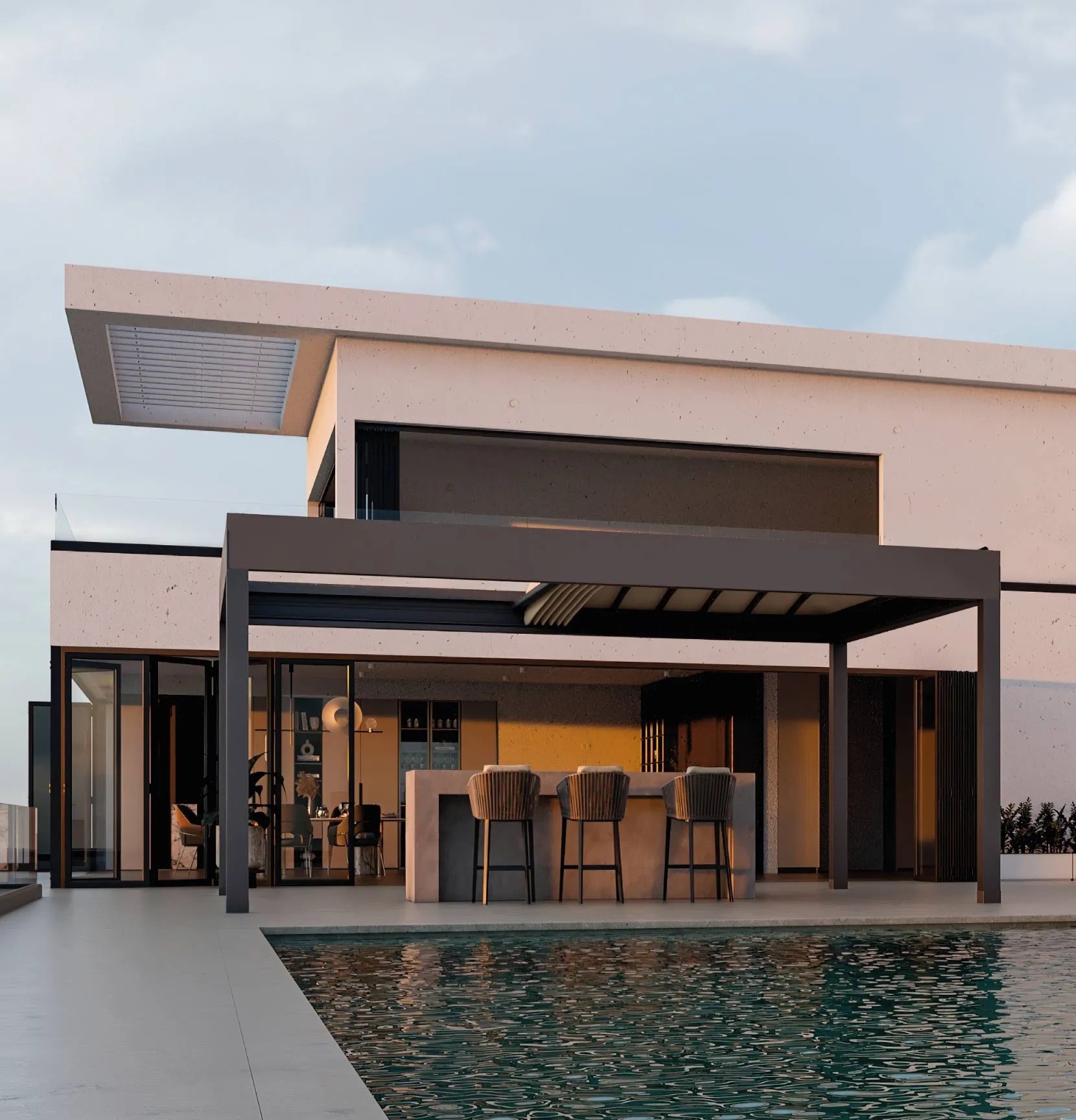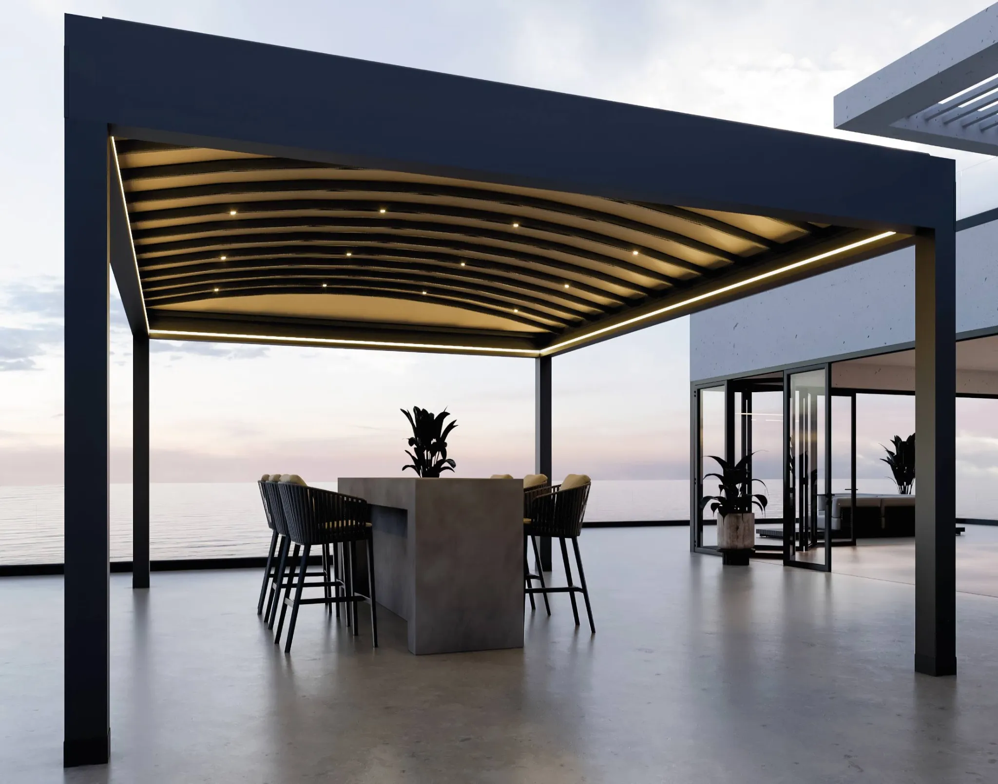Pergostar Horizontal destaca-se pelo seu design minimalista e palilleria curva, que contrasta com as linhas retas da sua estrutura. A sua lona perfeitamente ajustada oferece um acabamento limpo e refinado, ideal para projetos que buscam combinar funcionalidade com sofisticação. Com um sistema completo de iluminação e materiais de alta qualidade, esta pérgola transforma qualquer espaço exterior num local único e elegante.