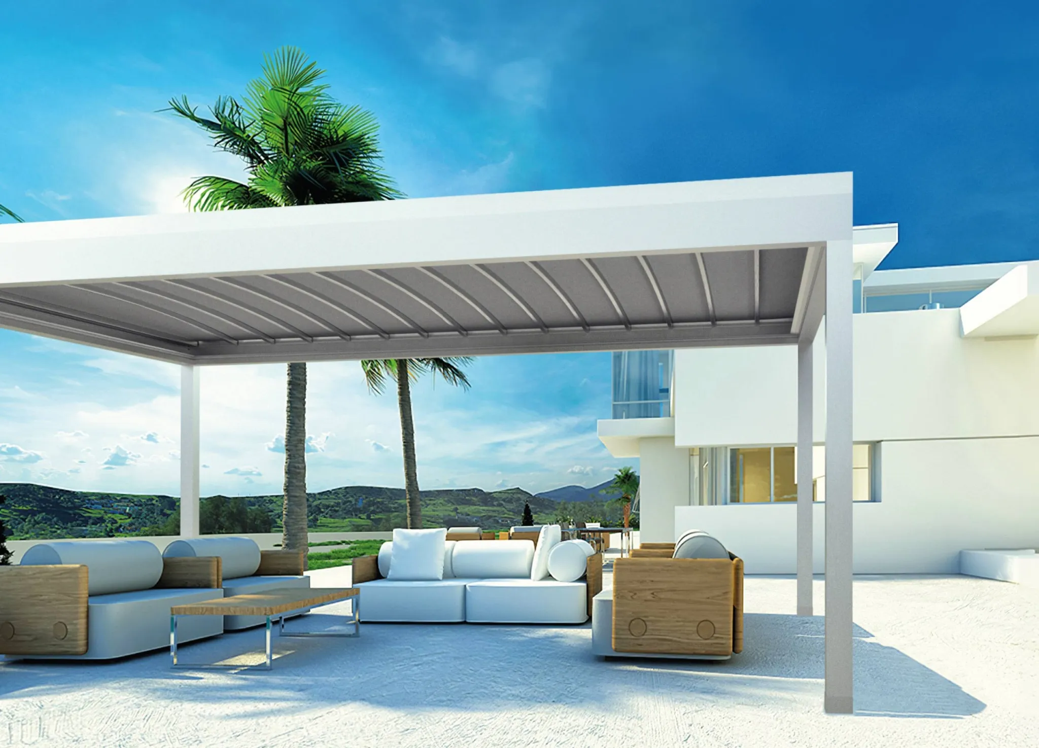 Pergostar Horizontal é minimalista e elegante. Combina a estética das pérgolas bioclimáticas com uma sofisticada palilleria curva e lona para um acabamento impecável.