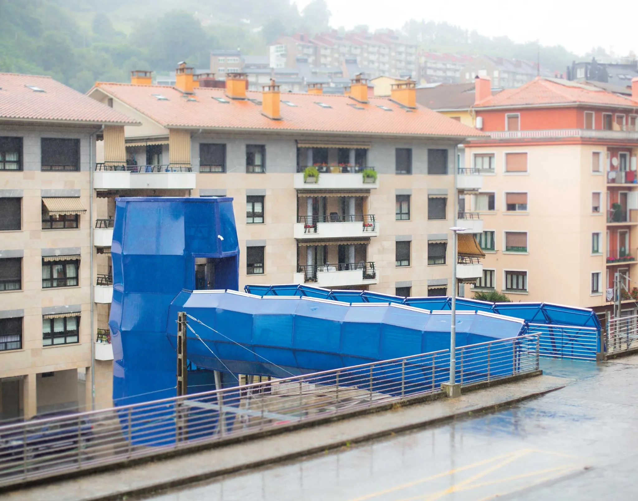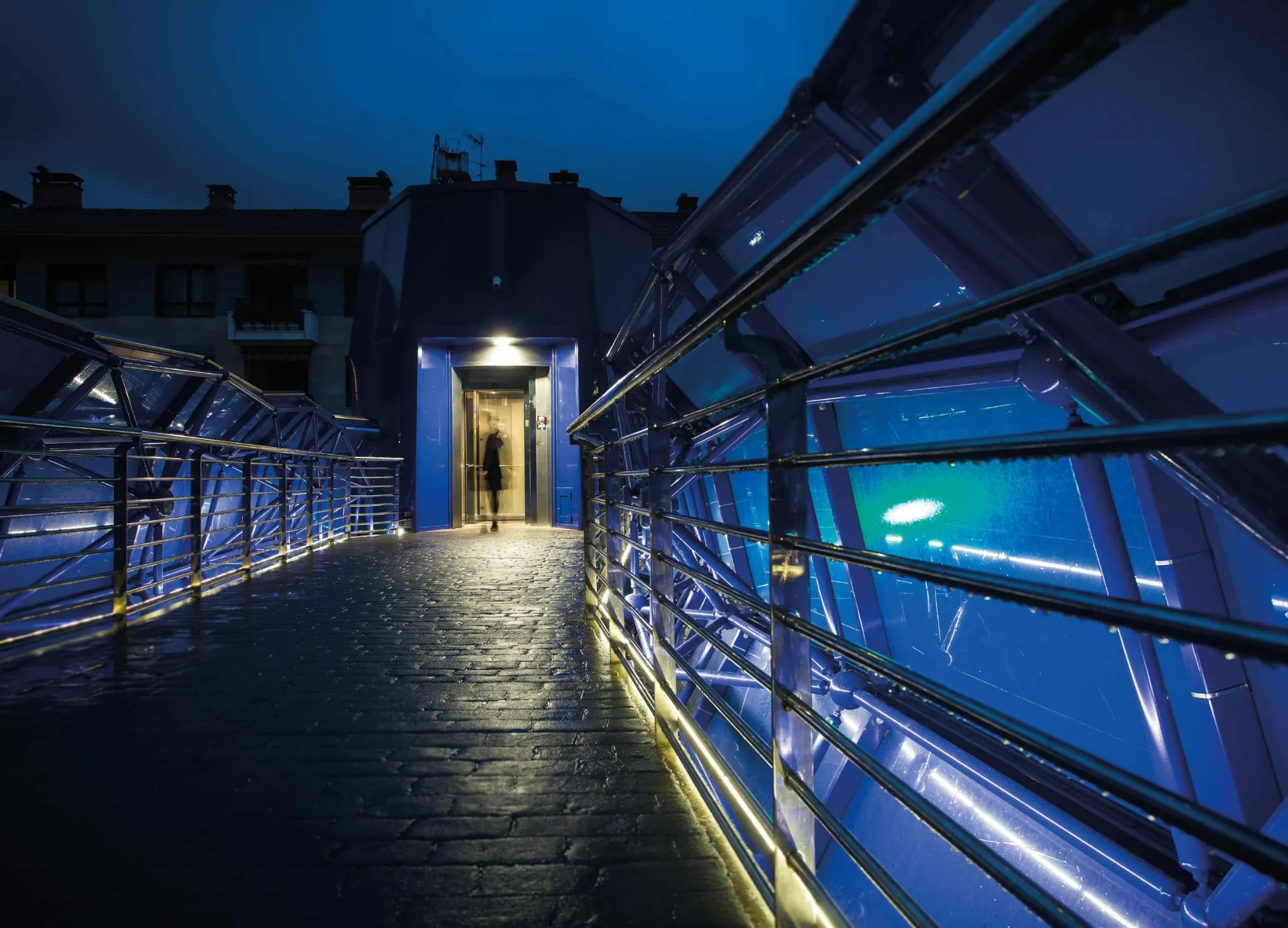 A membrana de ETFE na cor azul possui dimensões de 15 m de comprimento x 3 m de largura na área da passarela e aproximadamente 9 m de altura x 5 m de diâmetro na área do elevador, com uma superfície aproximada de 50 m² e 140 m², respectivamente.