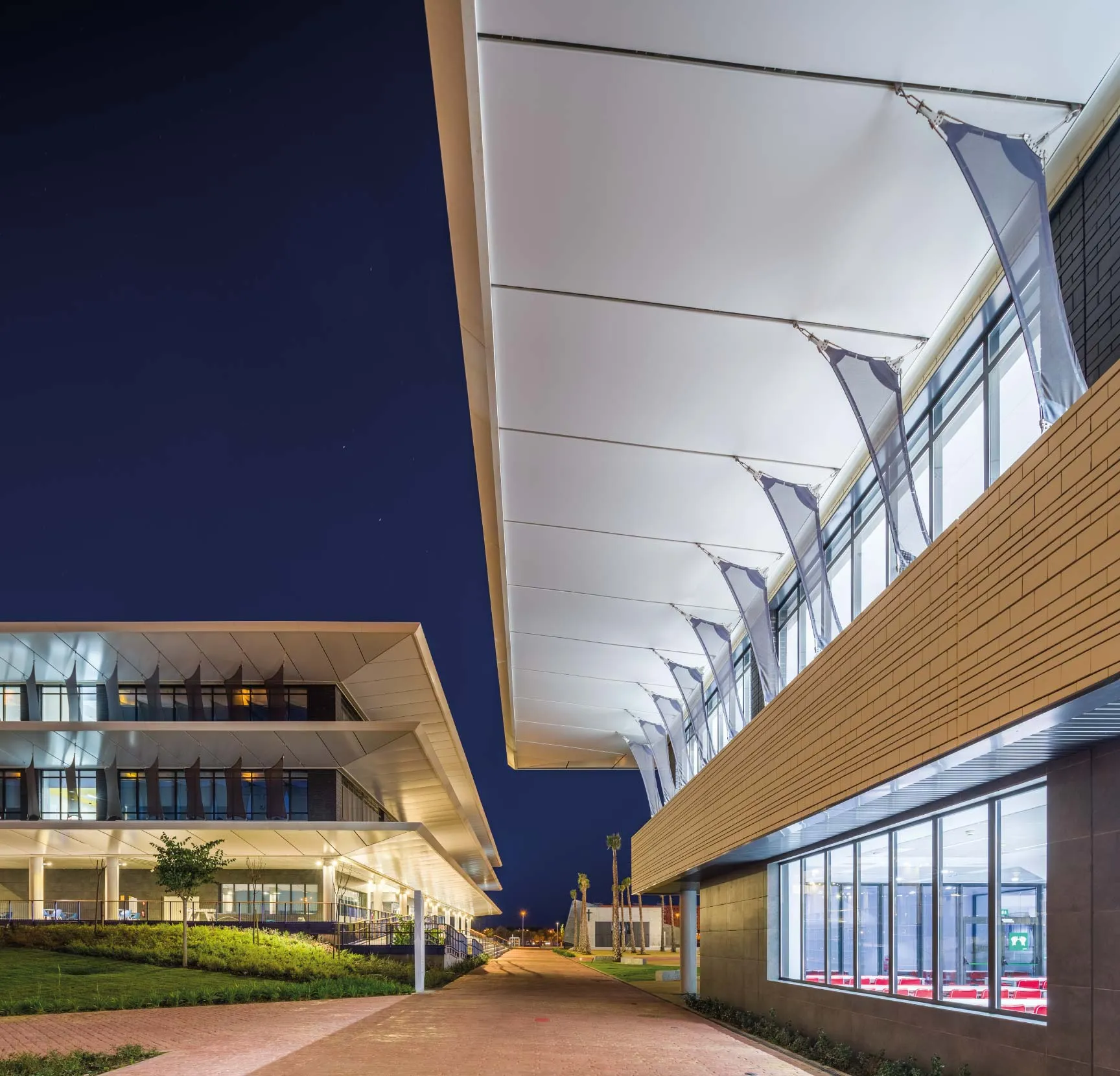 A envolvente têxtil é formada por painéis i-tensing e velas tensionadas, cobrindo uma superfície de 7500 m² e 1145 m², respetivamente. Com o objetivo de proporcionar proteção solar às salas, as velas tensionadas são orientadas de forma diferente segundo cada fachada. Em contrapartida, com os painéis i-tensing situados no teto falso, procura-se um acabamento estético de linhas retas que cubra as ferragens das velas, bem como as do painel.