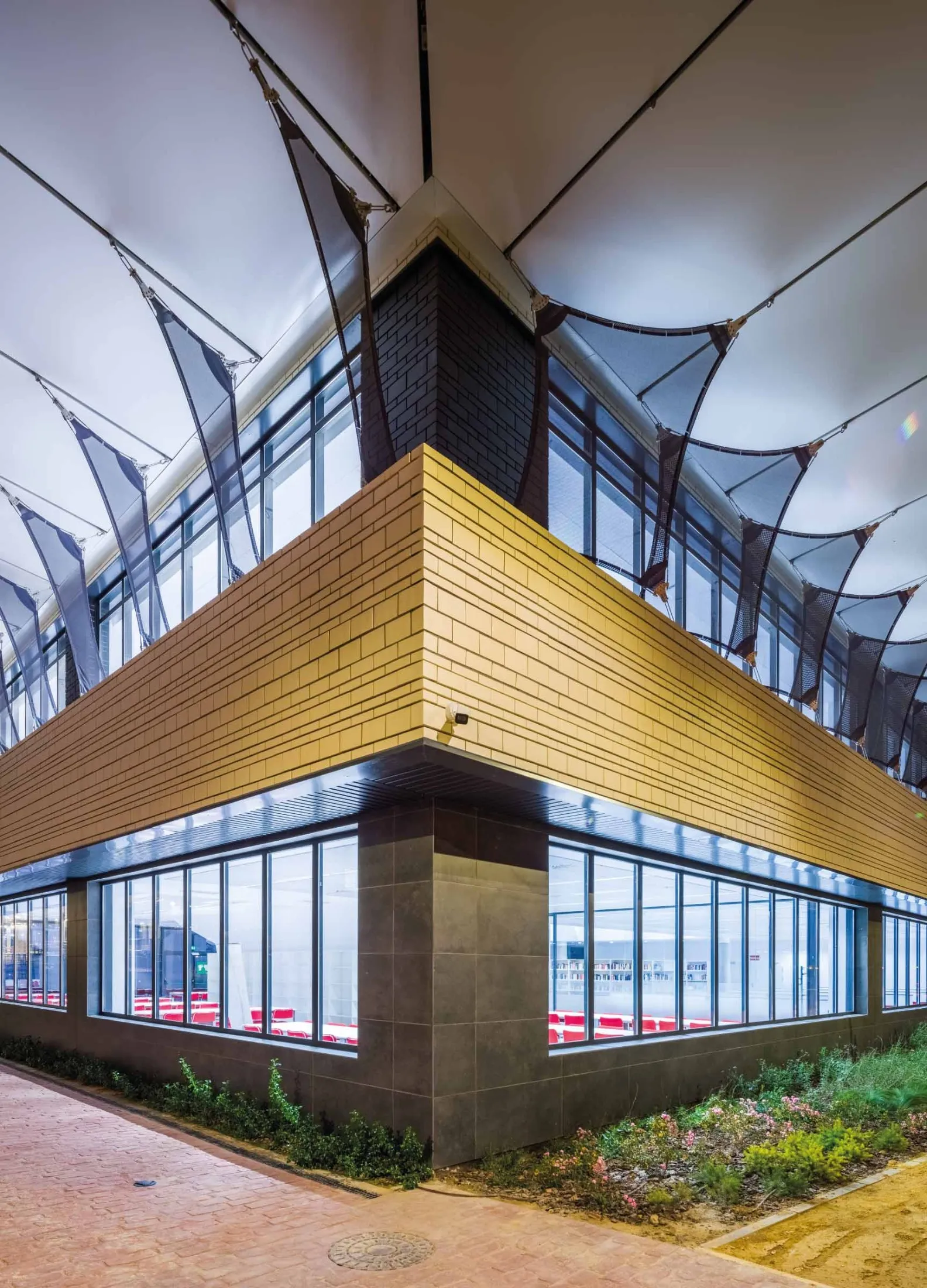 Os painéis têxteis situados no teto falso, sistema I-TENSING de IASO, com a particularidade de aplicação na posição semi-horizontal, estão formados por um bastidor de alumínio sobre o qual é tensionada a membrana. É utilizada a membrana Flexlight Perform 502 S2, em branco translúcido de um único padrão, evitando soldaduras vistas em todo o projeto. O bastidor é fixado através de ganchos de ancoragem na parte posterior, deixando visível apenas a membrana. Para a sua fixação, é concedido um espaço de apenas 5cm entre painéis, no qual são intercalados os ganchos dos painéis contíguos. Estes ganchos são fixados a um carril tipo Halfen que faz parte da subestrutura de ancoragem. Quanto à geometria, são estabelecidos eixos de fixação perpendiculares à fachada a cada 2m, deixando uma largura de painel de 1,95m. O comprimento do painel, em posição inclinada, cobre toda a parede dupla, sendo de 4,6m, deixando os extremos para remates de chapa posteriores.