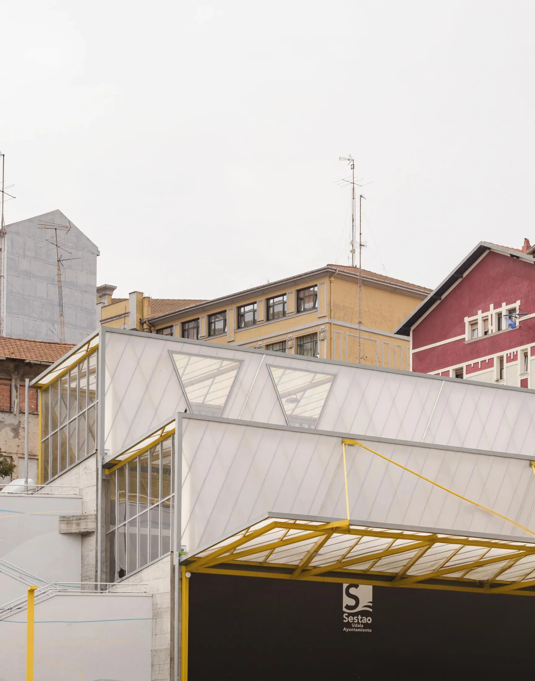 A estrutura metálica é envolvida por uma cobertura e fachadas perimetrais de policarbonato translúcido, que protegem o espaço desportivo das intempéries.