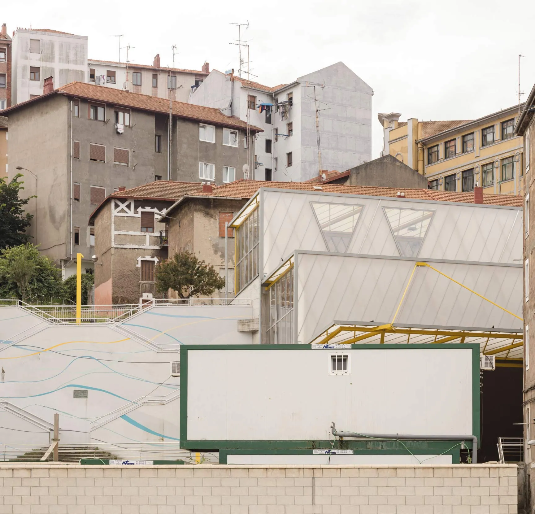 O objetivo desta intervenção é a criação de um espaço coberto no campo de pelota da Plaza del Sol, em Sestao, Euskadi.