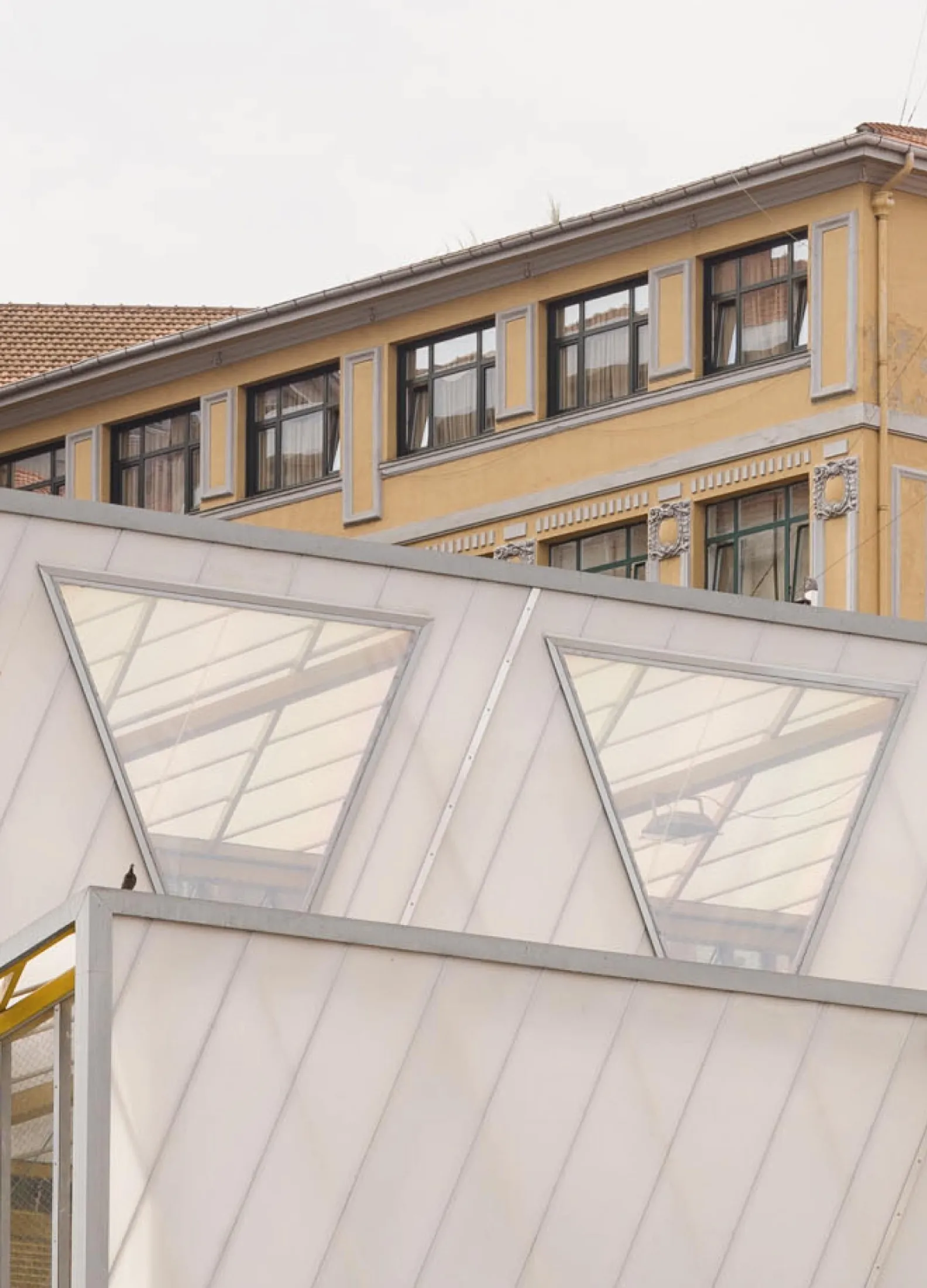 Para garantir uma iluminação correta, são abertas 2 clarabóias verticais em forma de triângulo invertido na fachada principal, onde serão fixadas 2 estruturas metálicas idênticas de membrana ETFE de camada única.